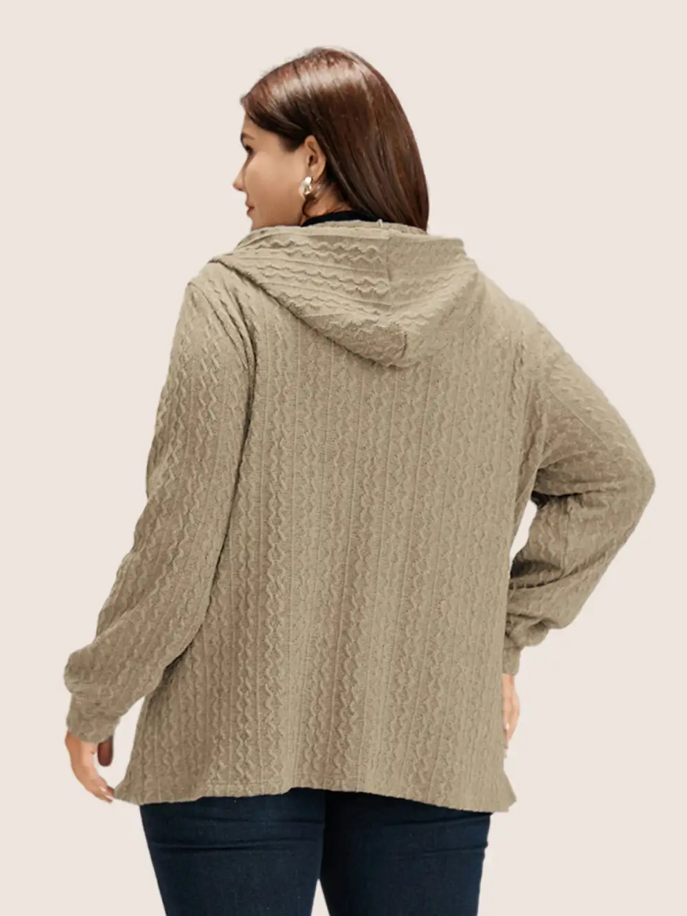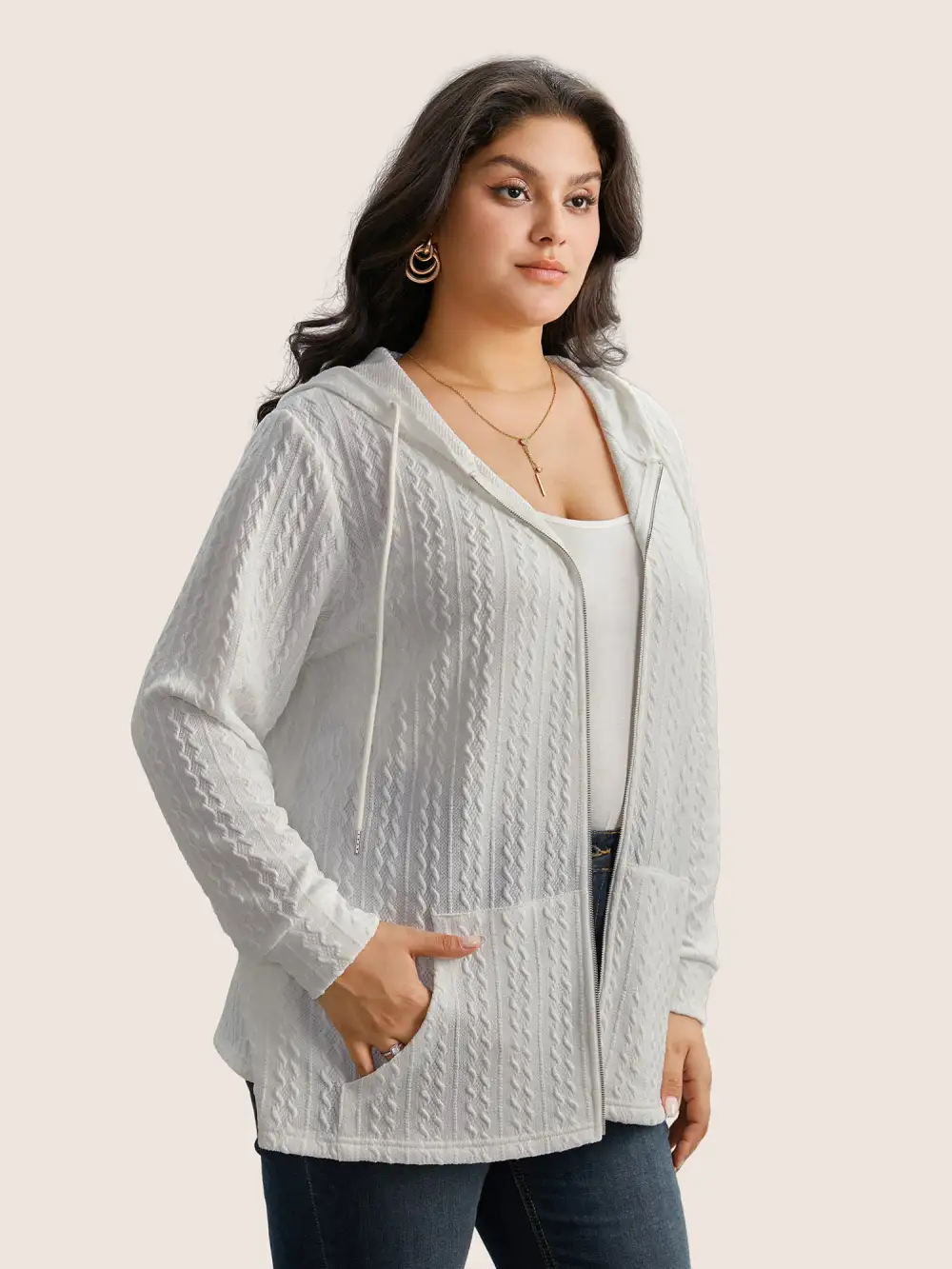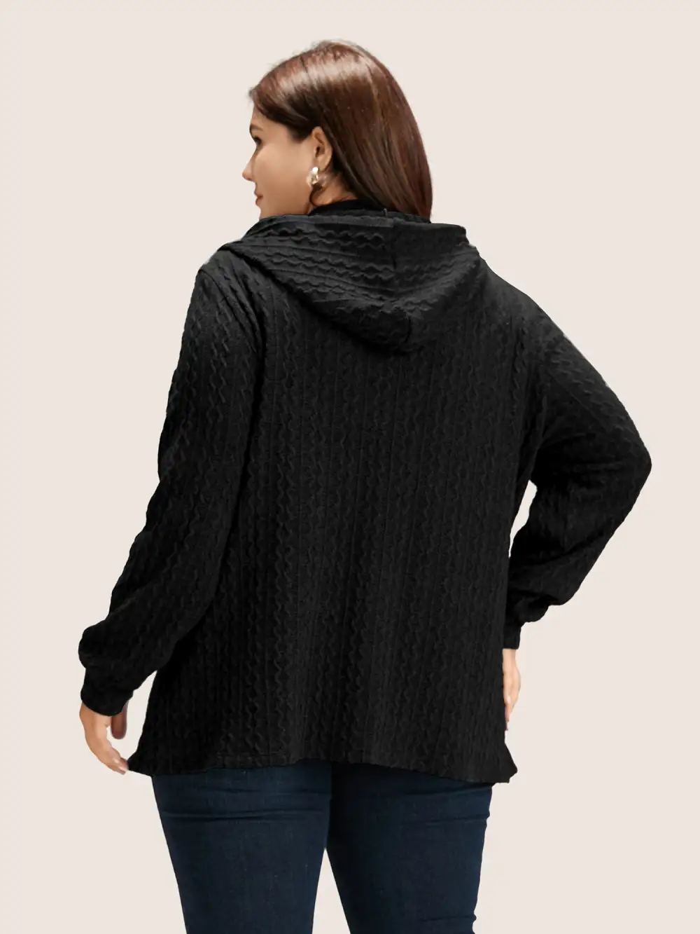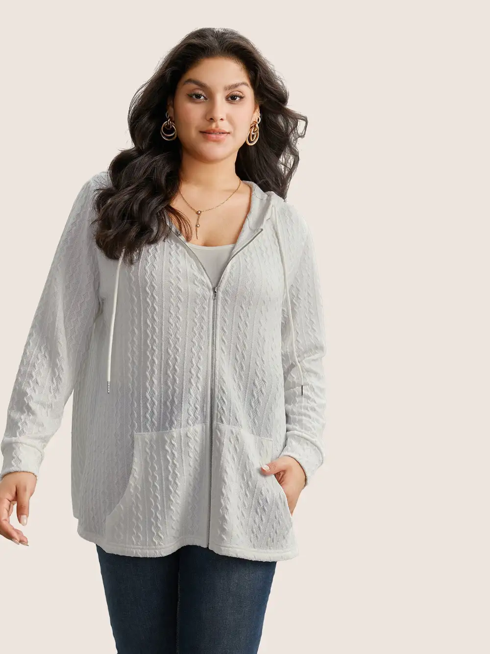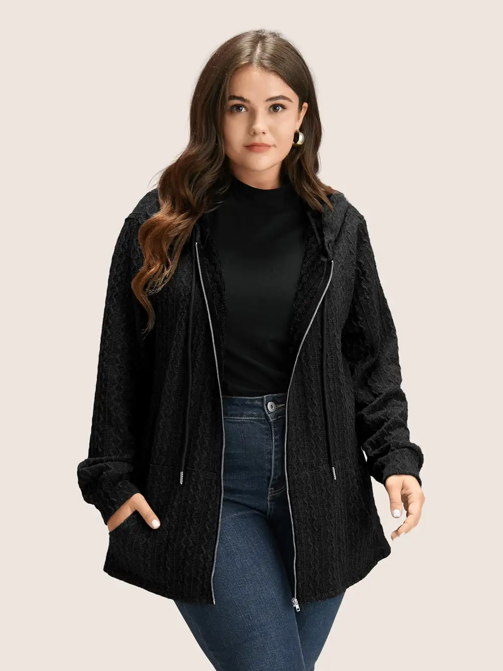 Plain Textured Zipper Hooded Sweatshirt