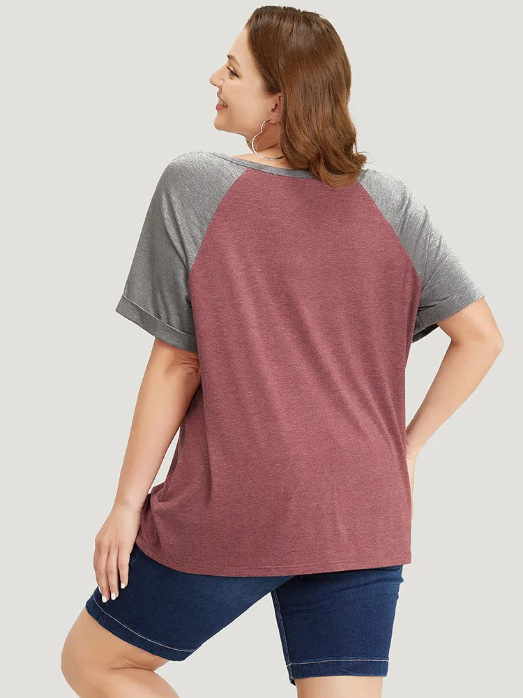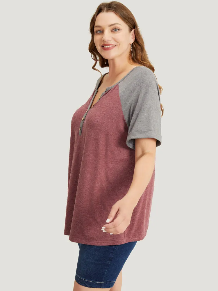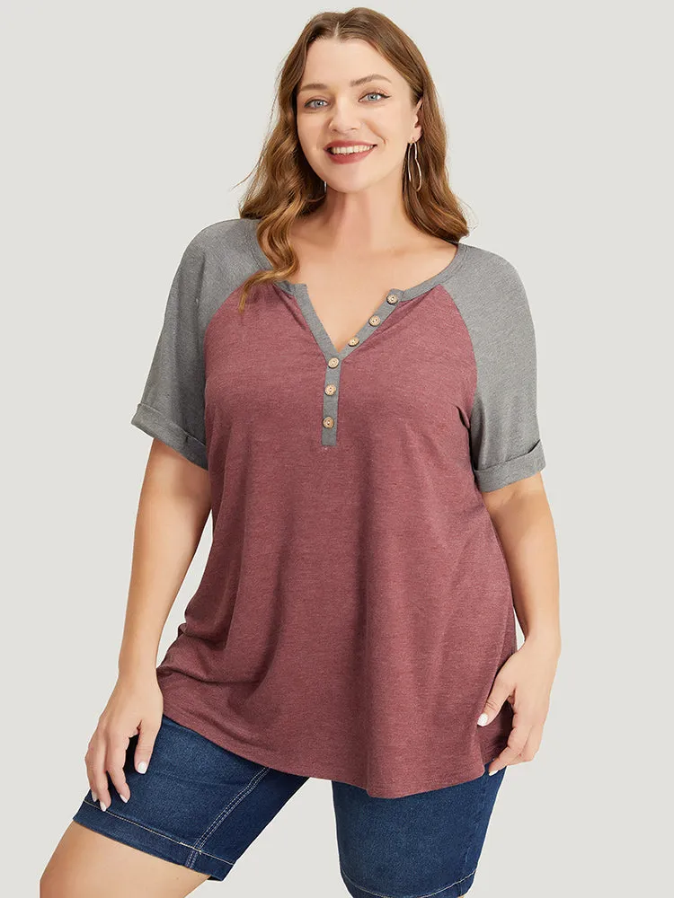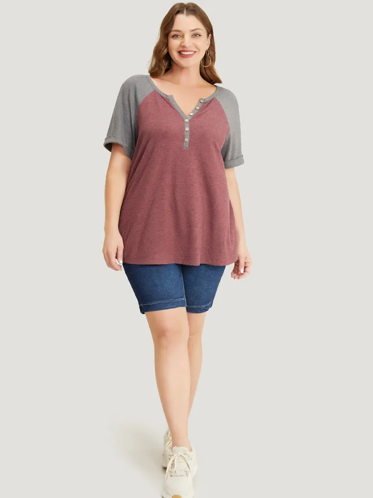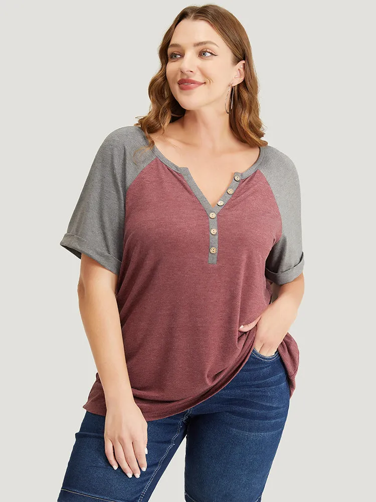 Colorblock Contrast Roll Raglan Sleeve Button Detail Notched T-shirt