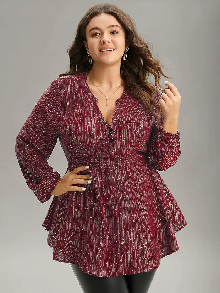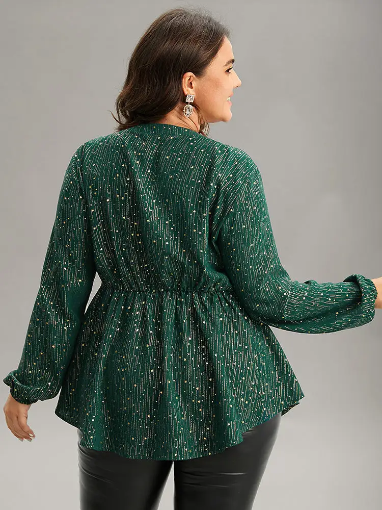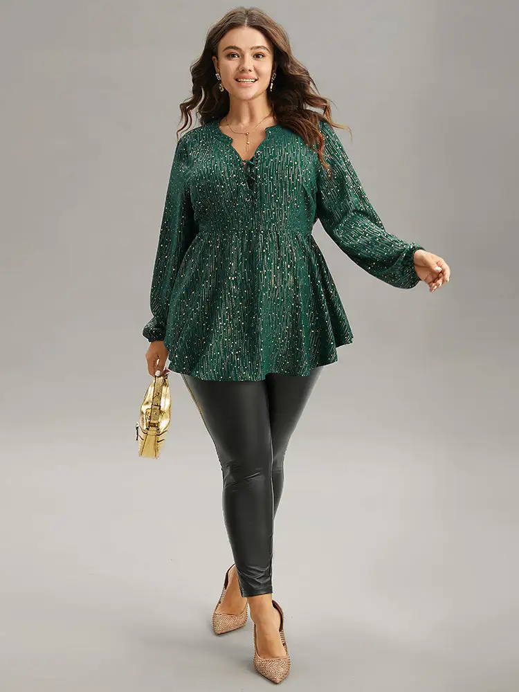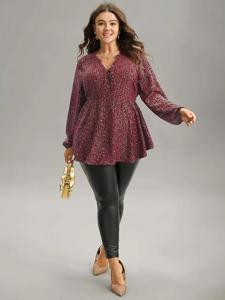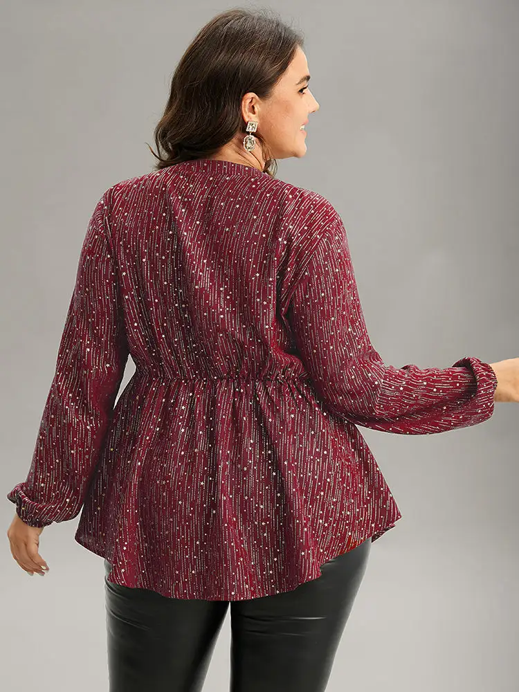 Glitter Lantern Sleeve Elastic Waist Lace Up Blouse