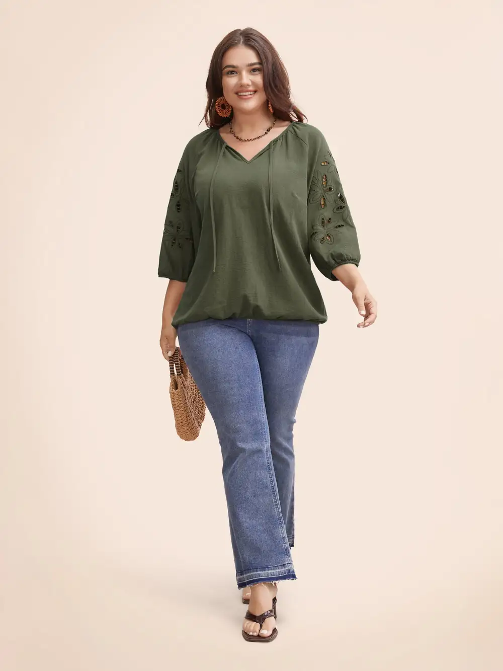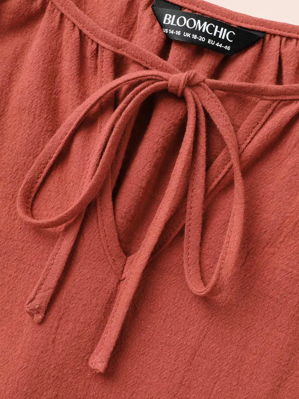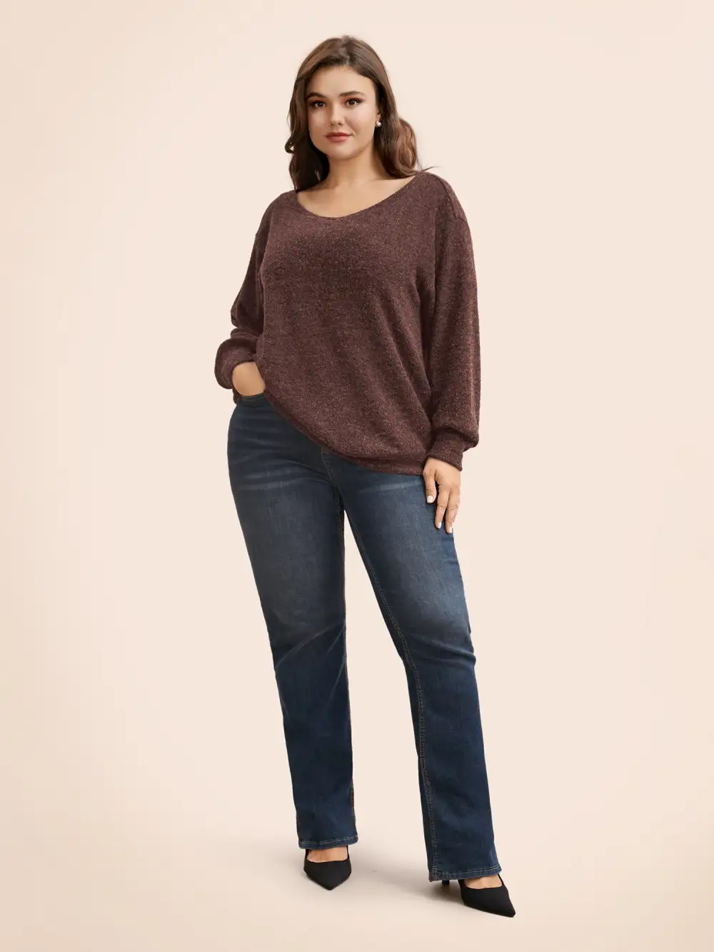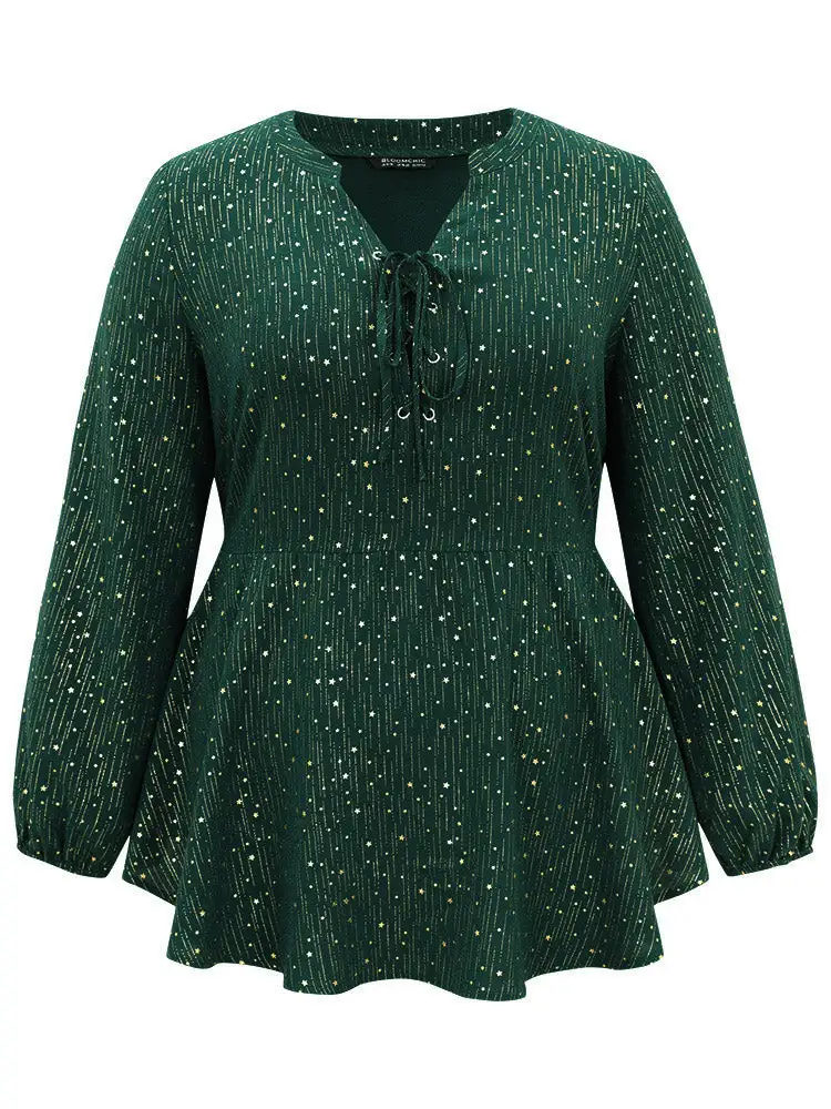 Glitter Lantern Sleeve Elastic Waist Lace Up Blouse