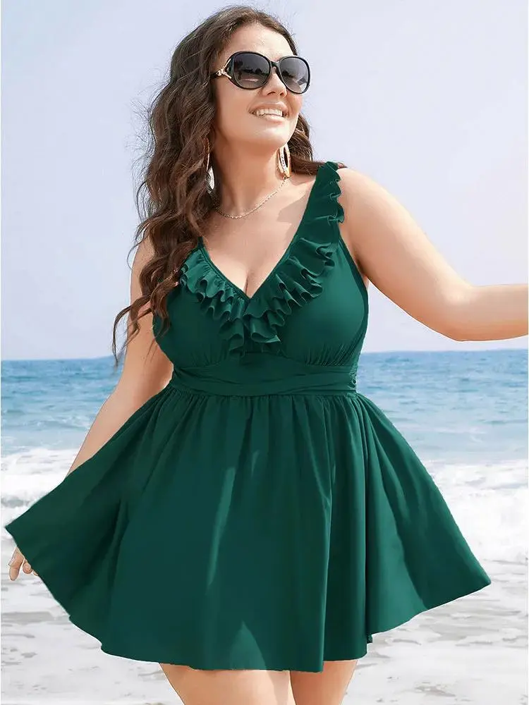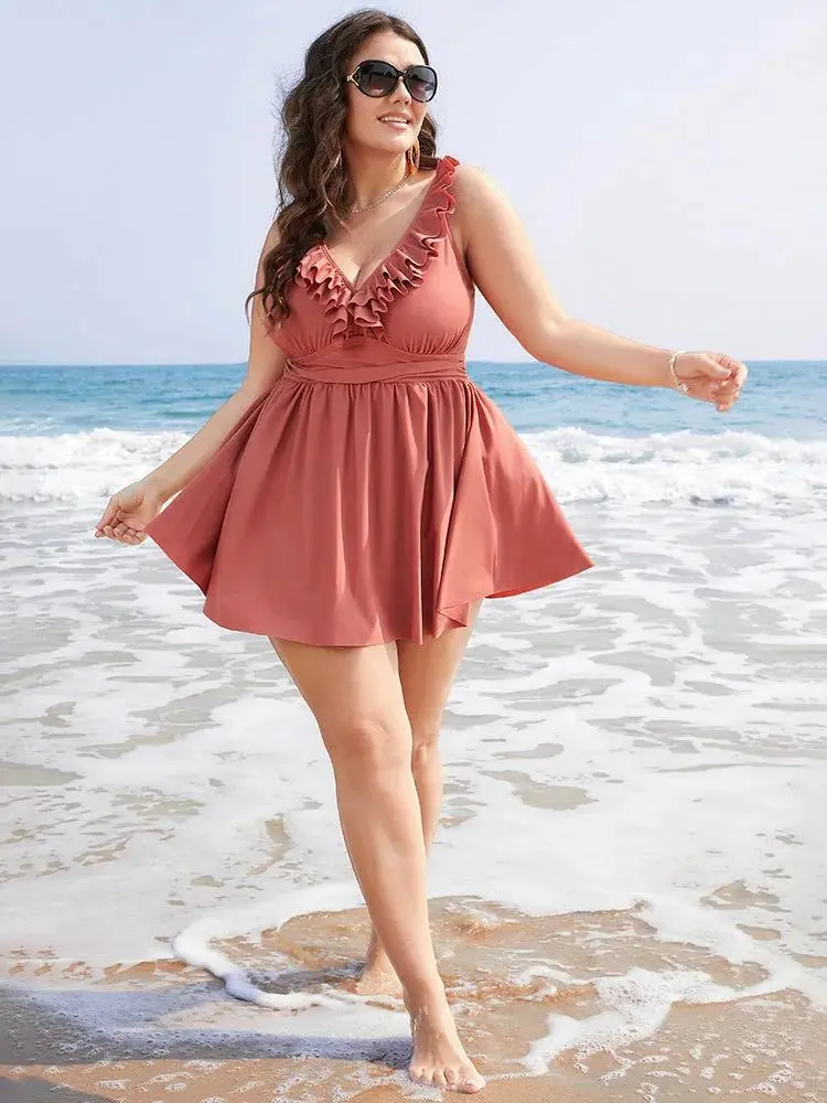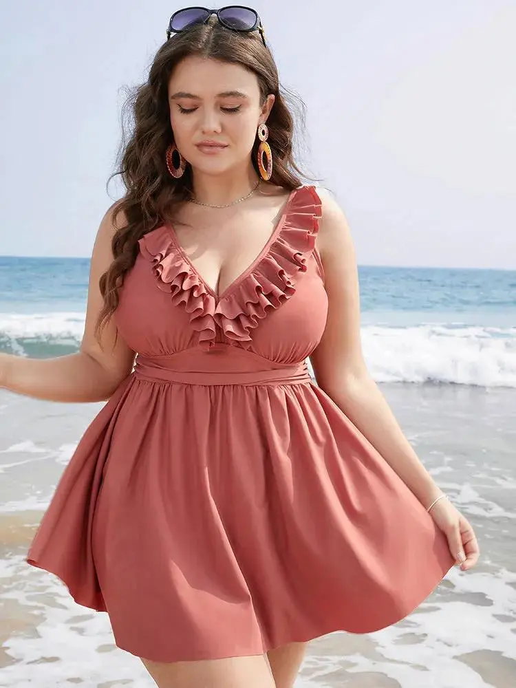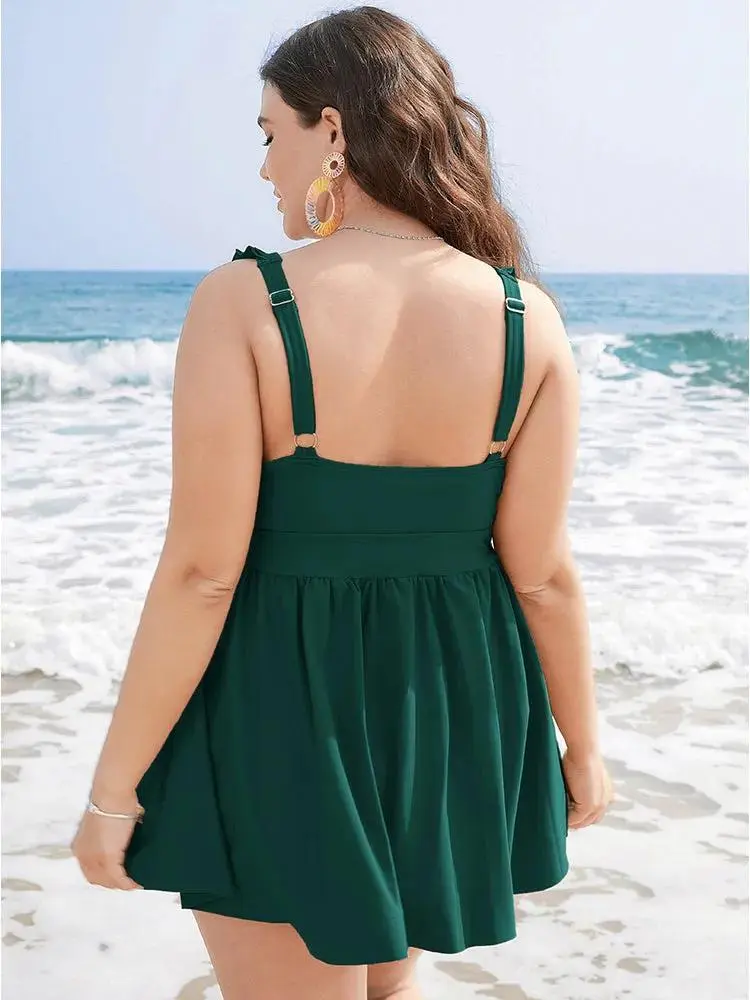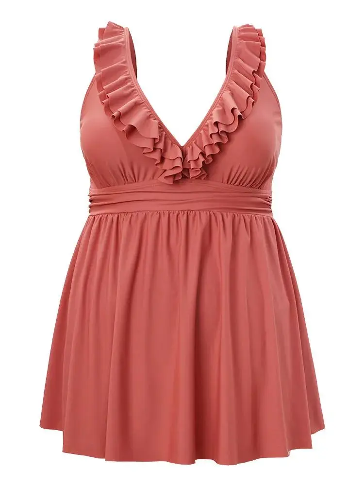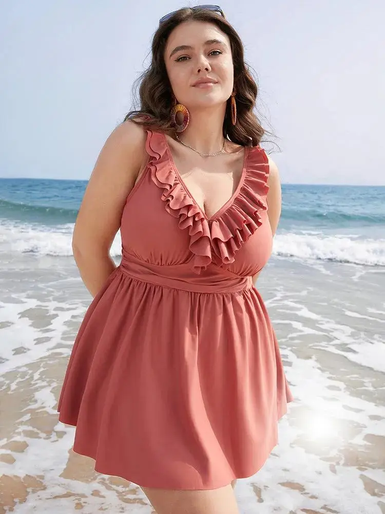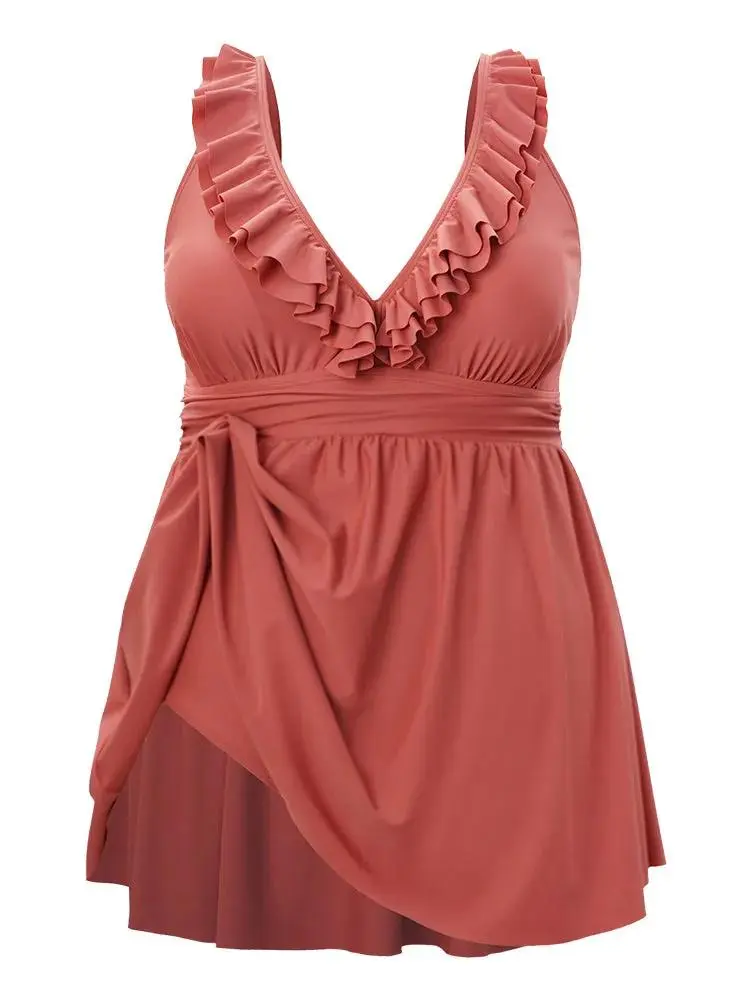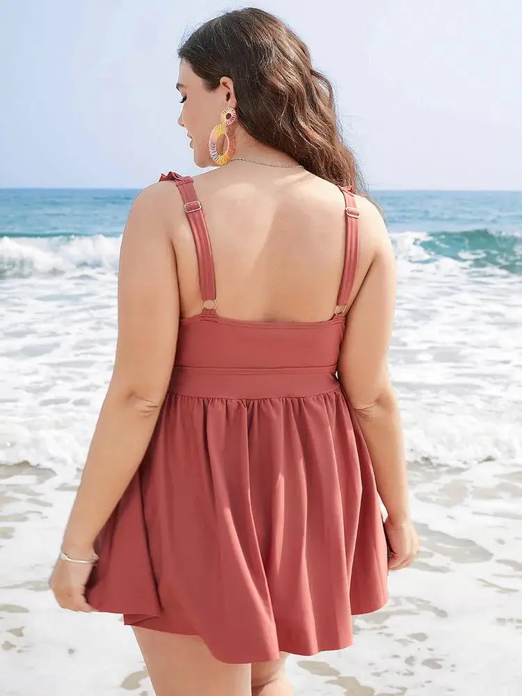 Ruffle Trim Adjustable Straps Gathered Sculpt Waist Swim Dress