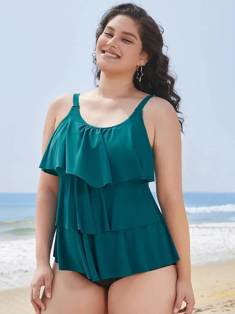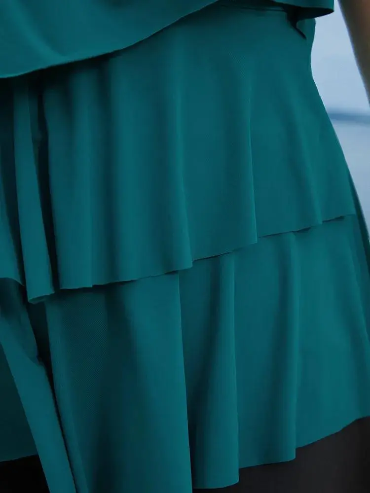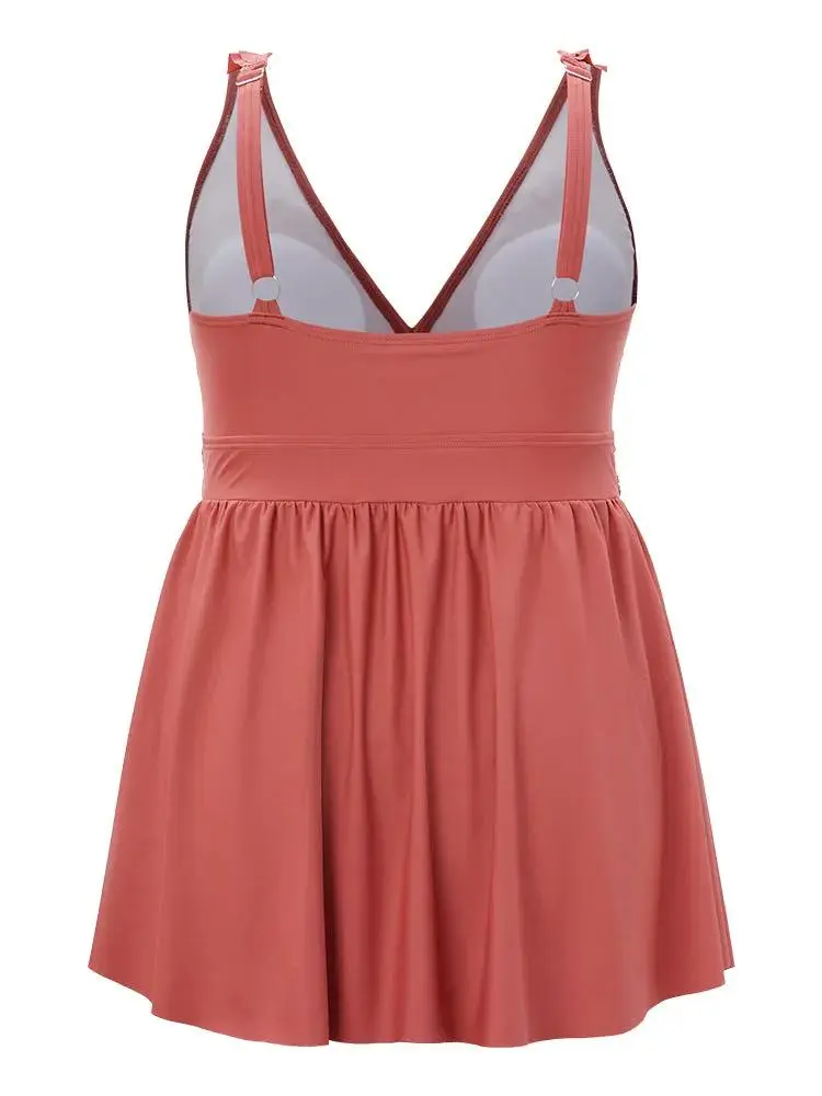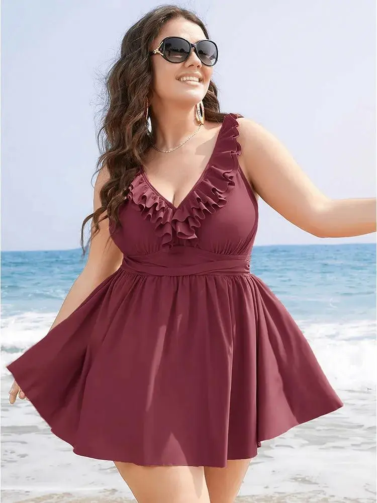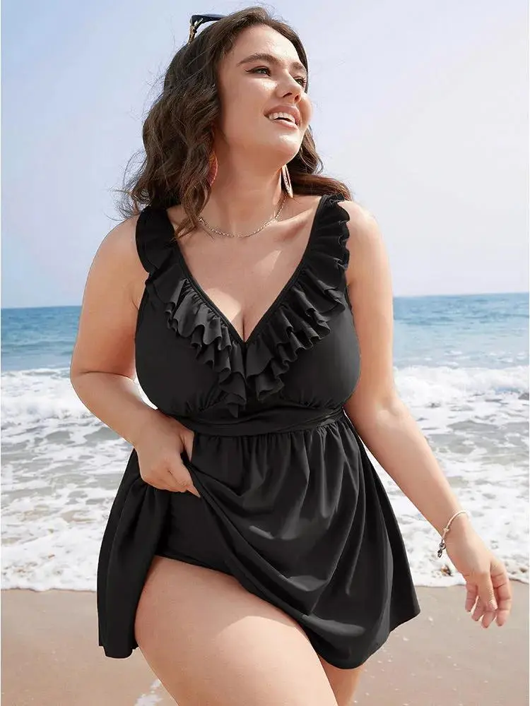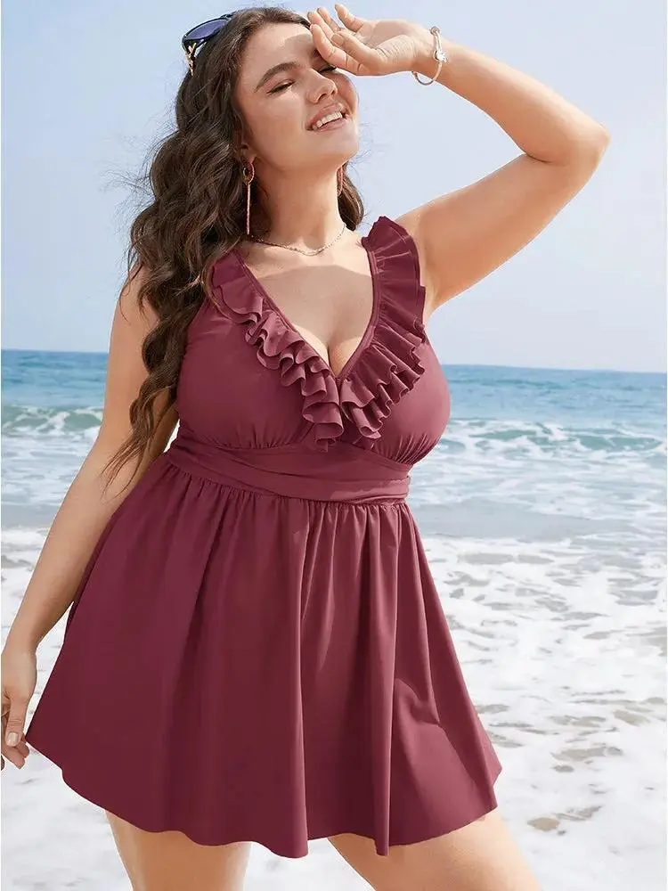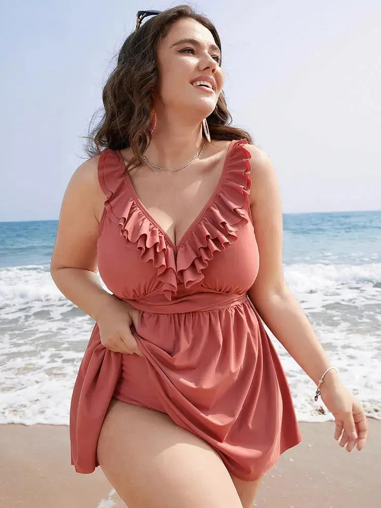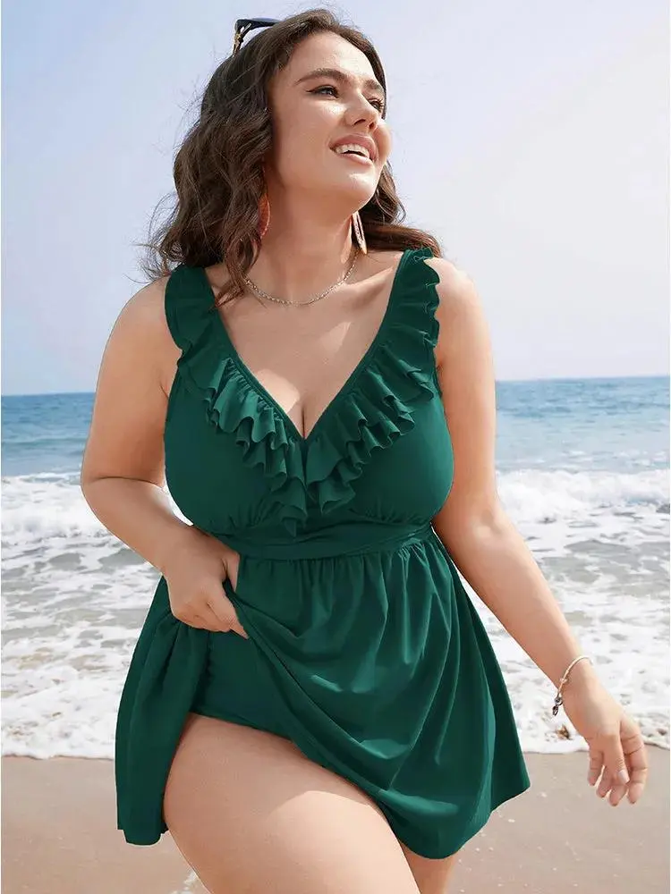 Ruffle Trim Adjustable Straps Gathered Sculpt Waist Swim Dress