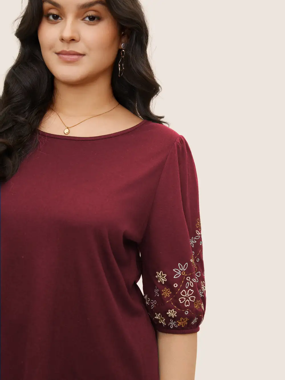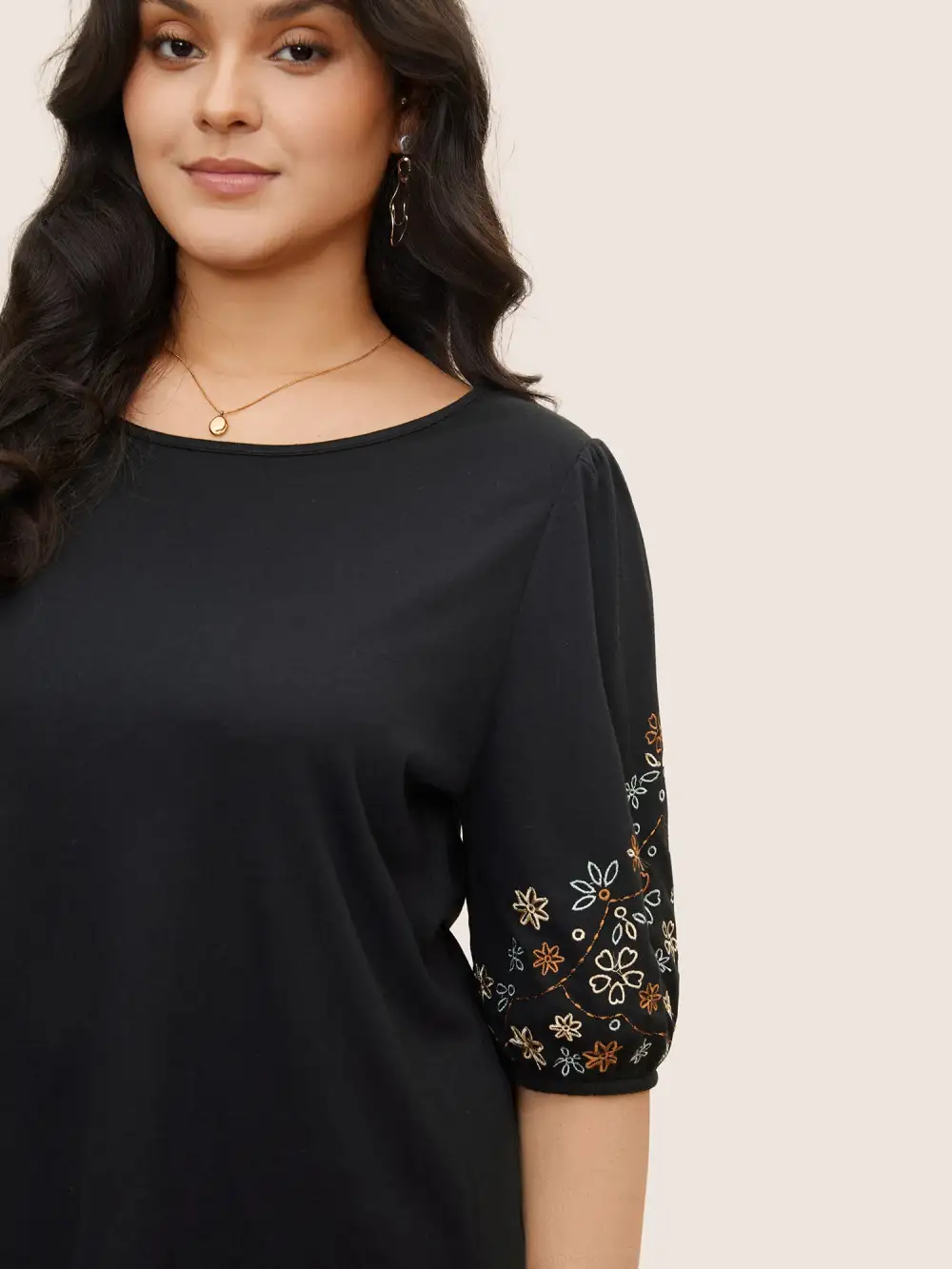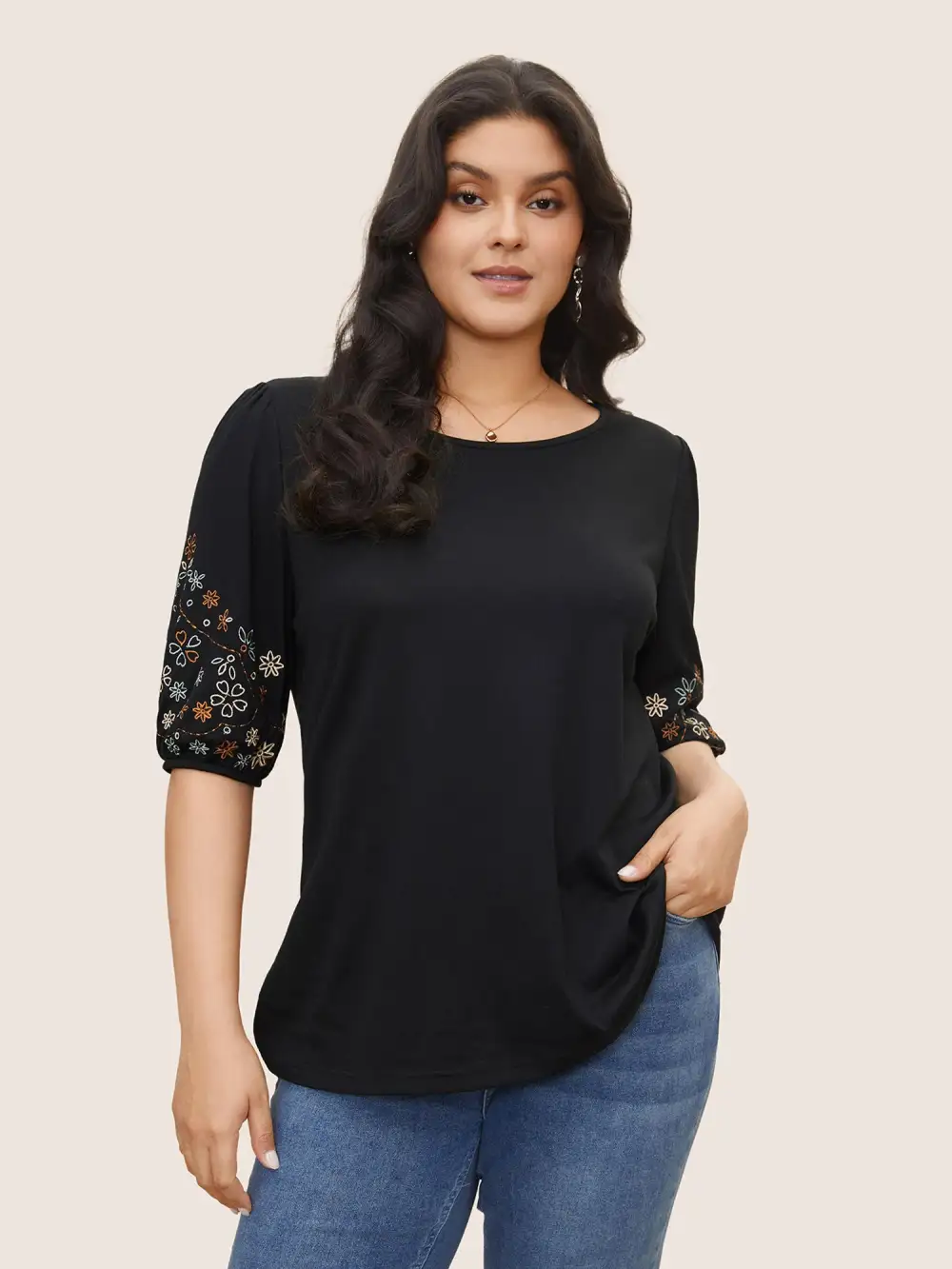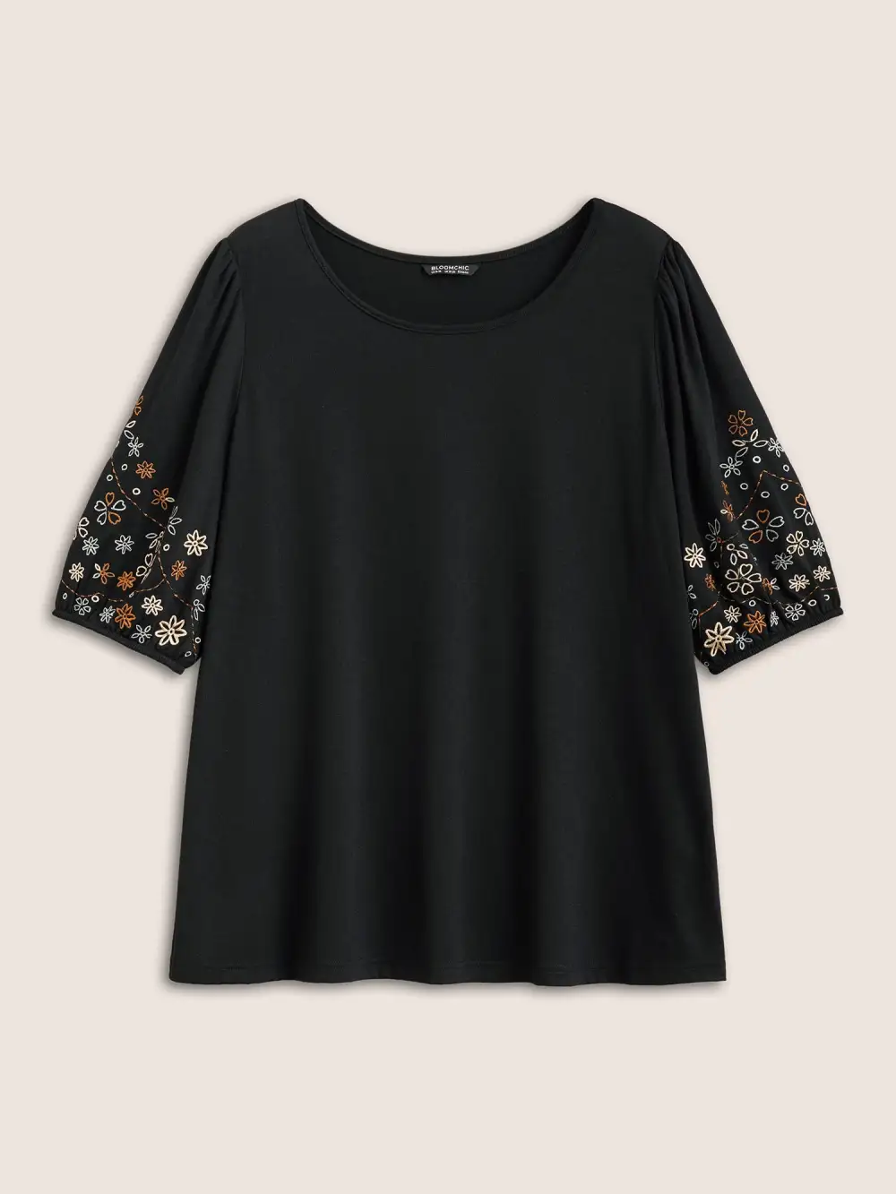 Floral Embroidered Crew Neck Puff Sleeve T-Shirt