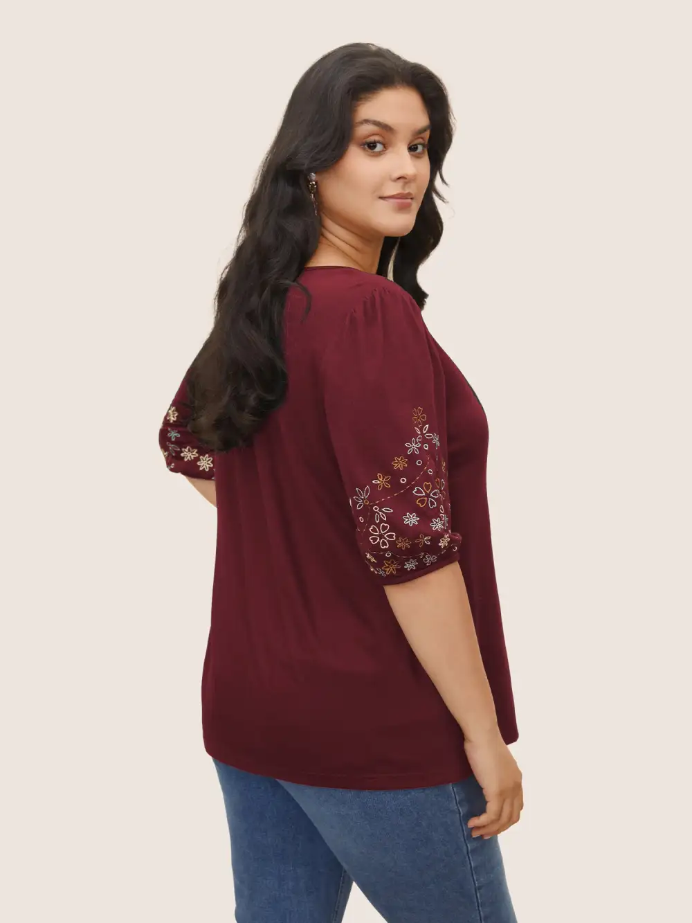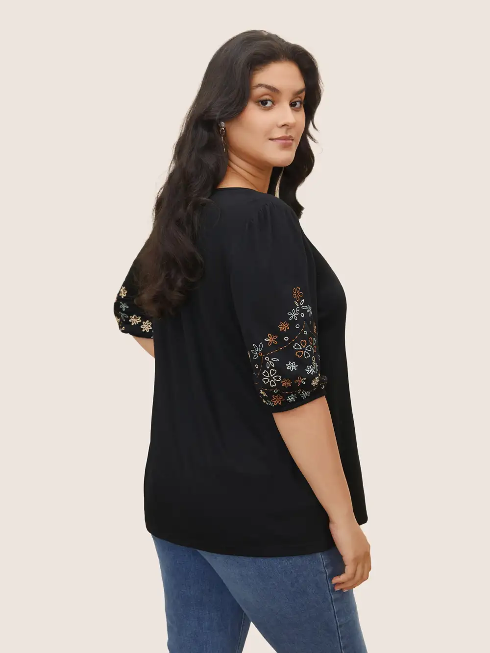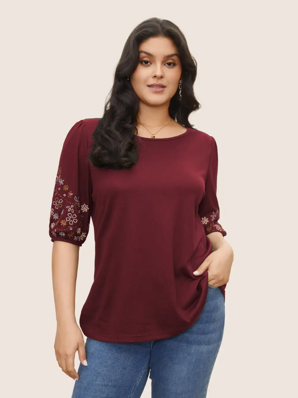 Floral Embroidered Crew Neck Puff Sleeve T-Shirt