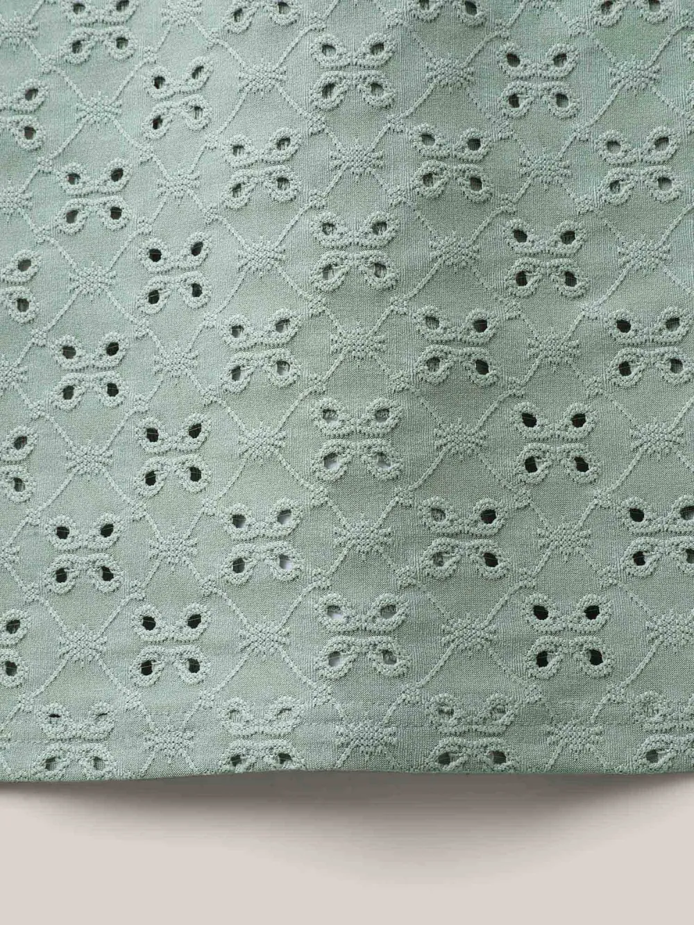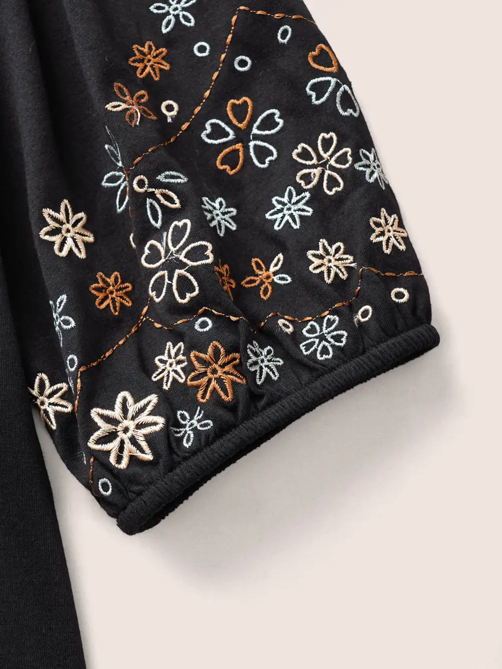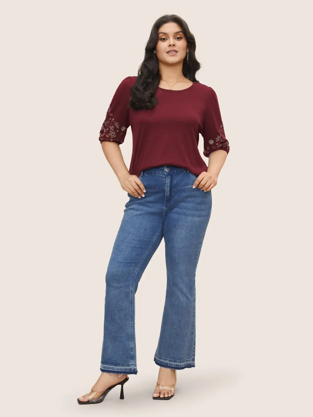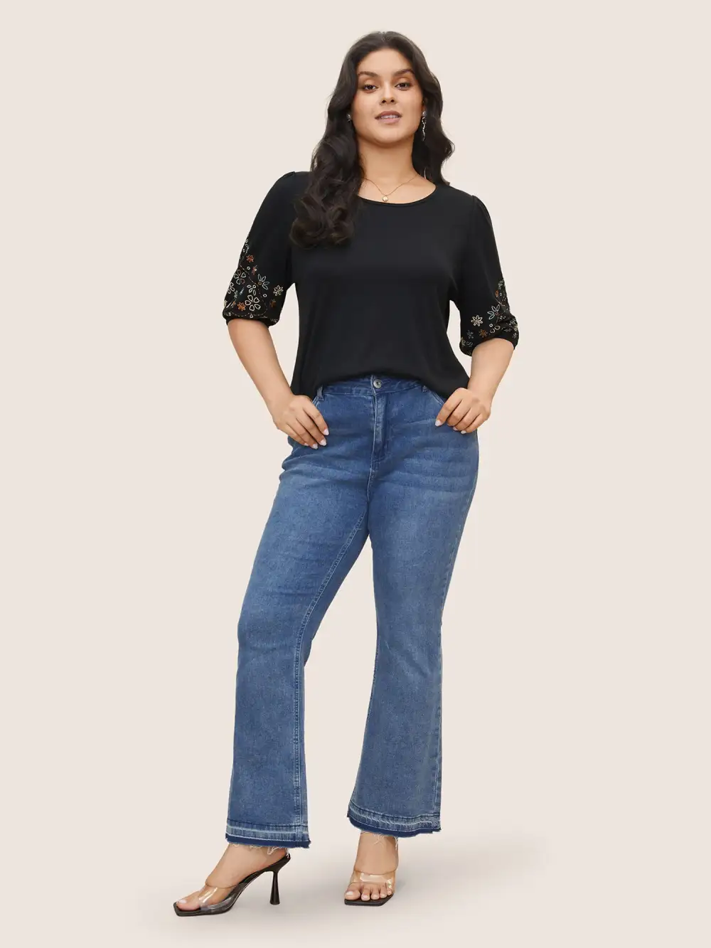 Floral Embroidered Crew Neck Puff Sleeve T-Shirt