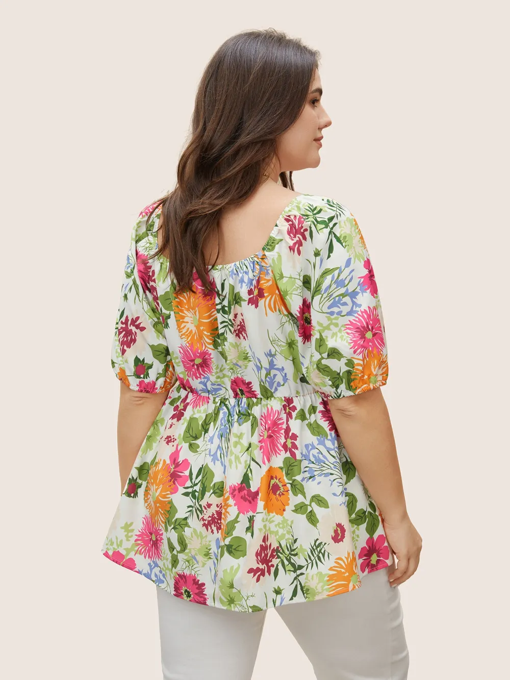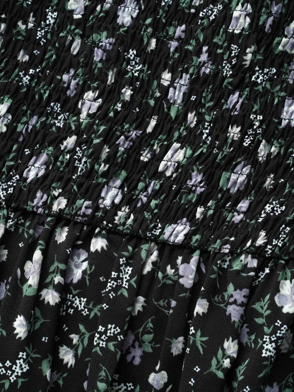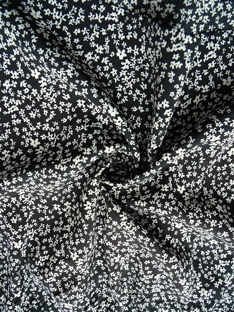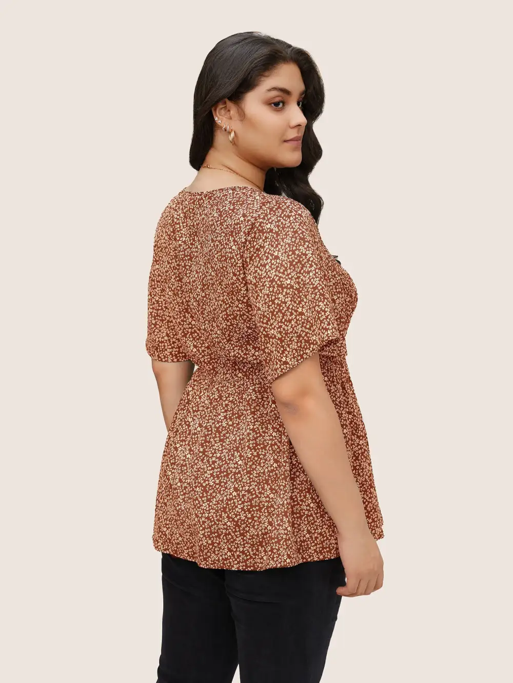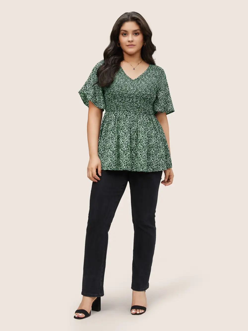 Ditsy Floral Shirred Ruffle Sleeve Elastic Waist Blouse