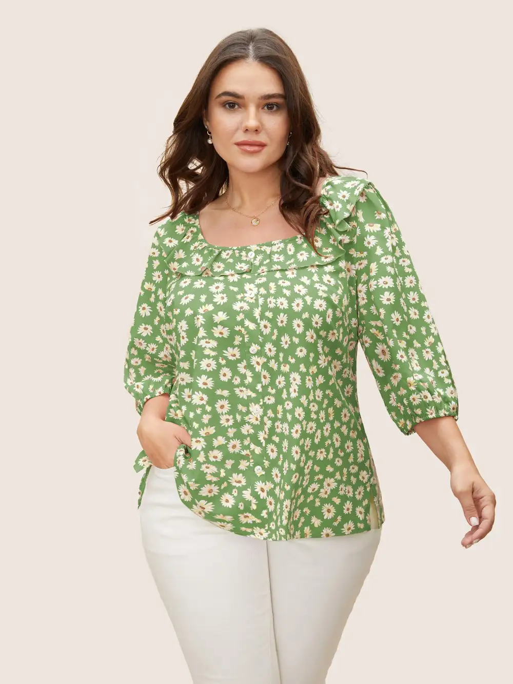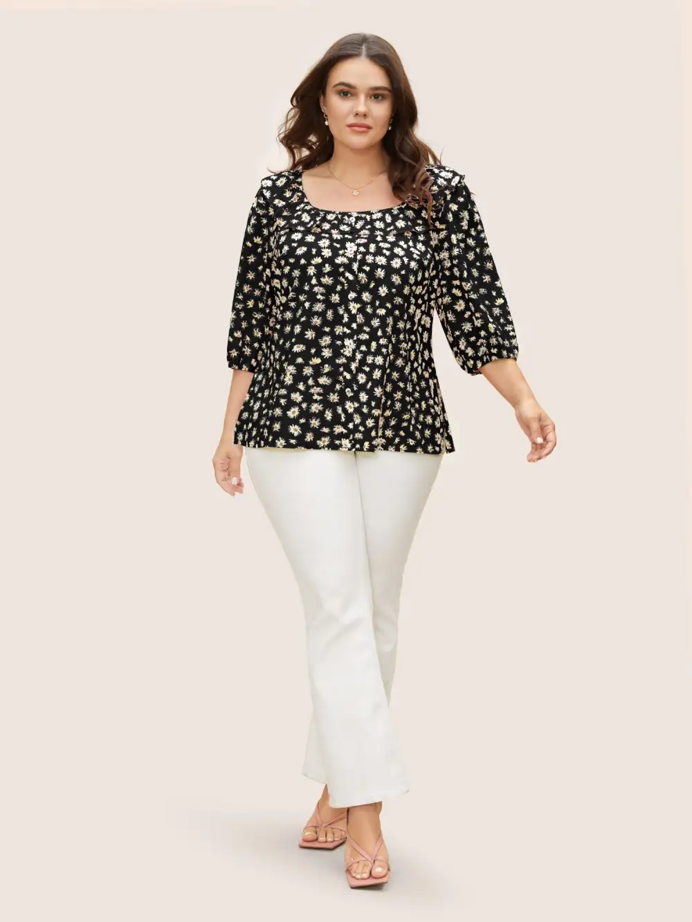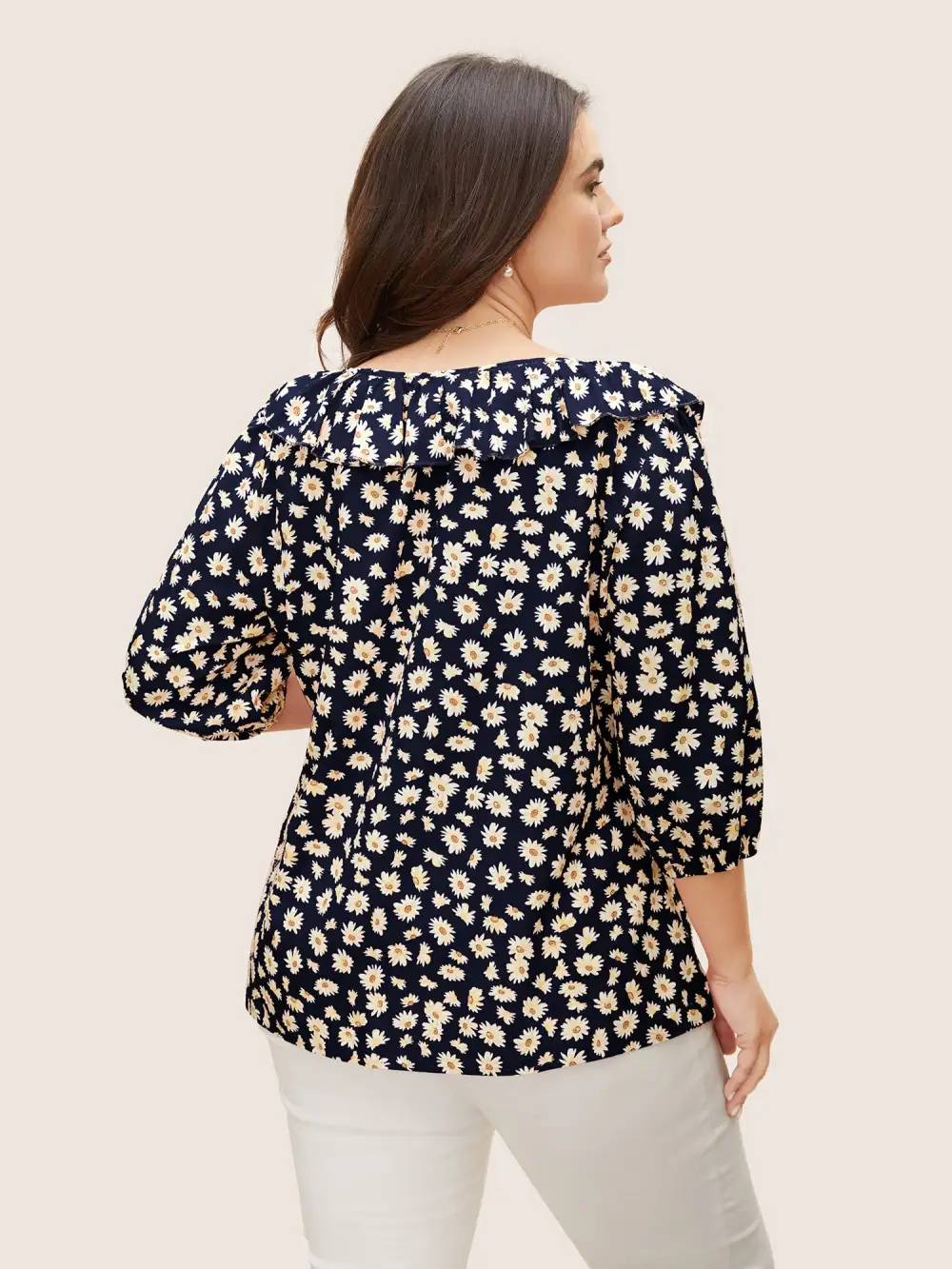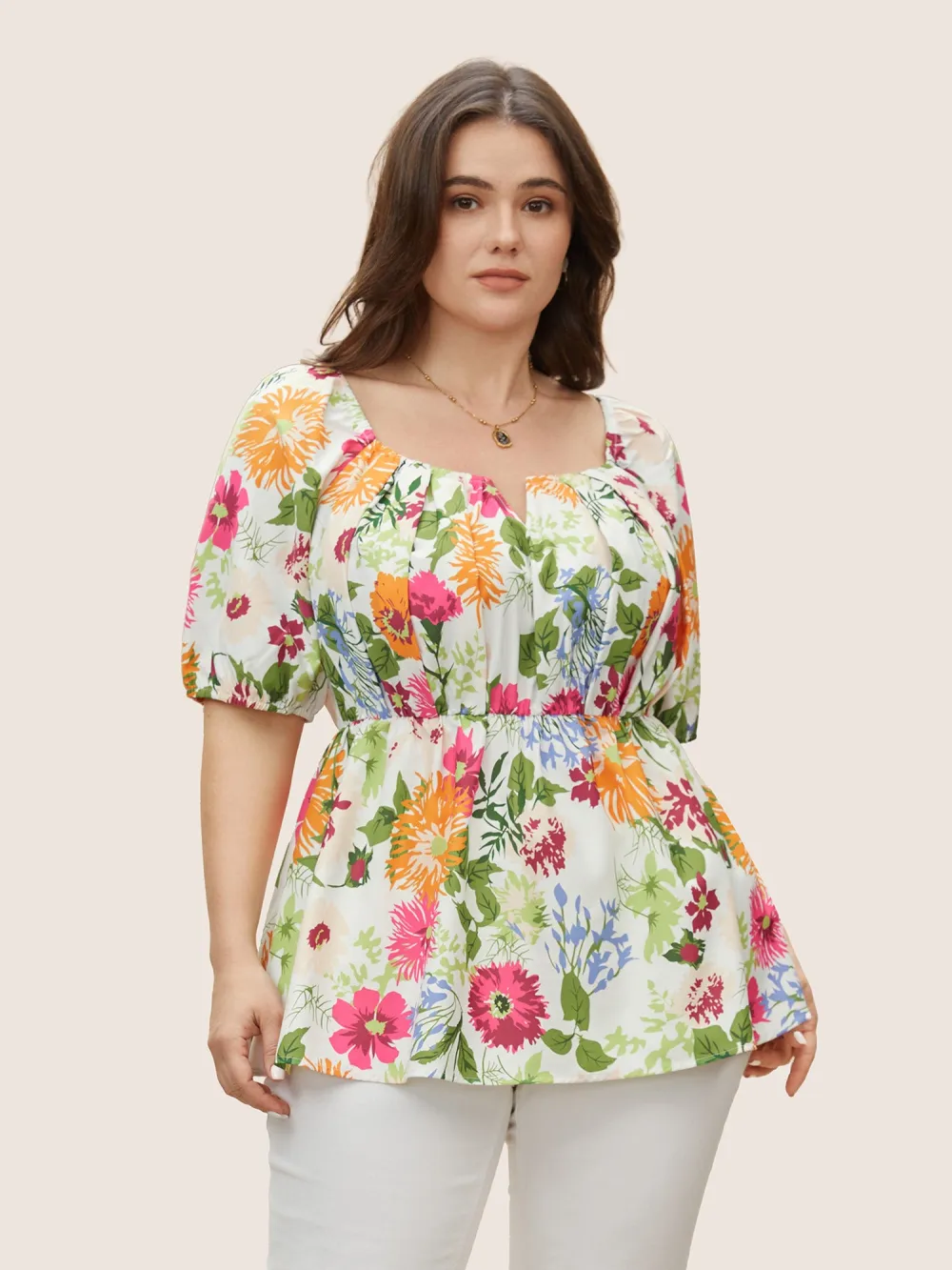 Ditsy Floral Shirred Ruffle Sleeve Elastic Waist Blouse