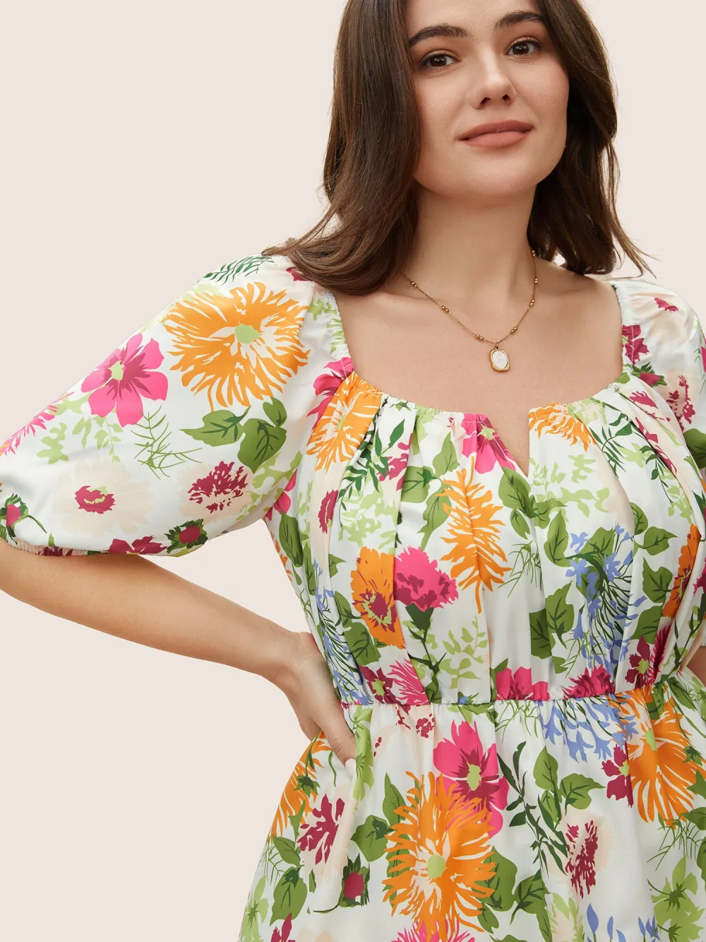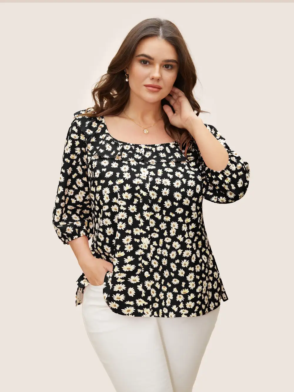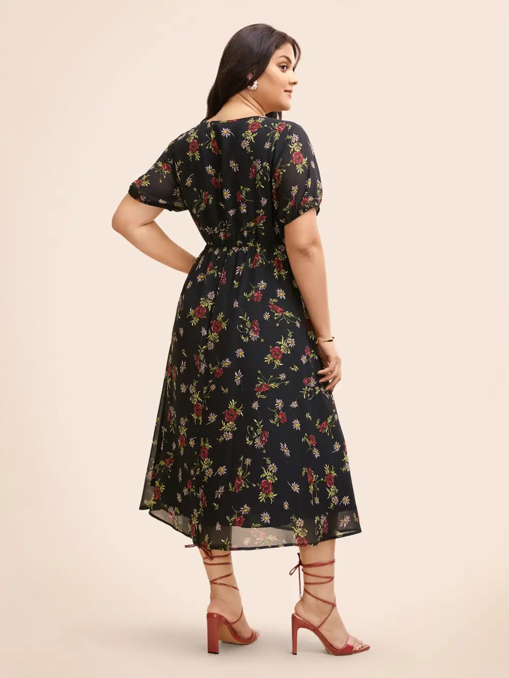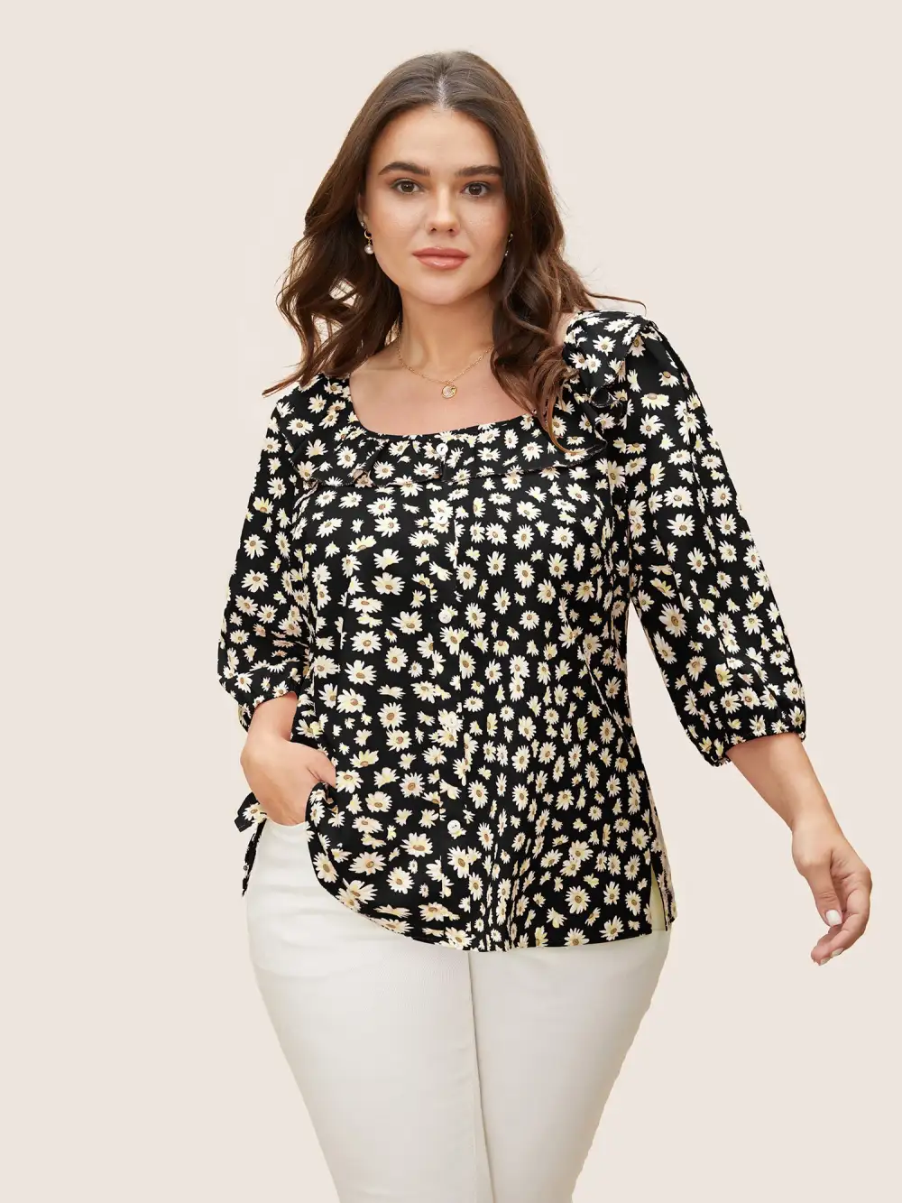 Ditsy Floral Shirred Ruffle Sleeve Elastic Waist Blouse