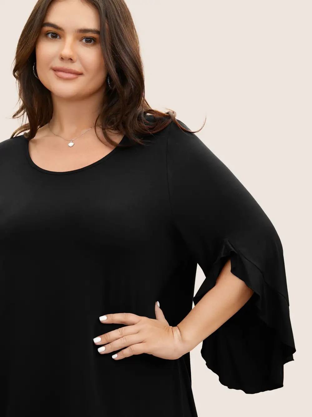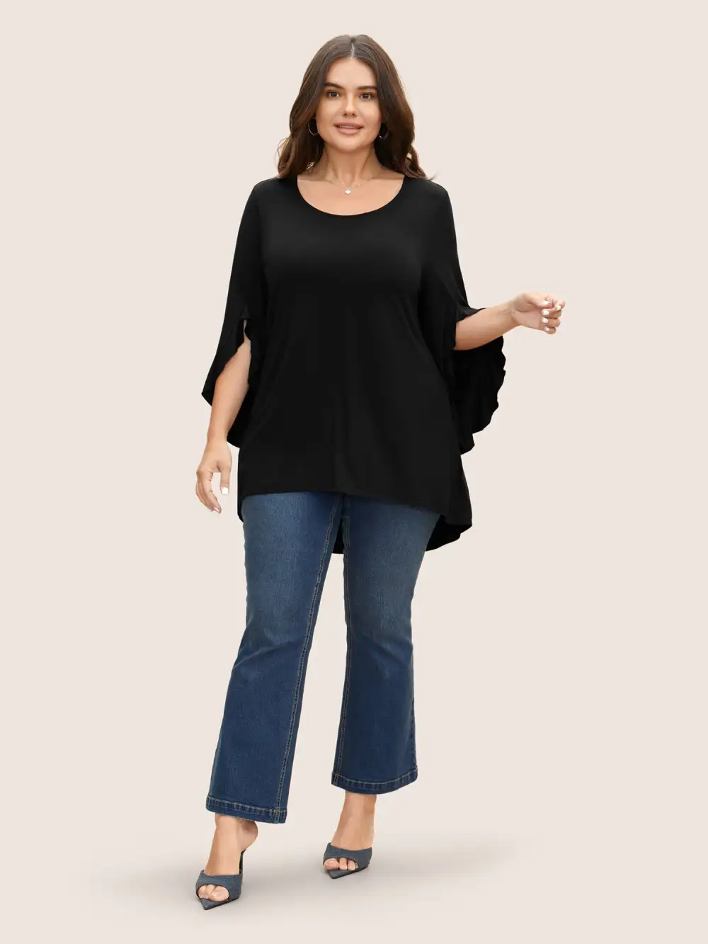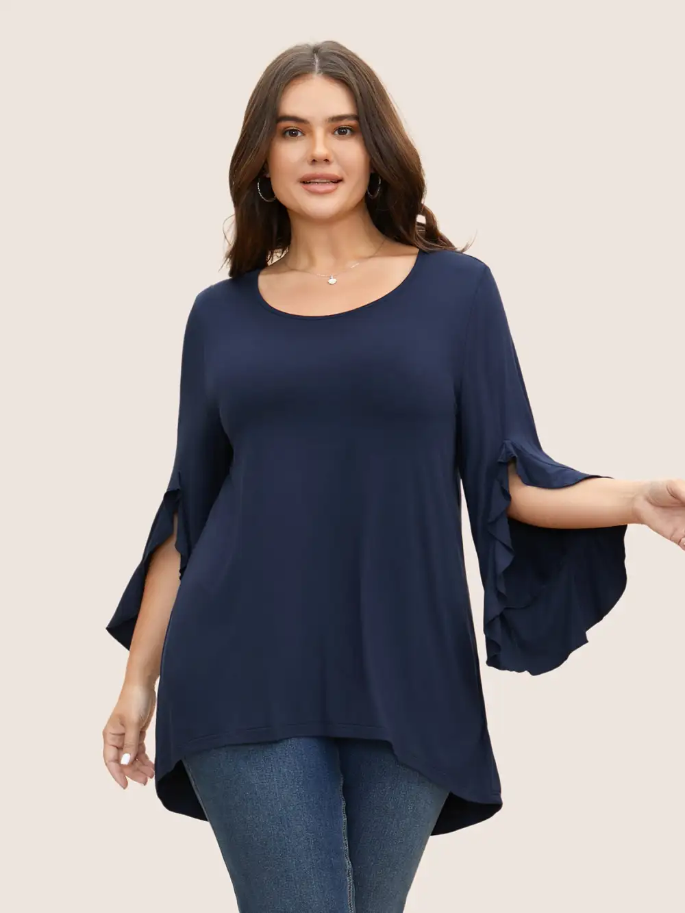 Solid Ruffle Sleeve High Low Hem T-Shirt