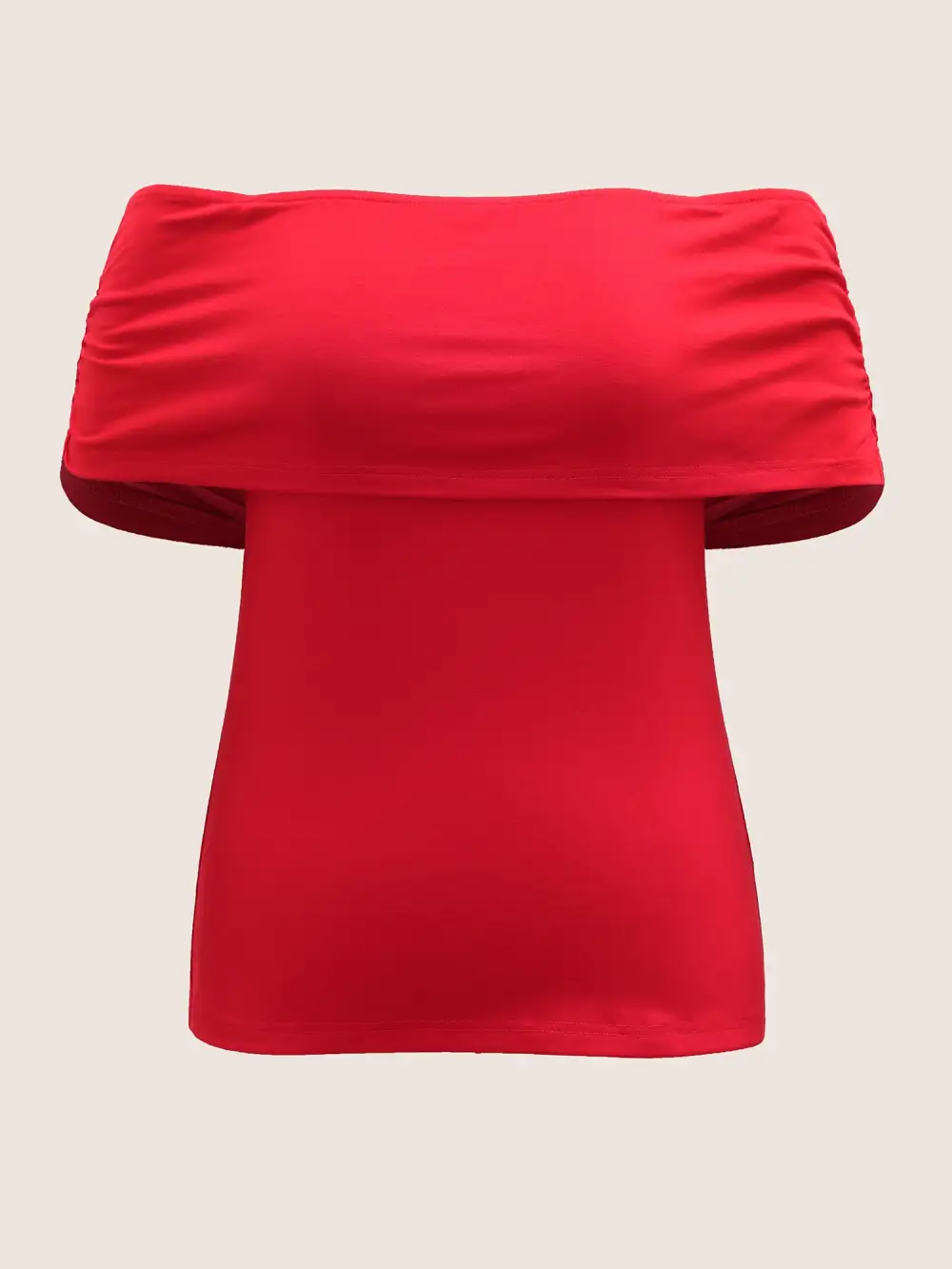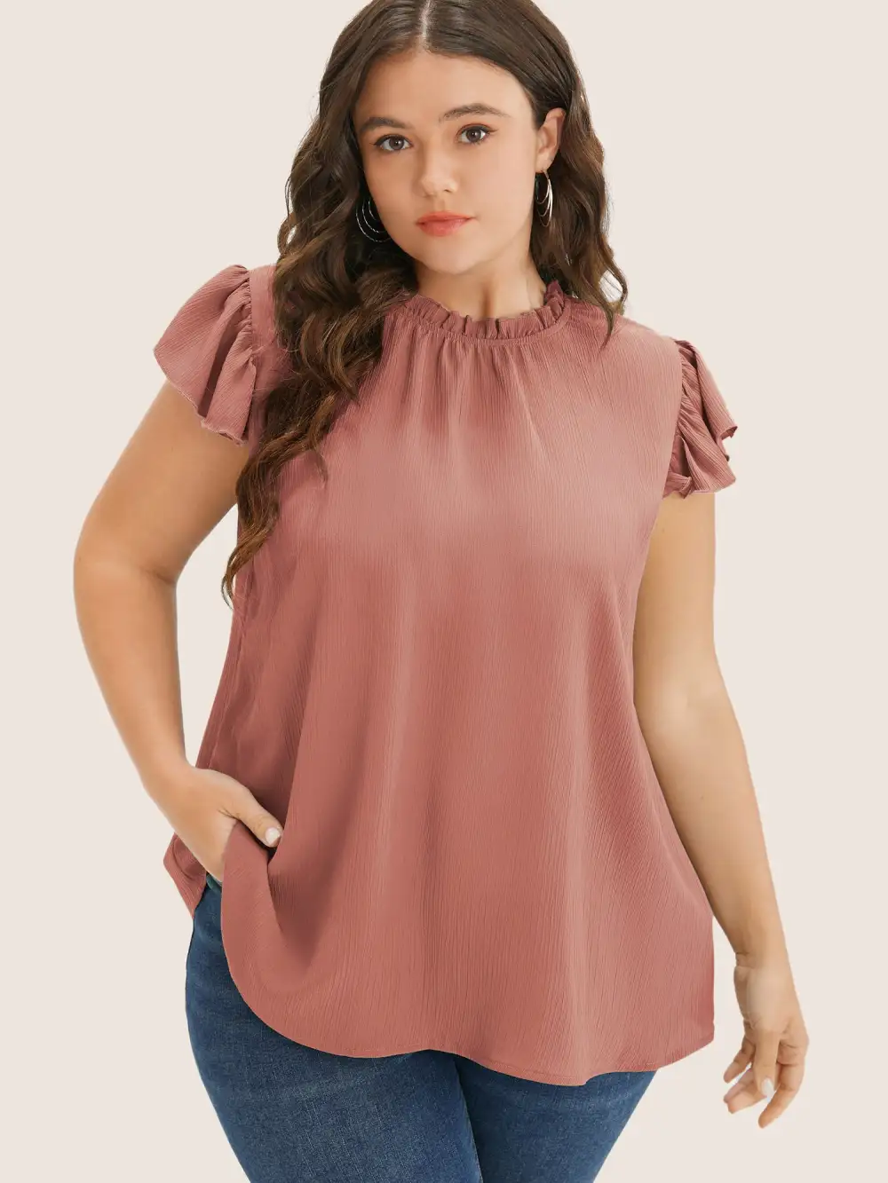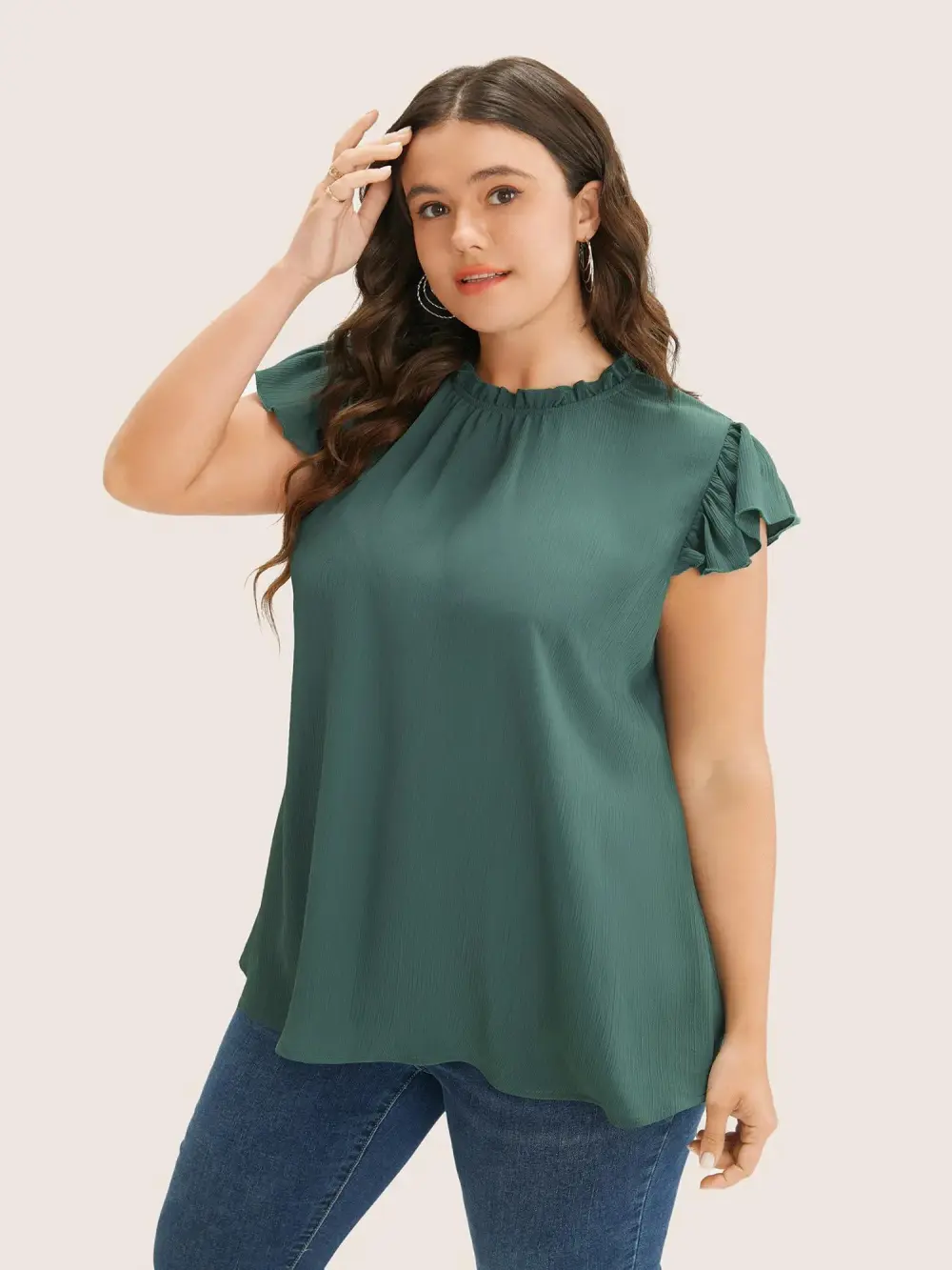 Plain Mock Neck Cap Sleeve Ruffle Trim Blouse