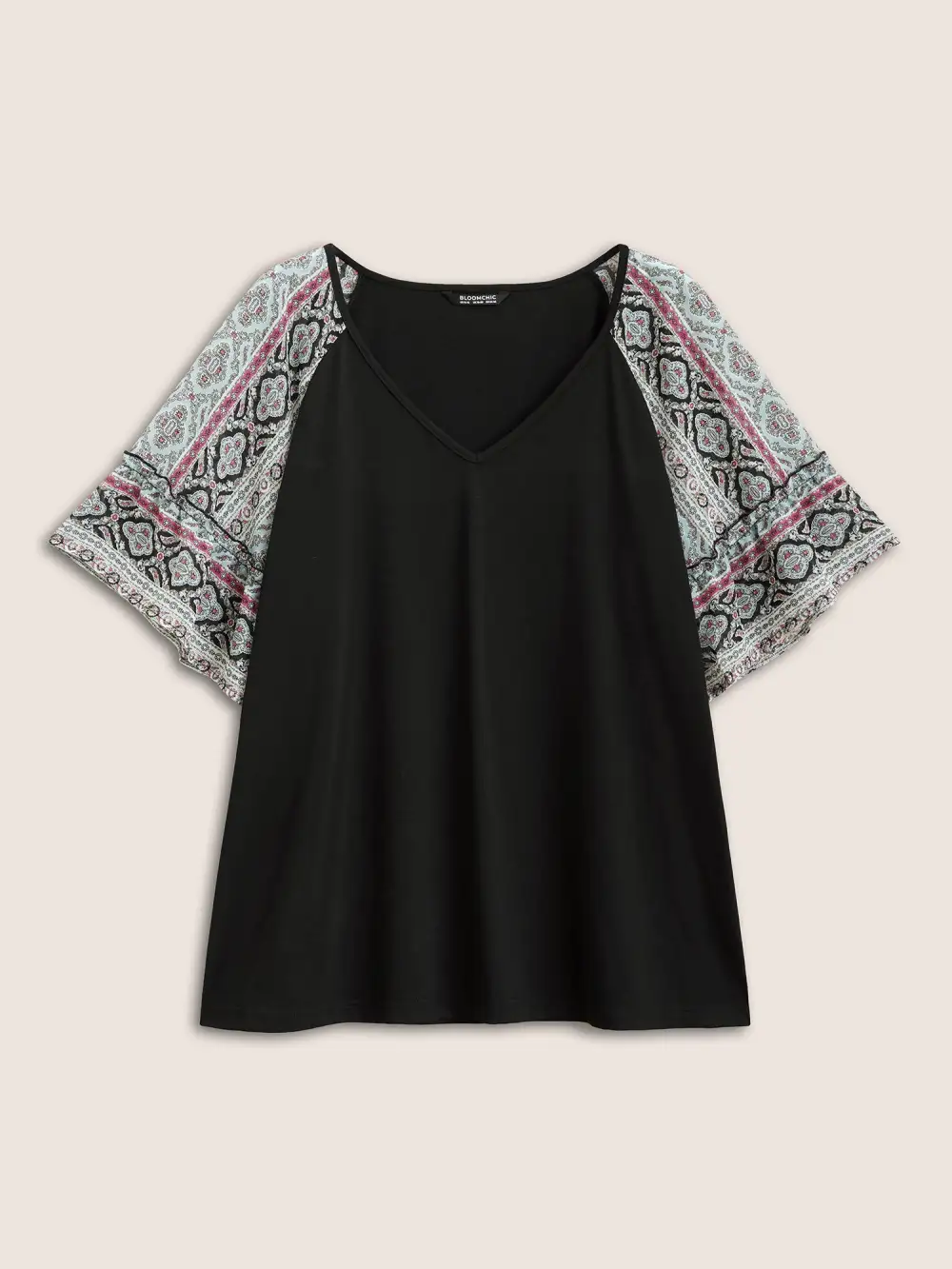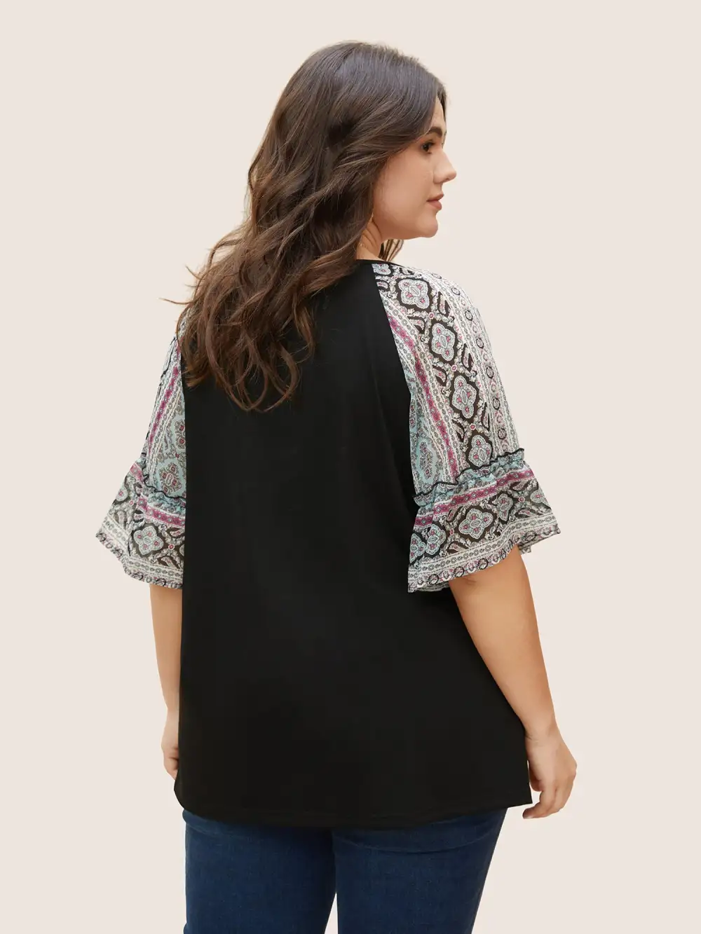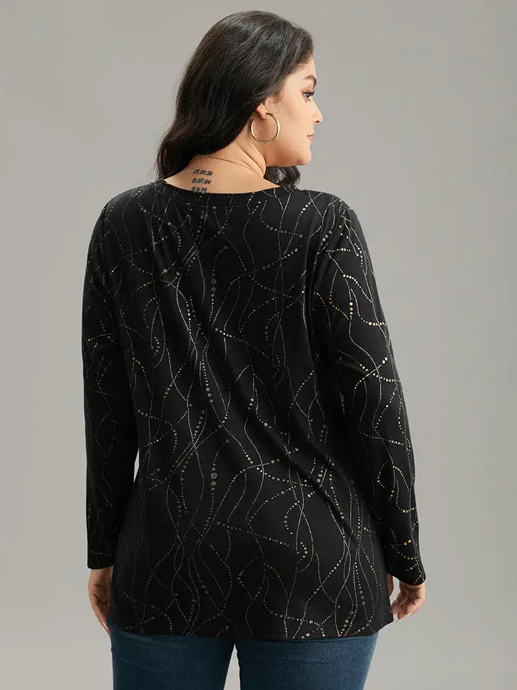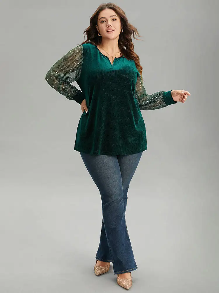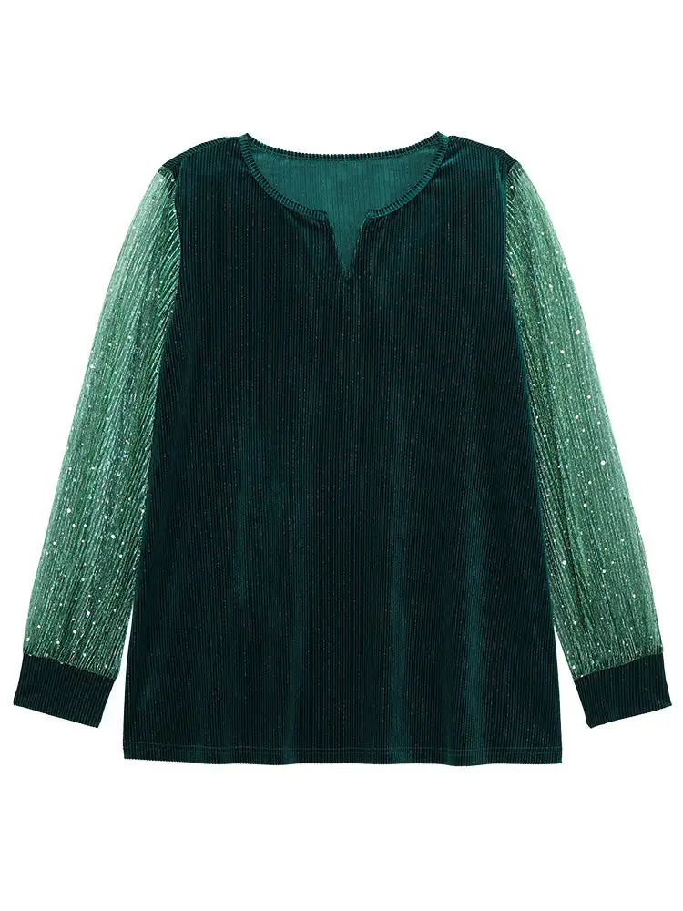 Velvet Patchwork Mesh Sequin Notched T-Shirt