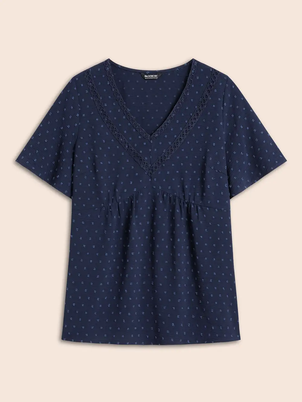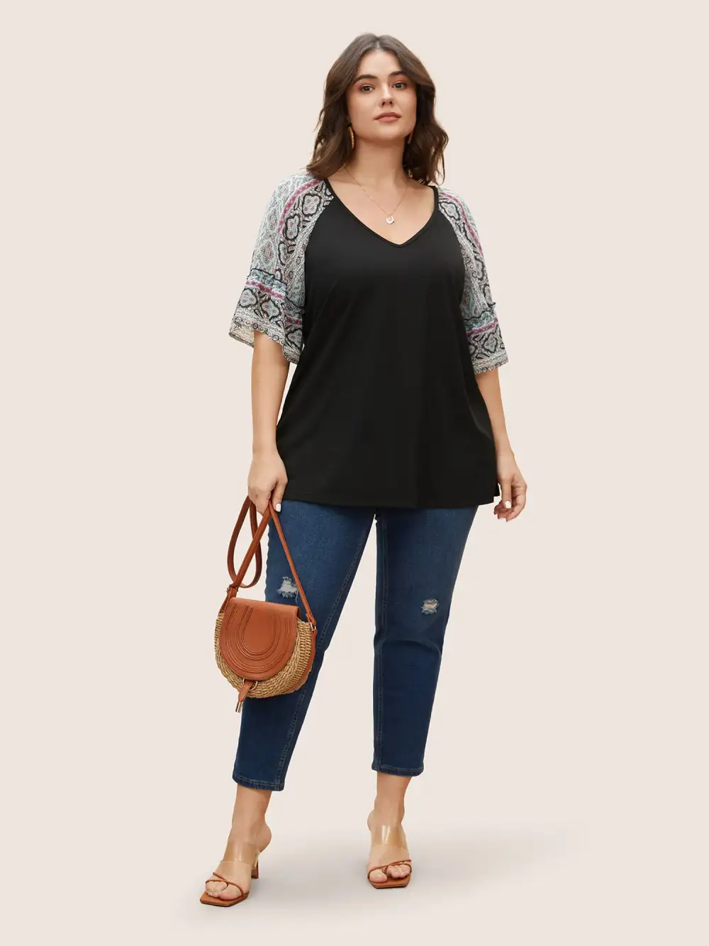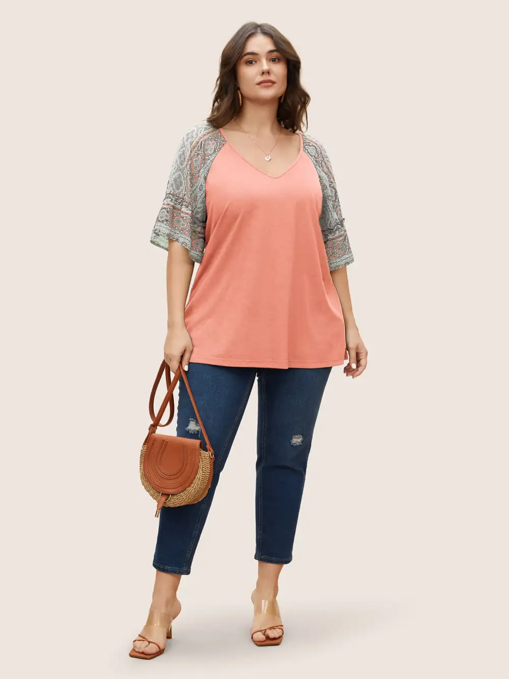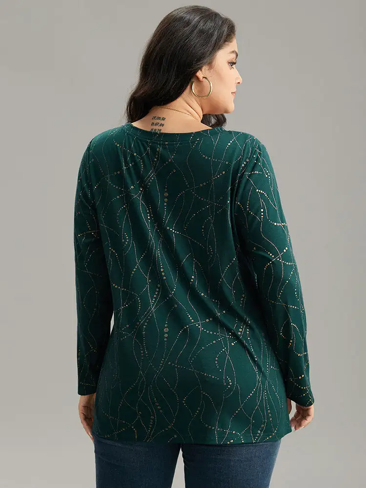 Velvet Patchwork Mesh Sequin Notched T-Shirt