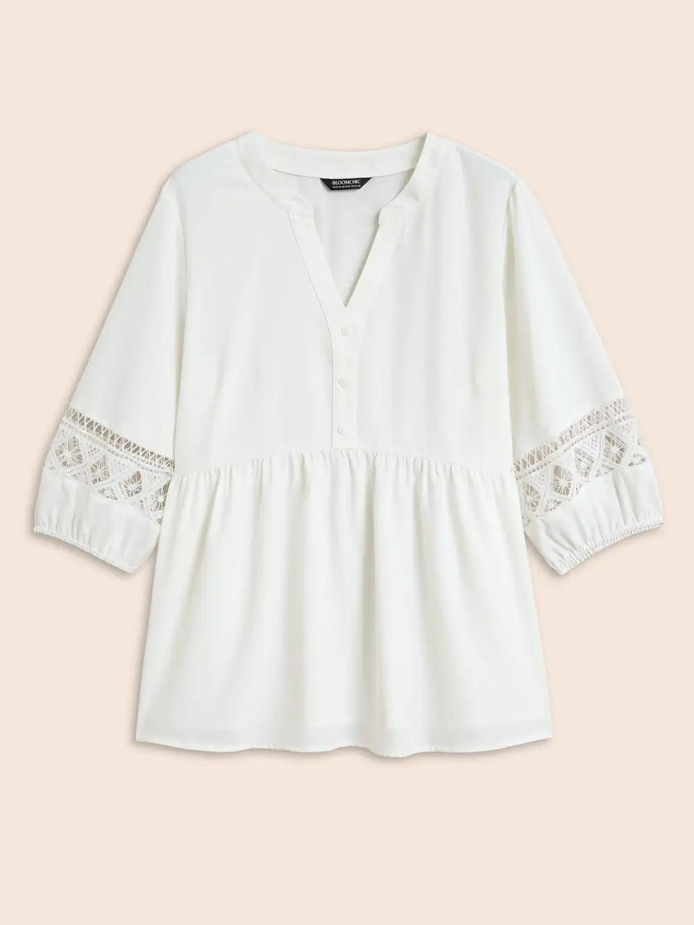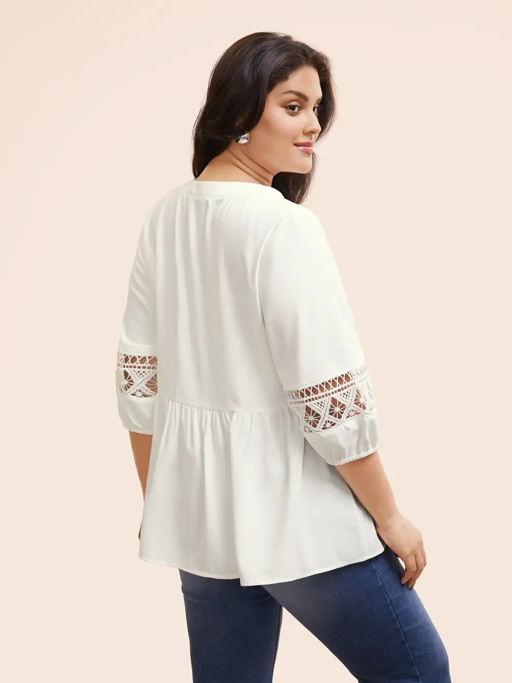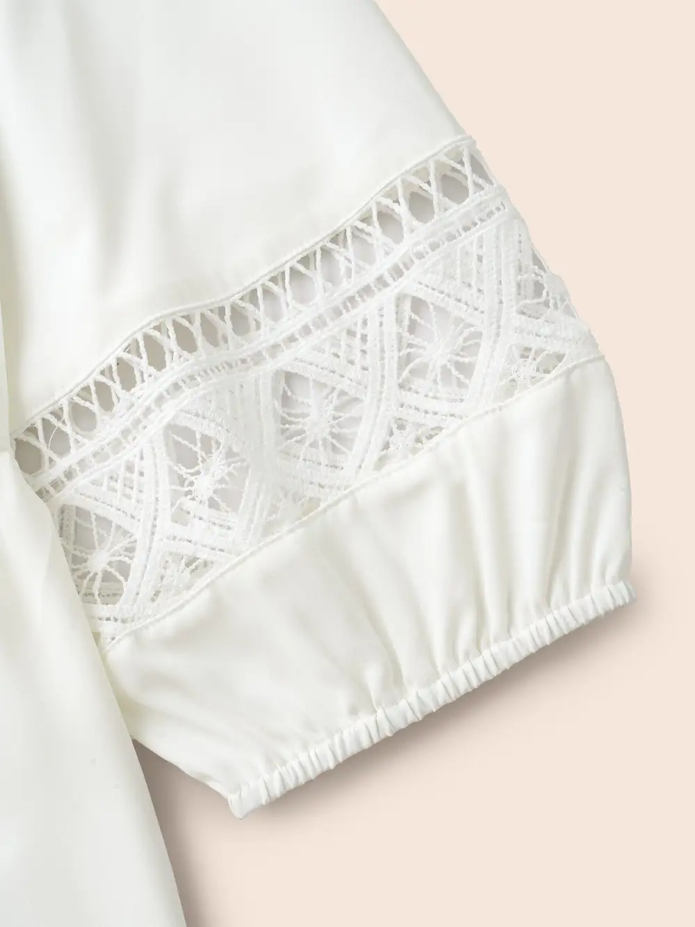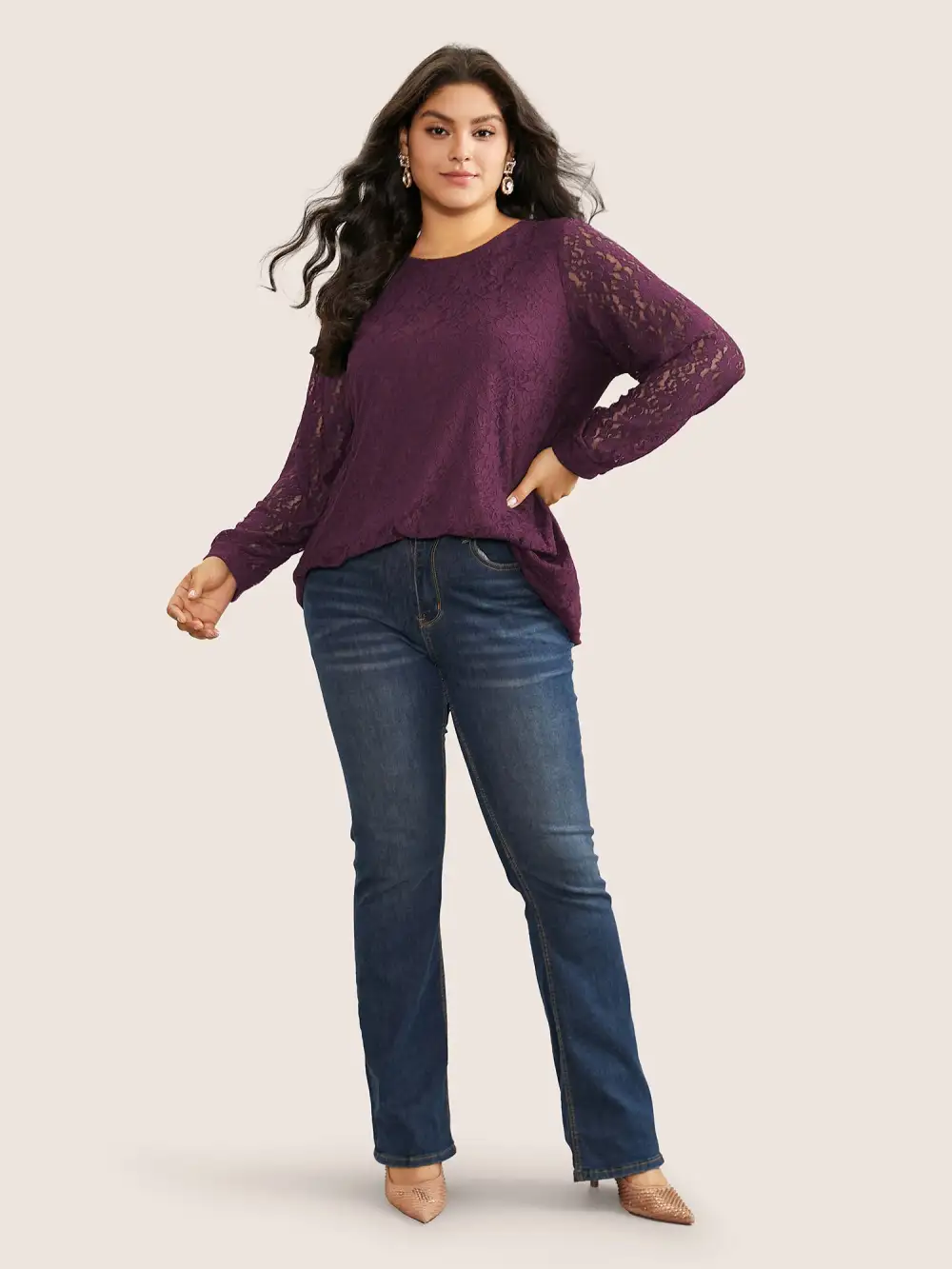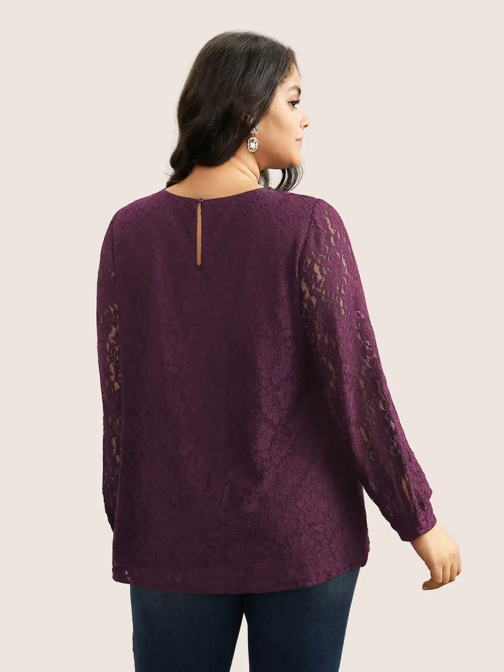 Solid Crochet Lace Mesh Crew Neck Blouse
