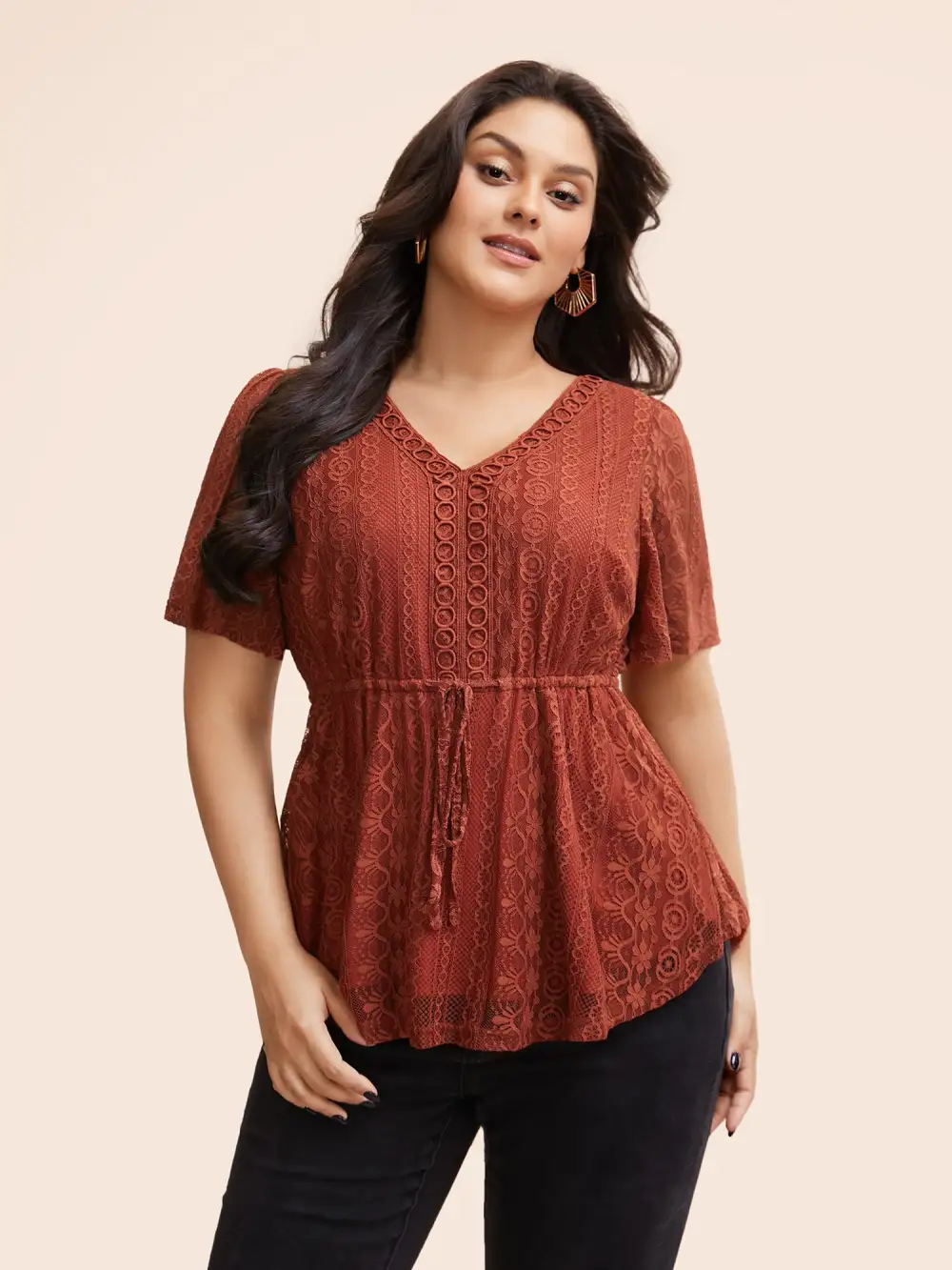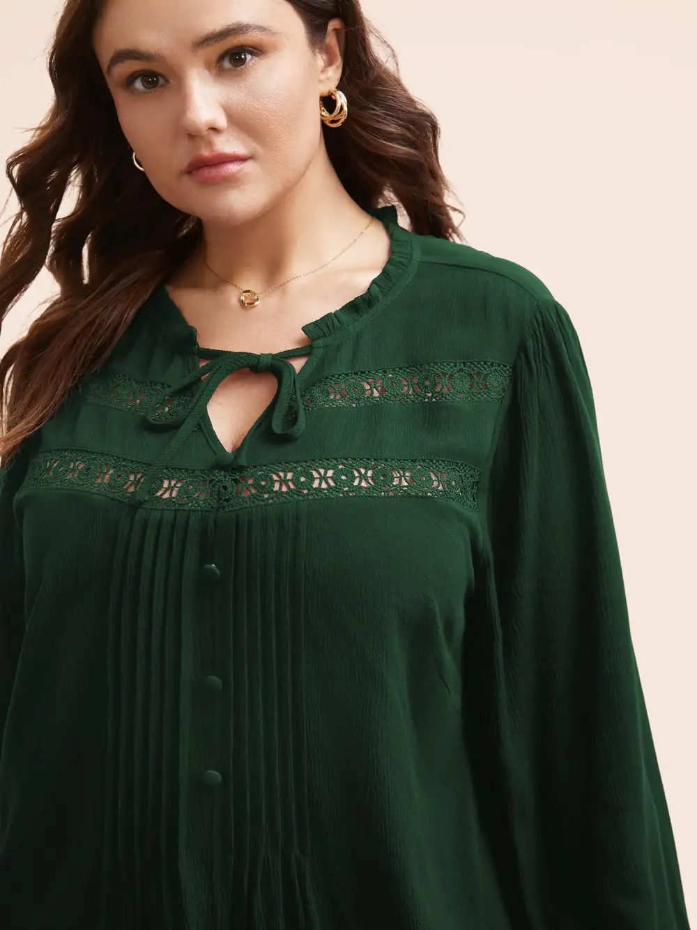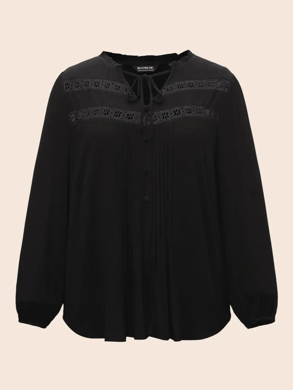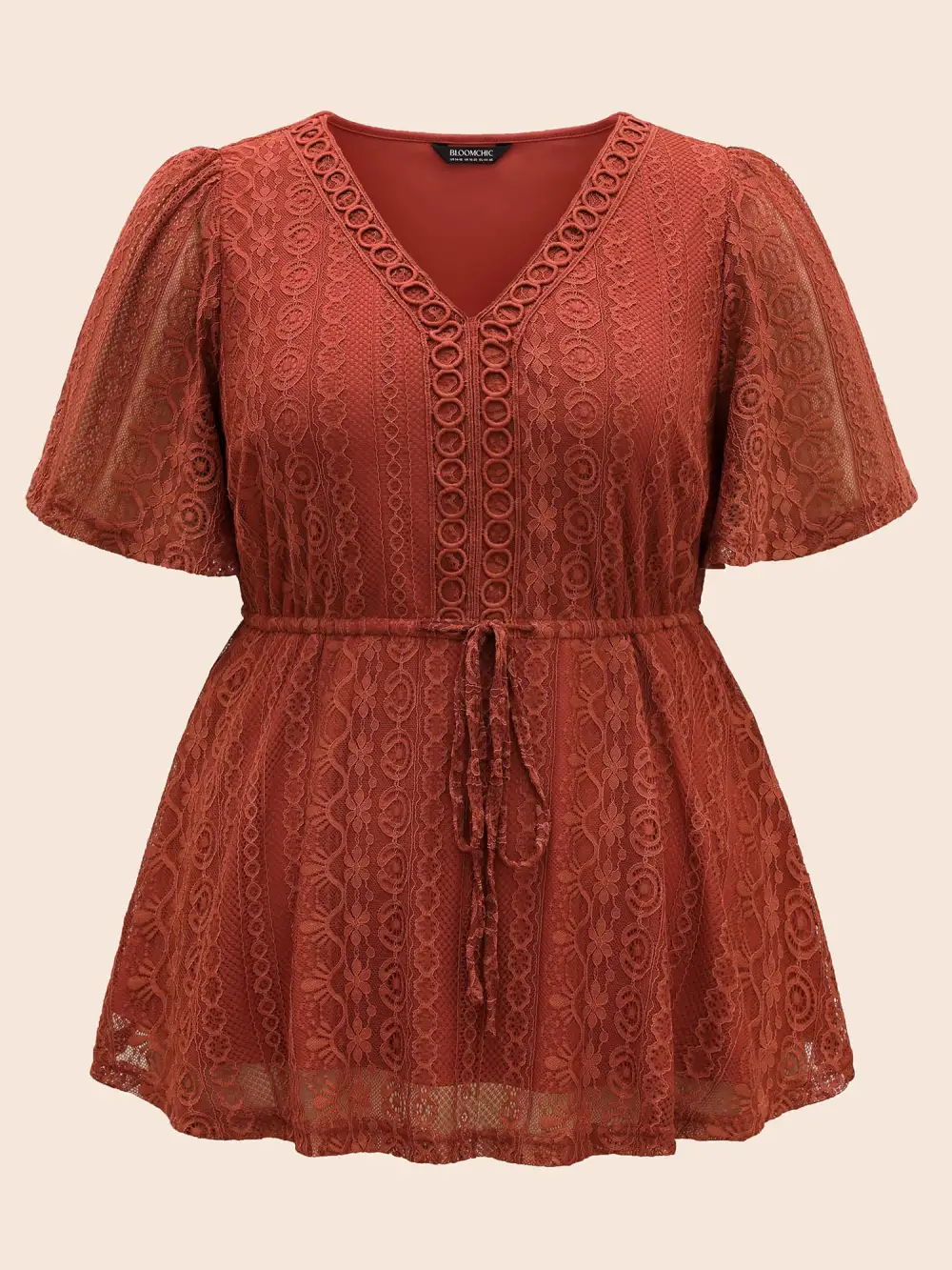 Solid Crochet Lace Mesh Crew Neck Blouse