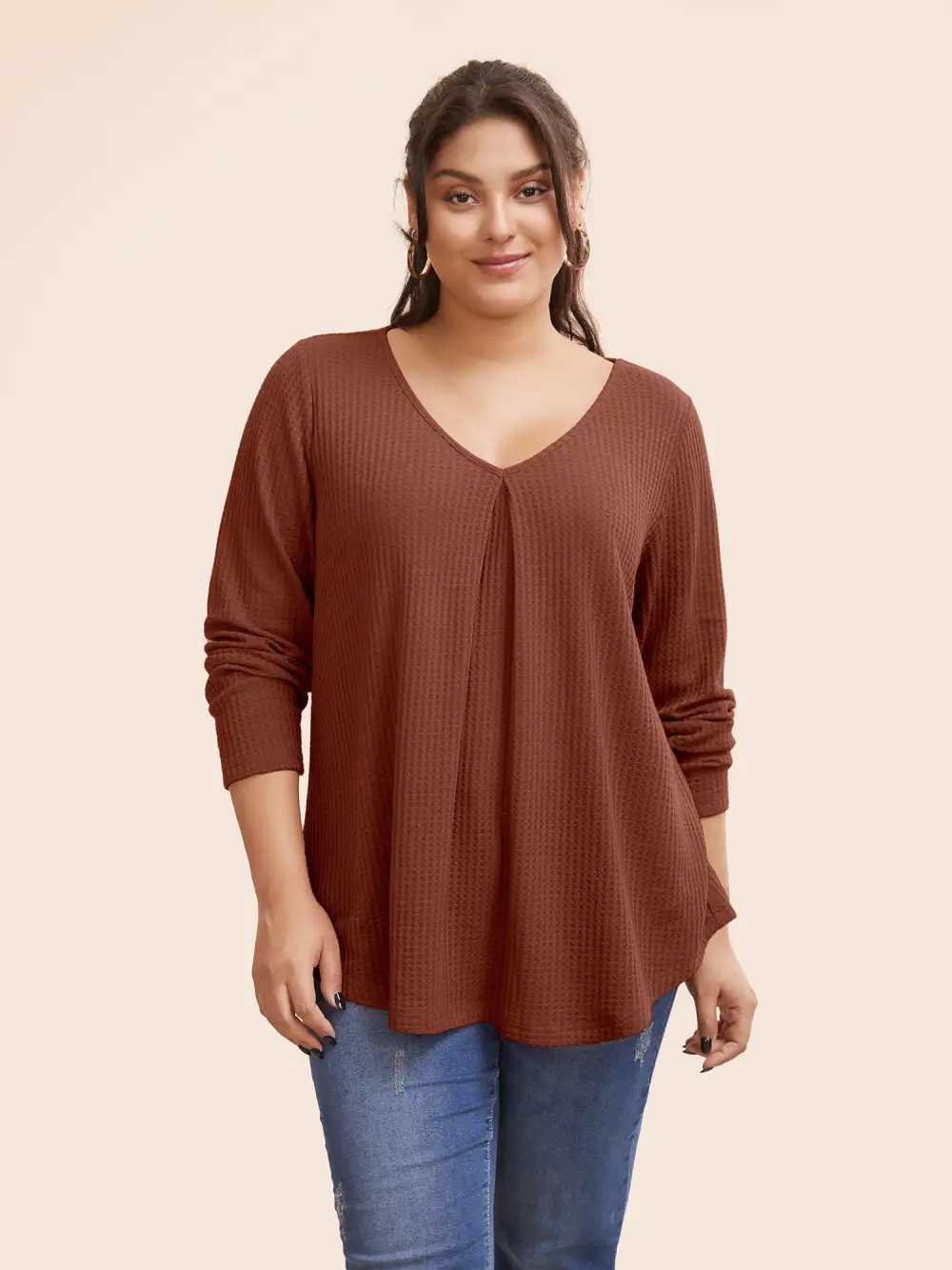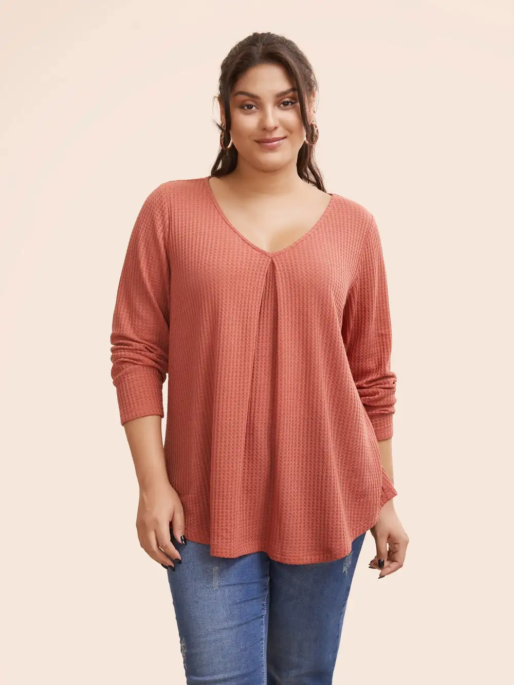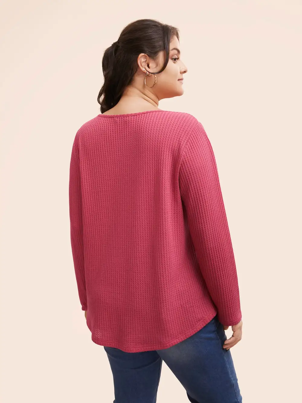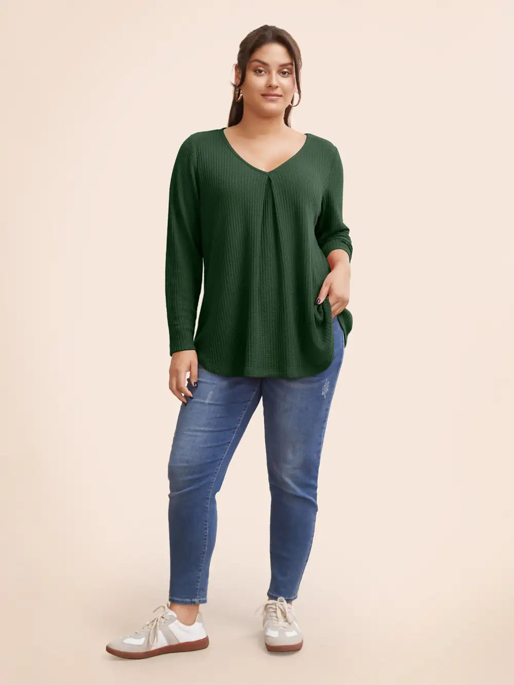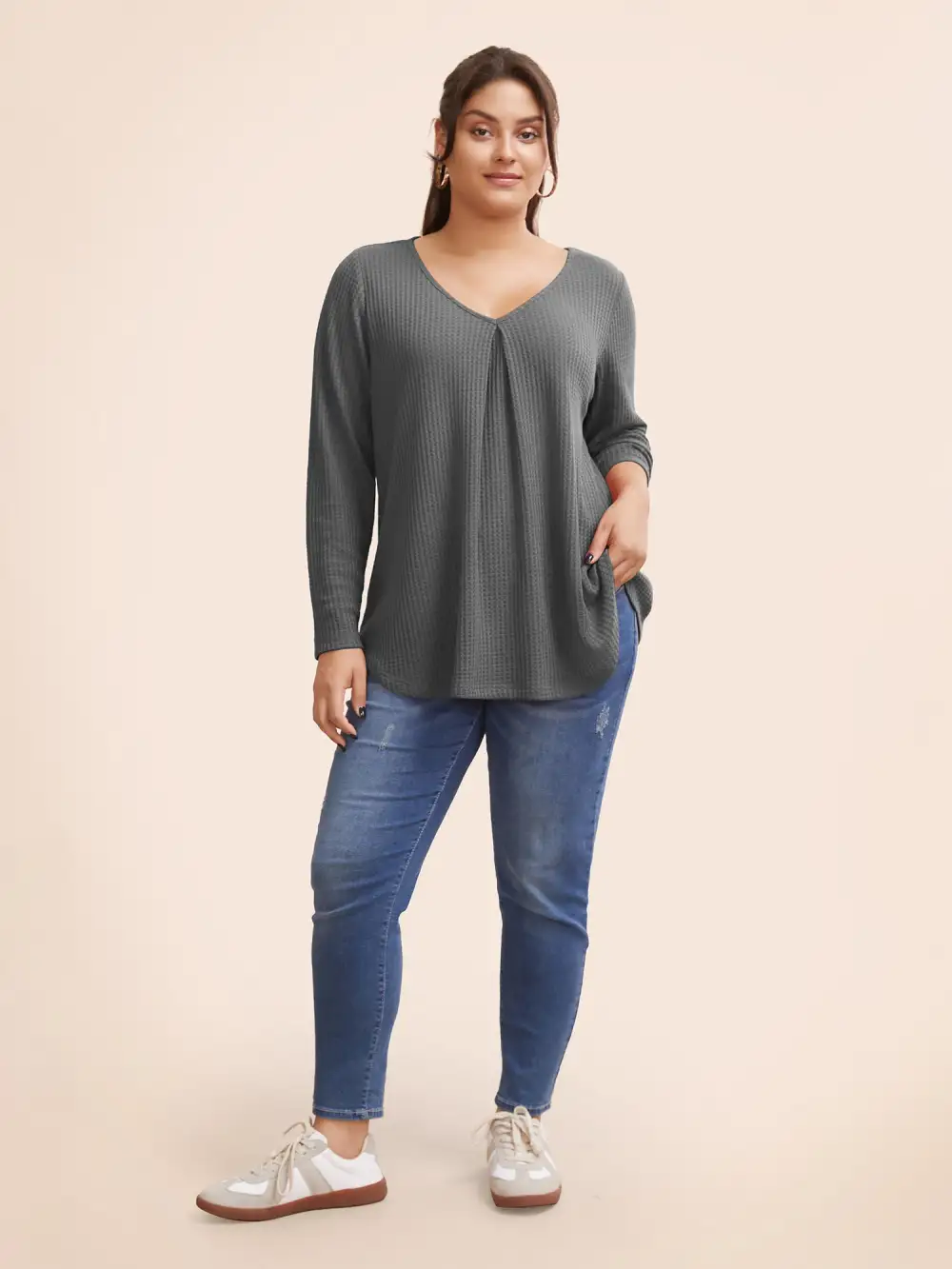 Plain Waffle Knit Scoop Neck Plicated Detail T-Shirt