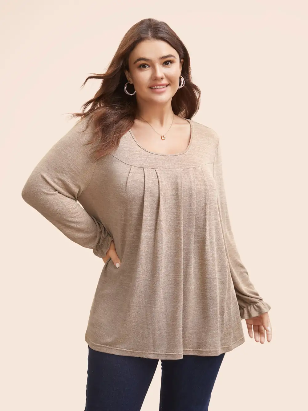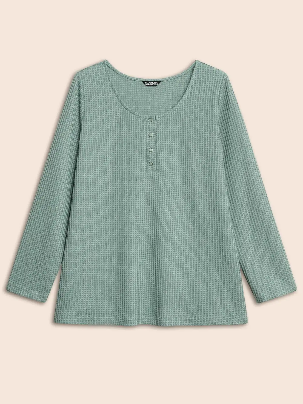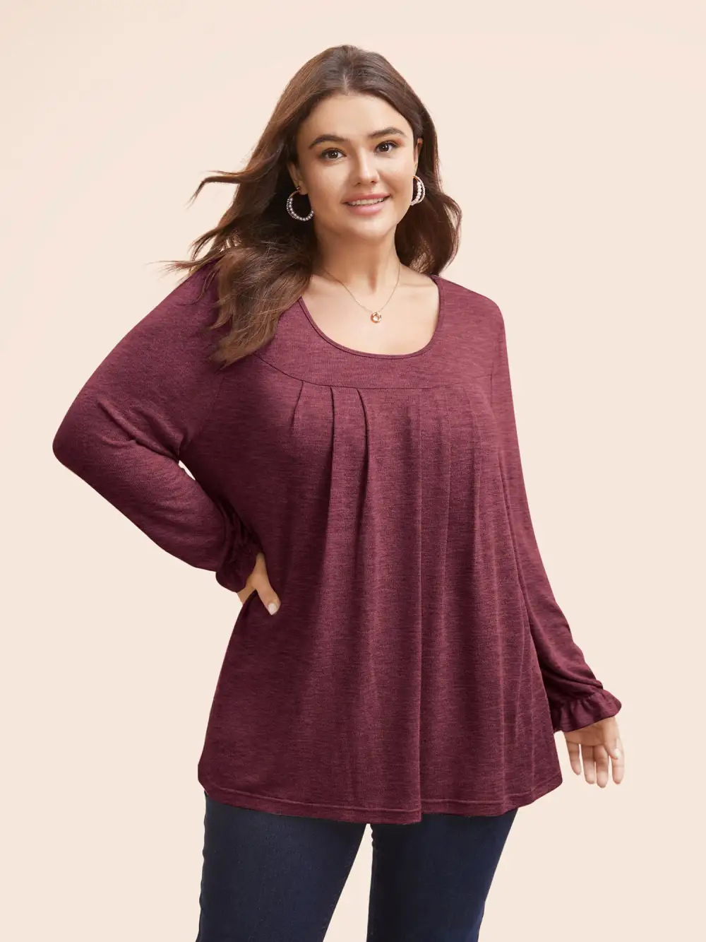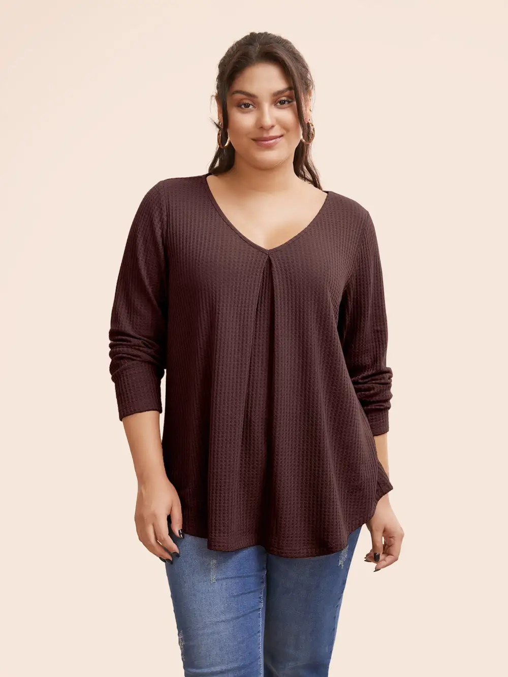 Plain Waffle Knit Scoop Neck Plicated Detail T-Shirt