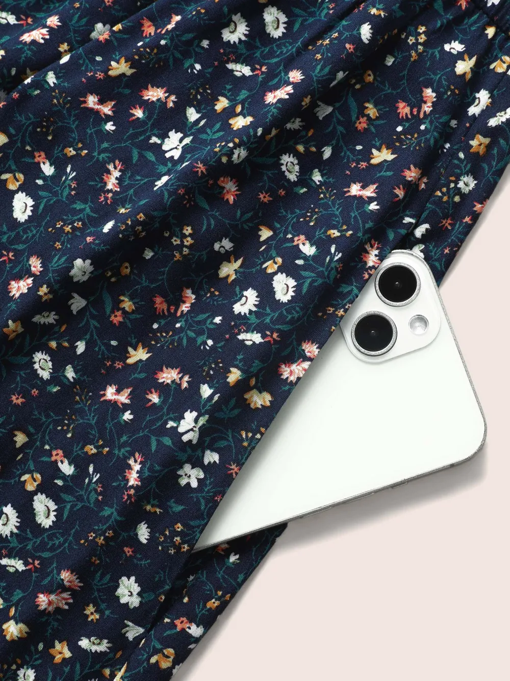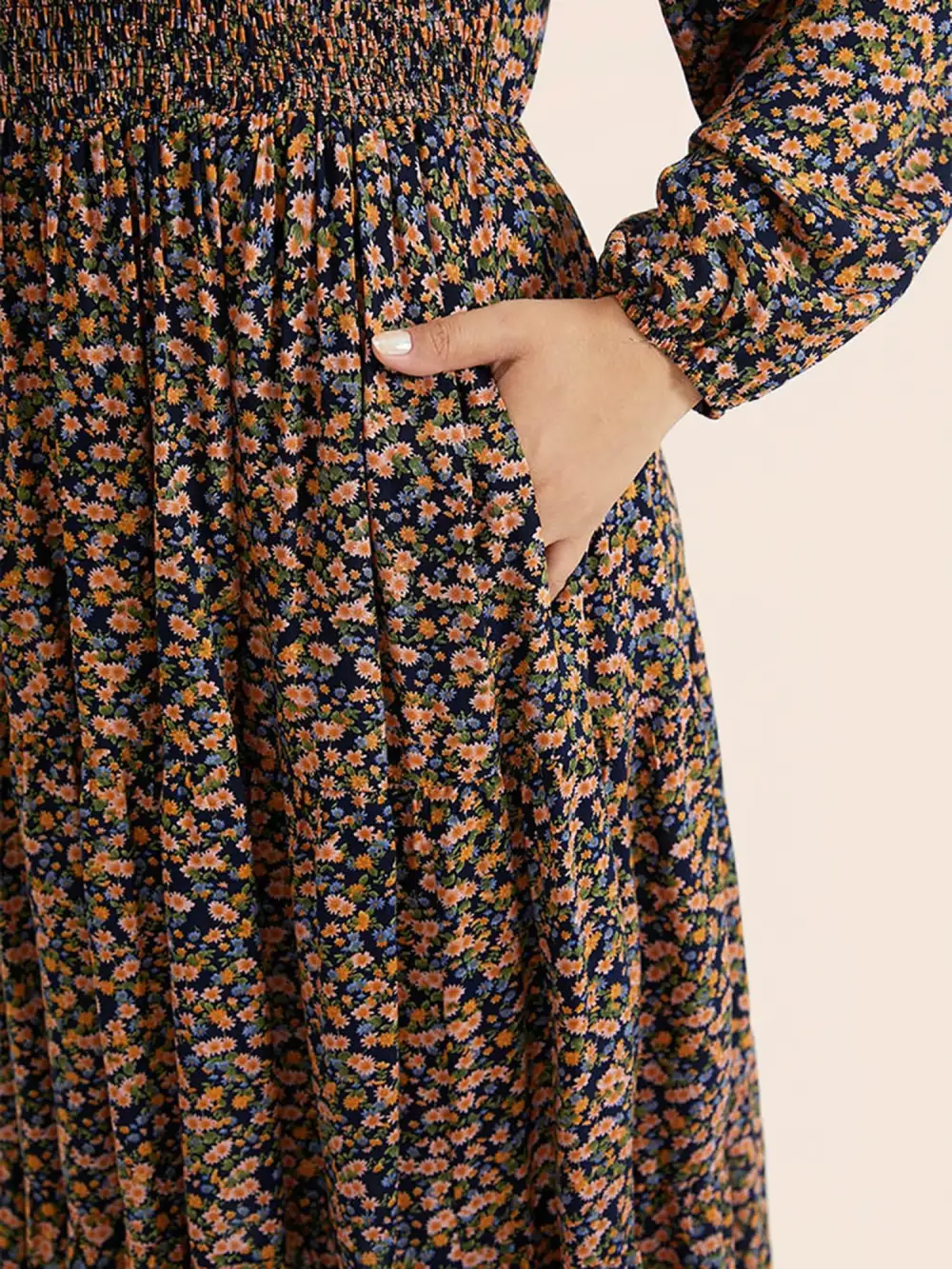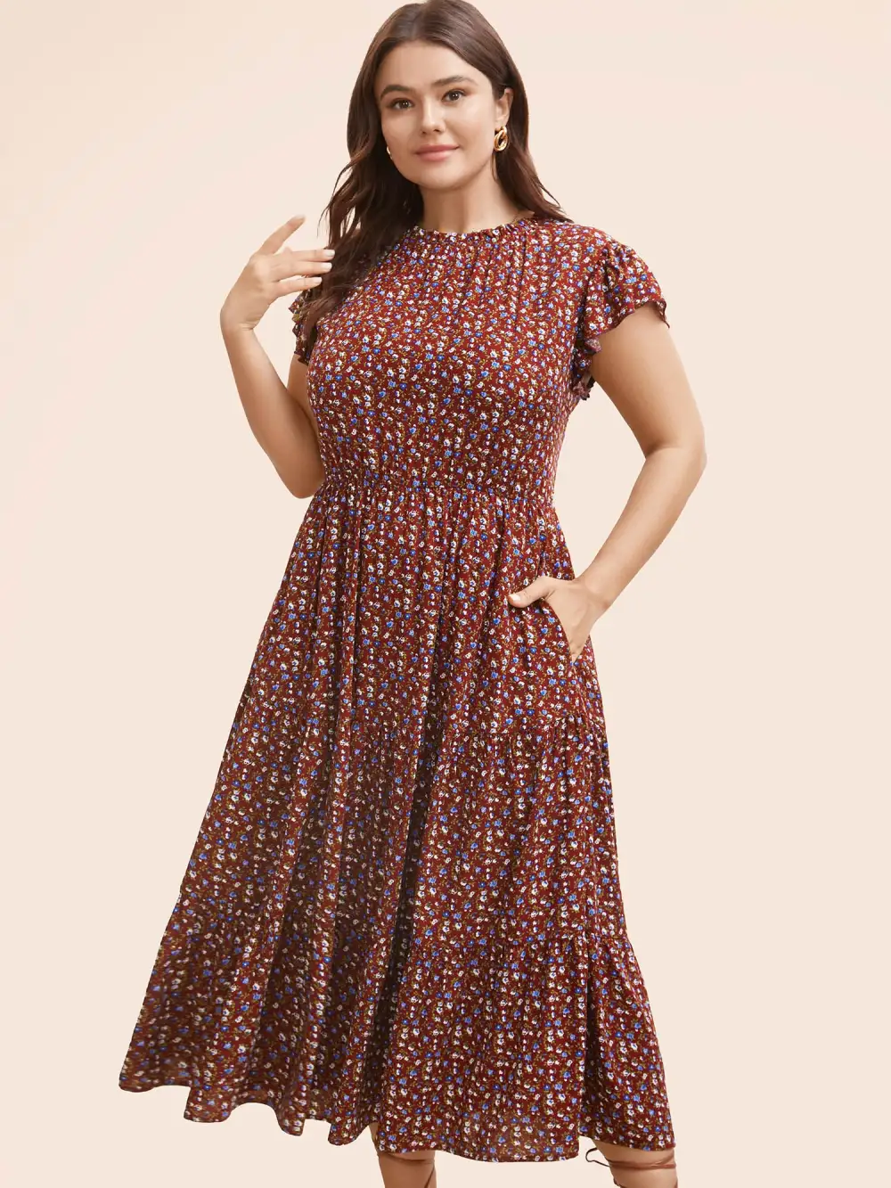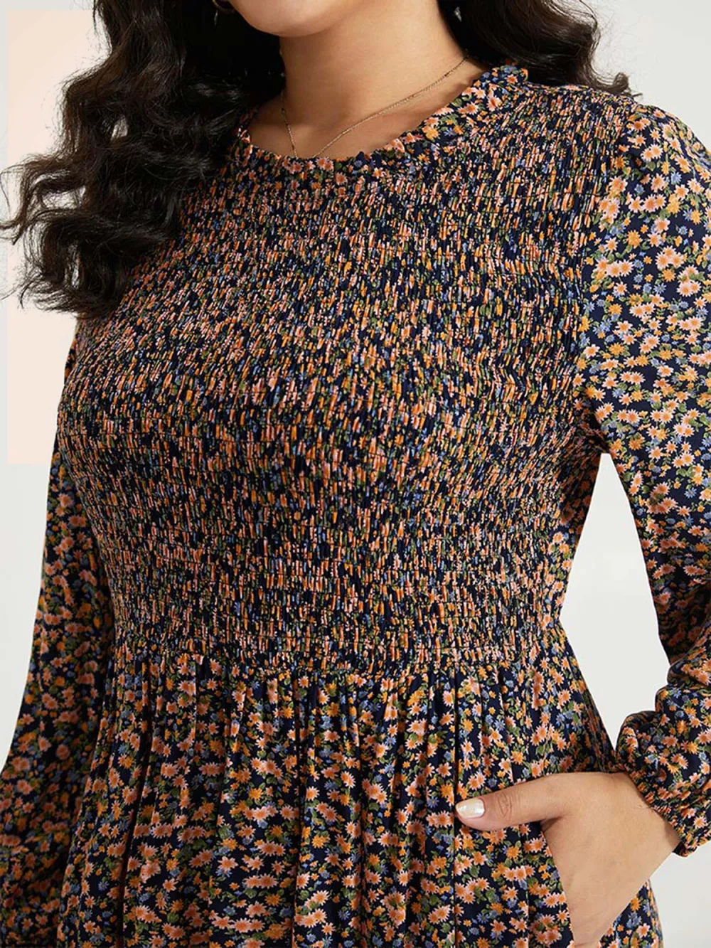 Ditsy Floral Shirred Pocket Pleated Frill Trim Dress