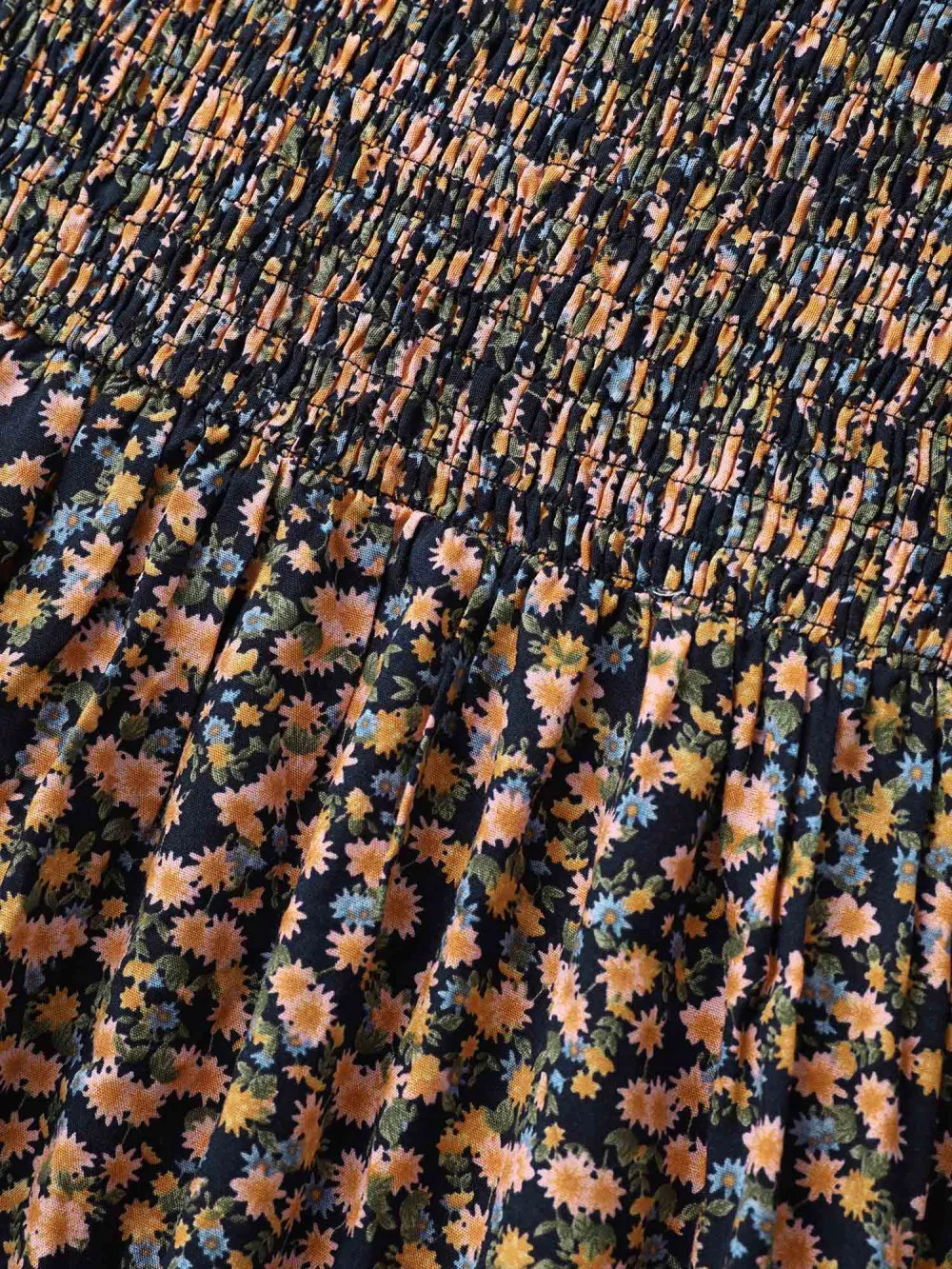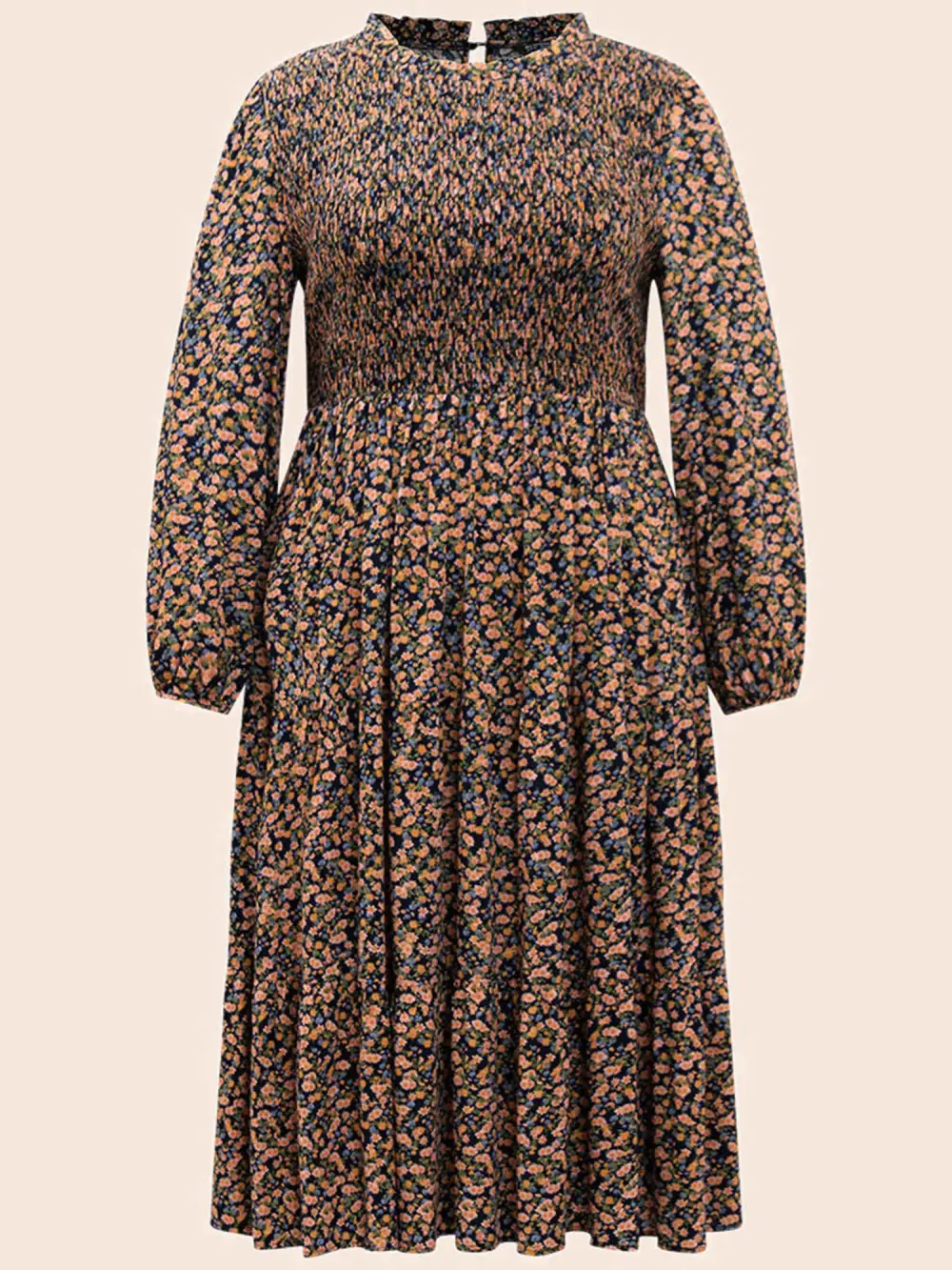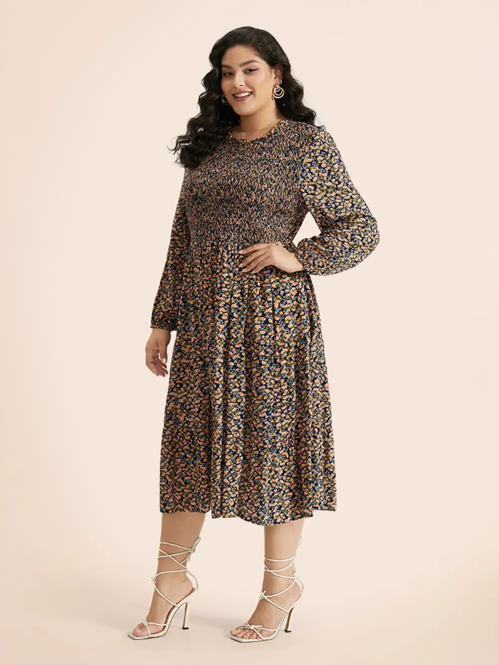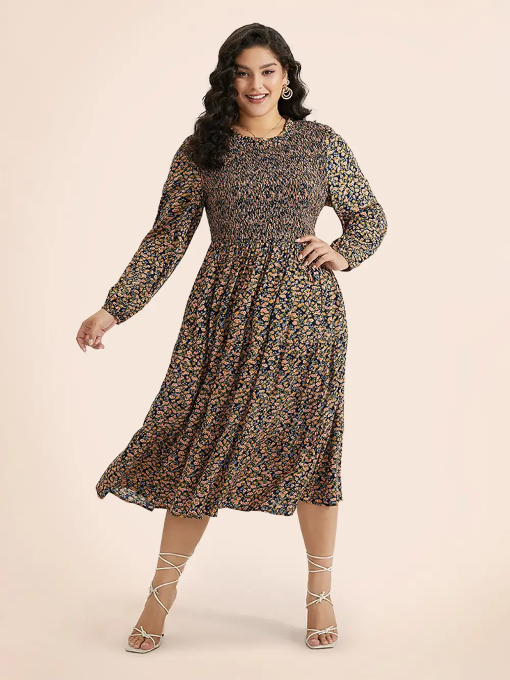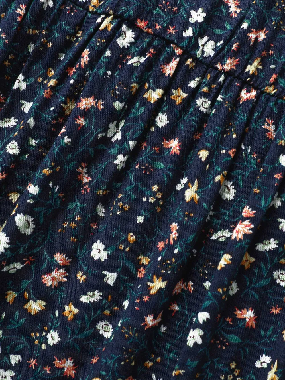 Ditsy Floral Shirred Pocket Pleated Frill Trim Dress