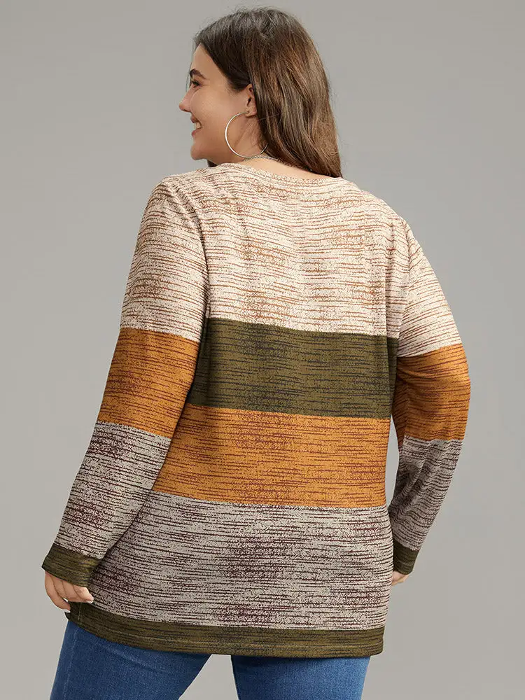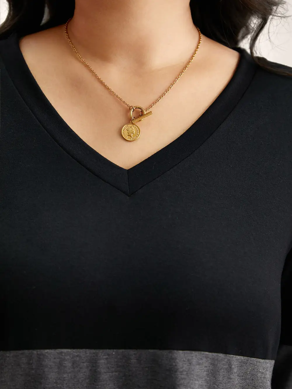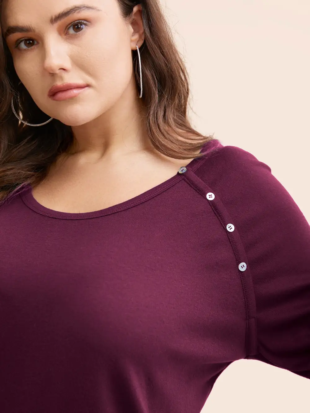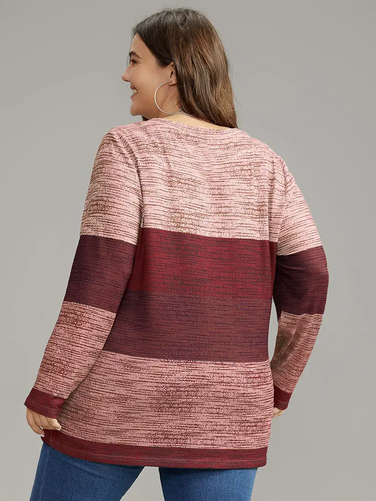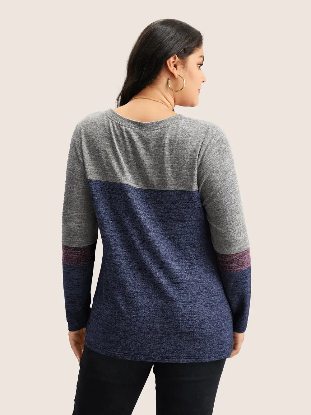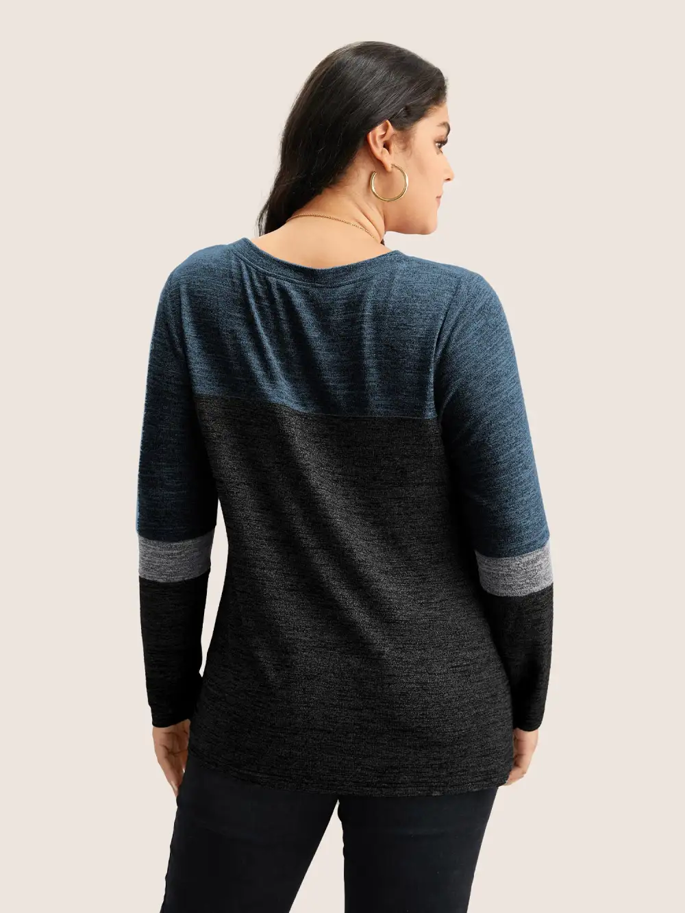 Contrast Patchwork Crew Neck Button Detail T-Shirt