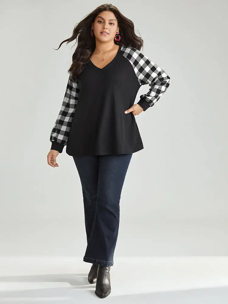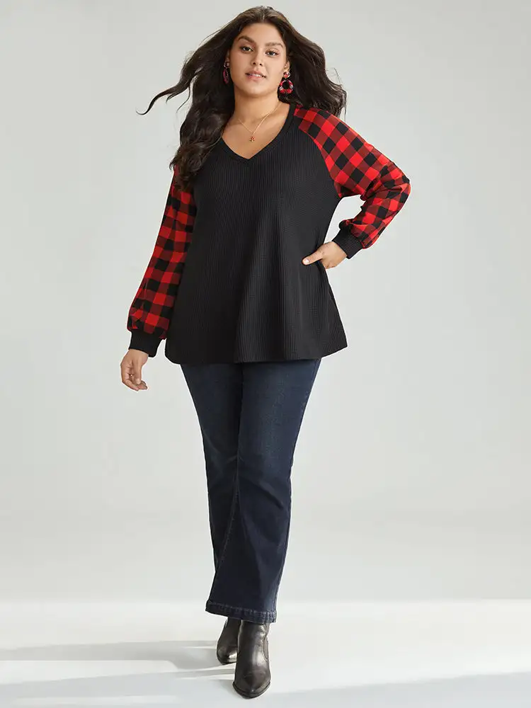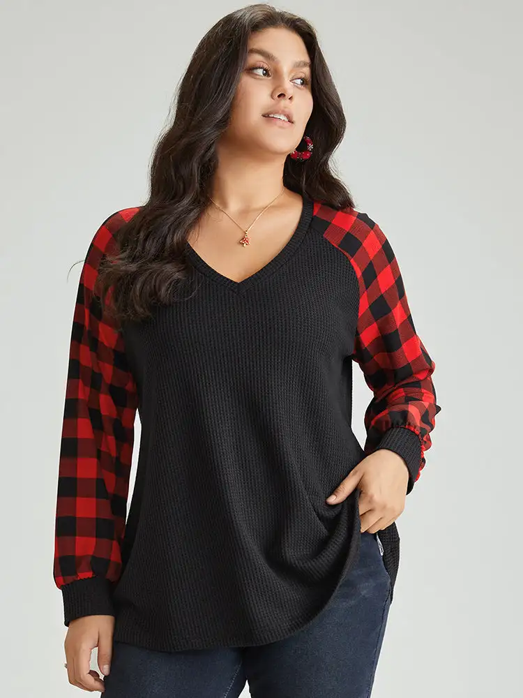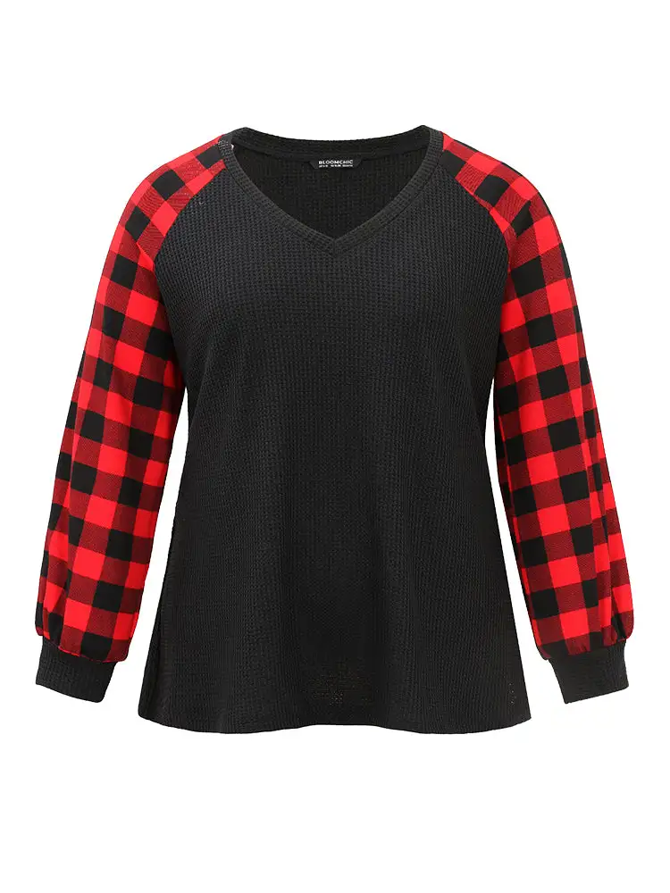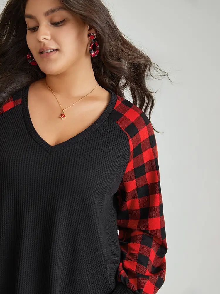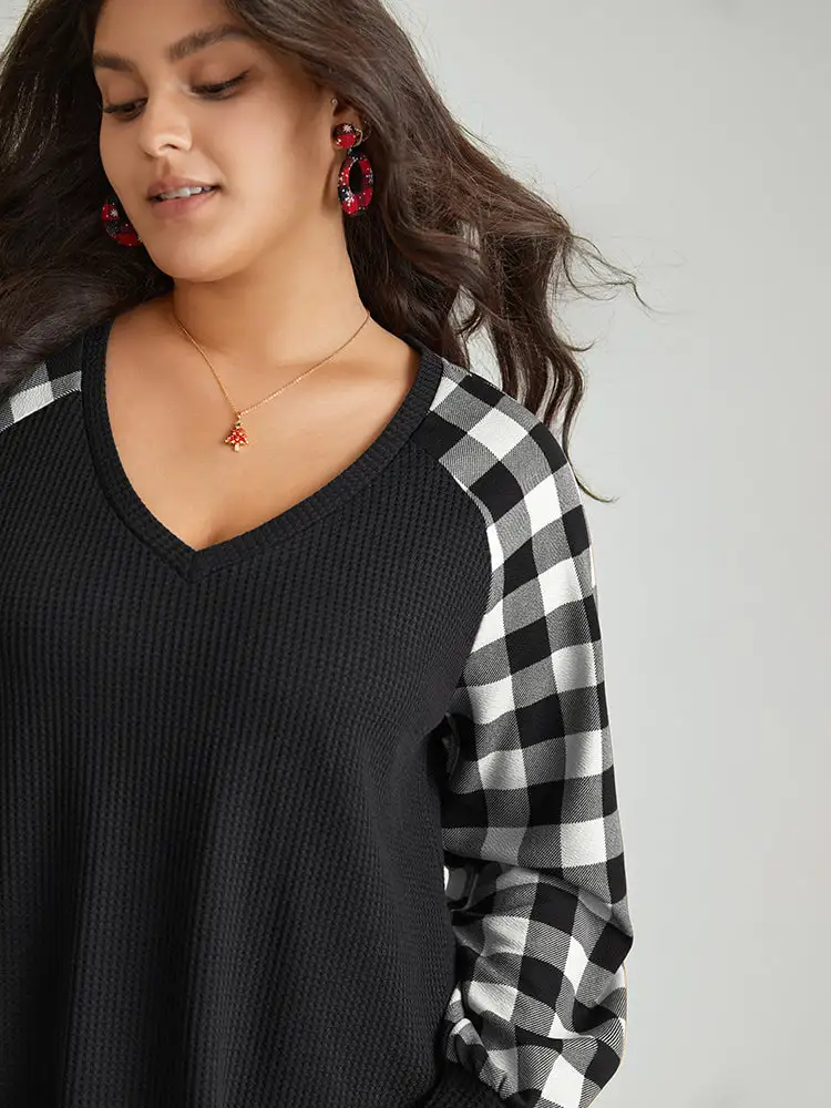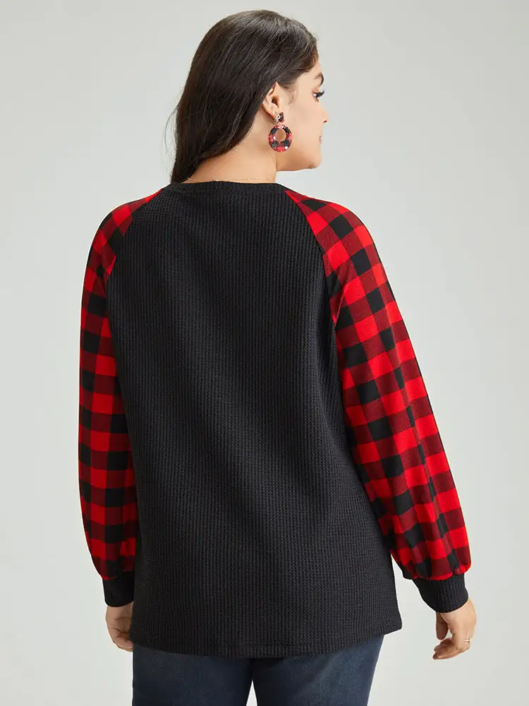 Waffle Knit Plaid Patchwork Raglan Sleeve T-Shirt