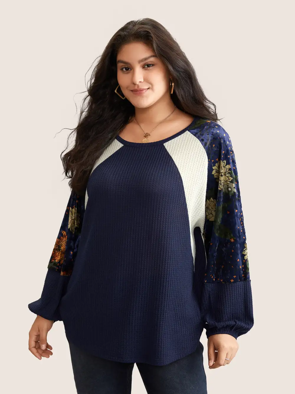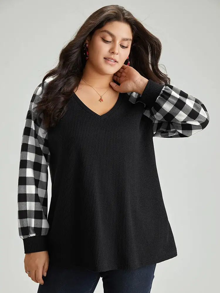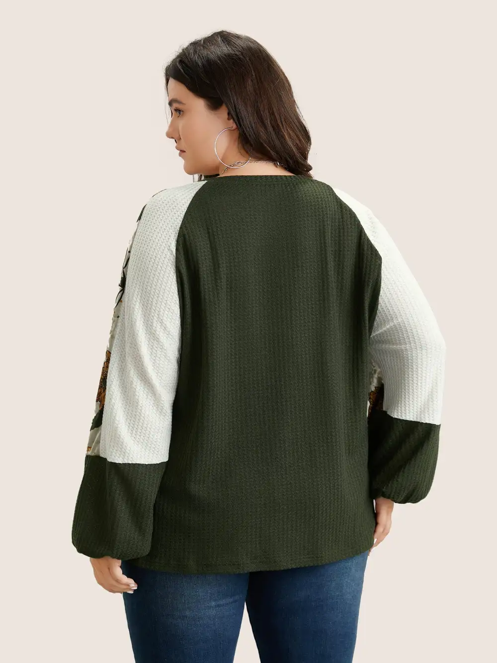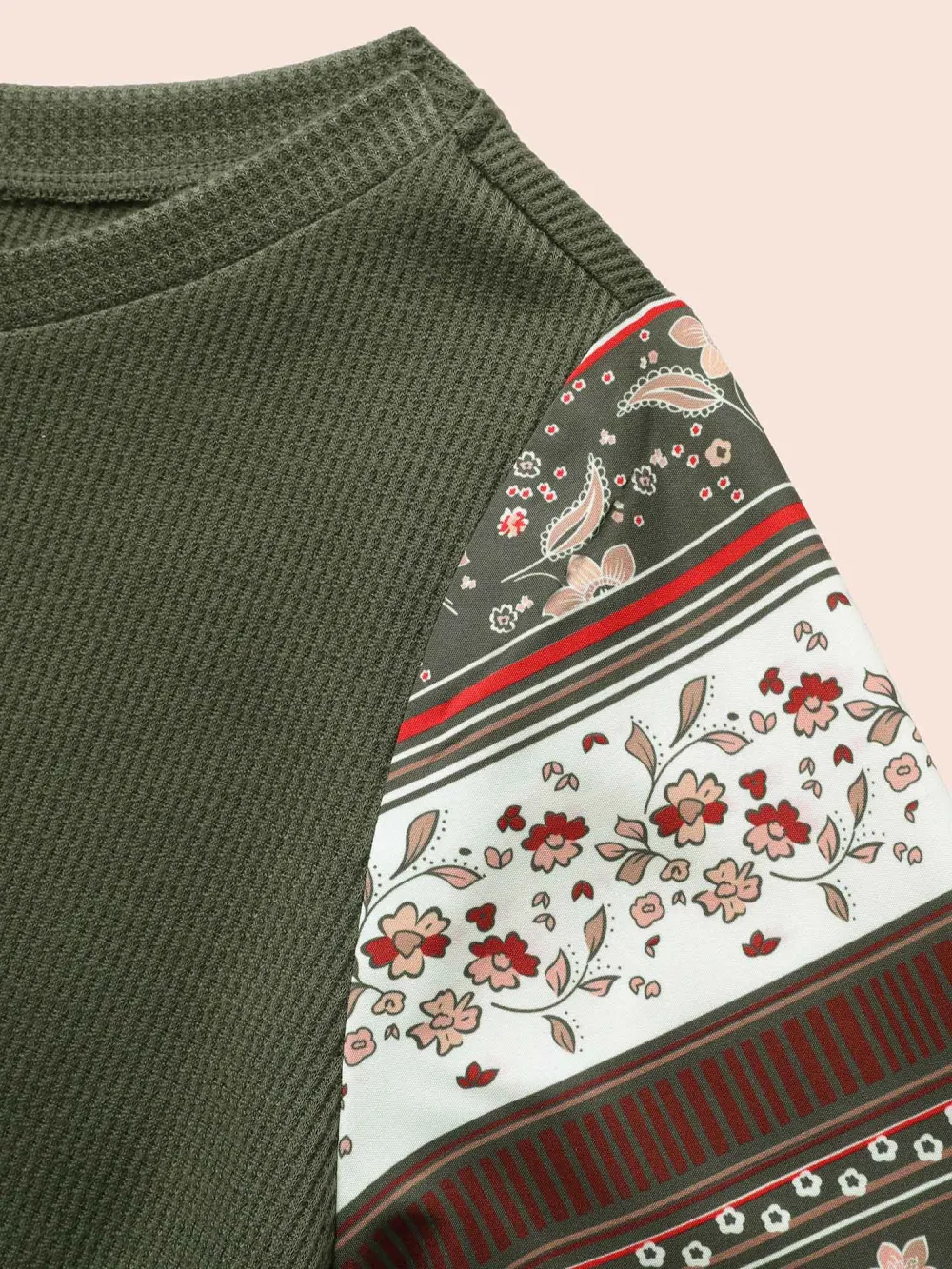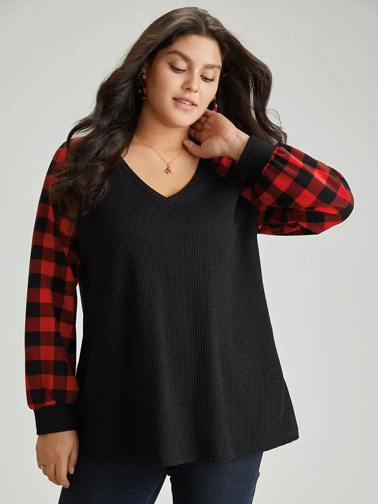 Waffle Knit Plaid Patchwork Raglan Sleeve T-Shirt