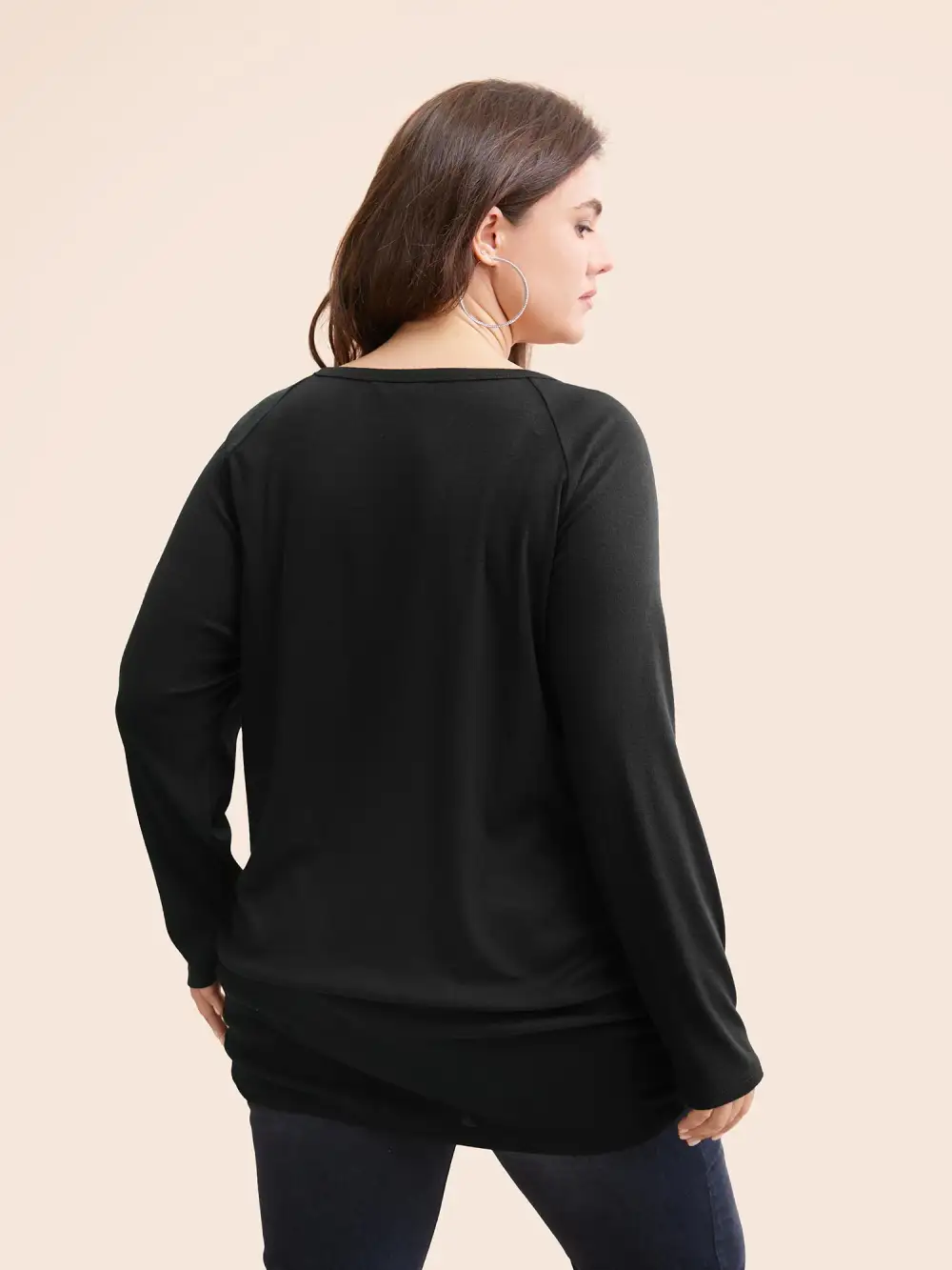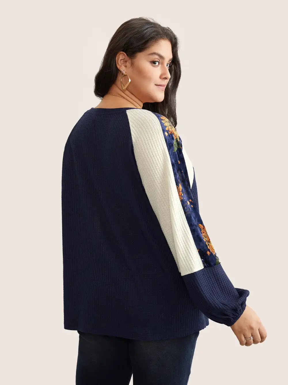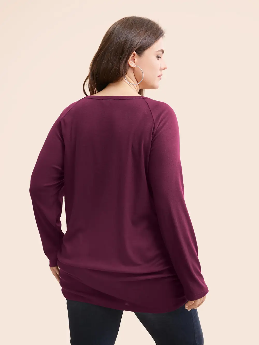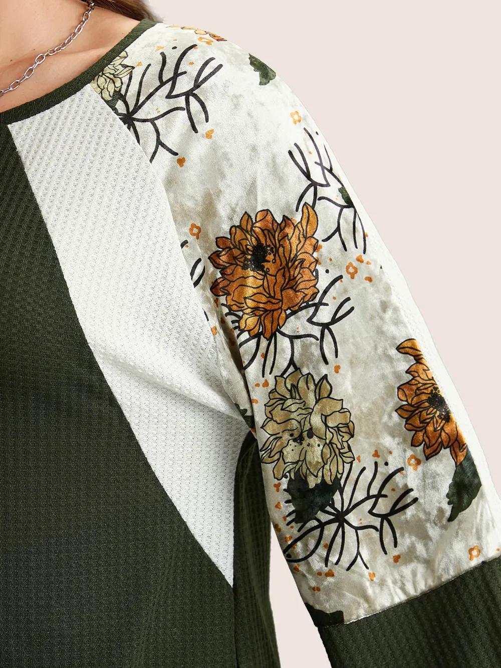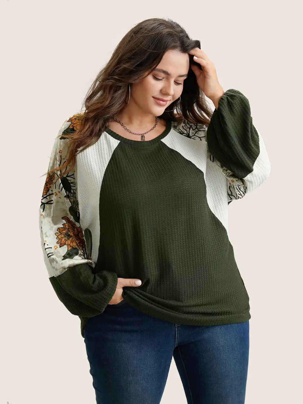 Waffle Knit Plaid Patchwork Raglan Sleeve T-Shirt