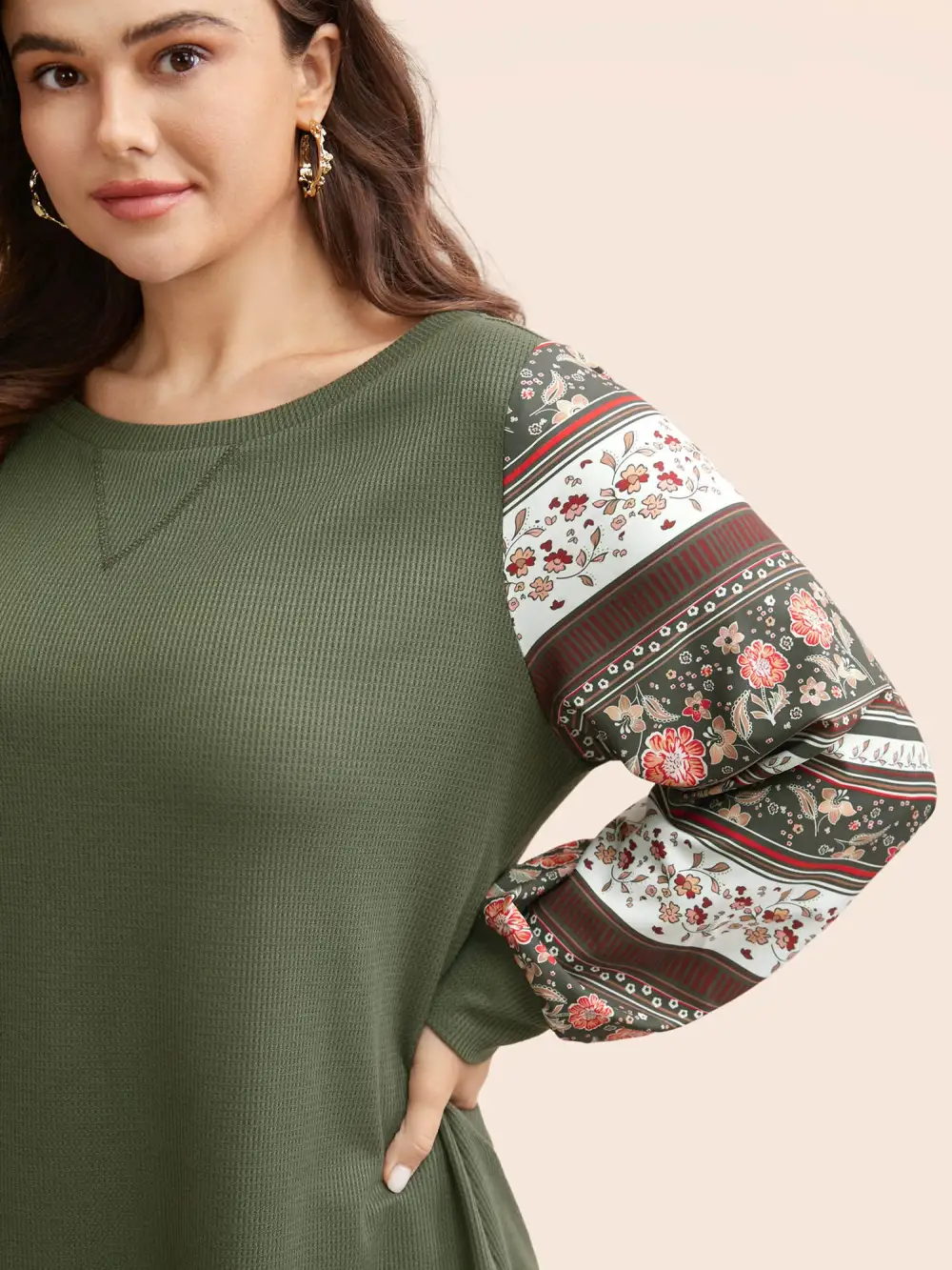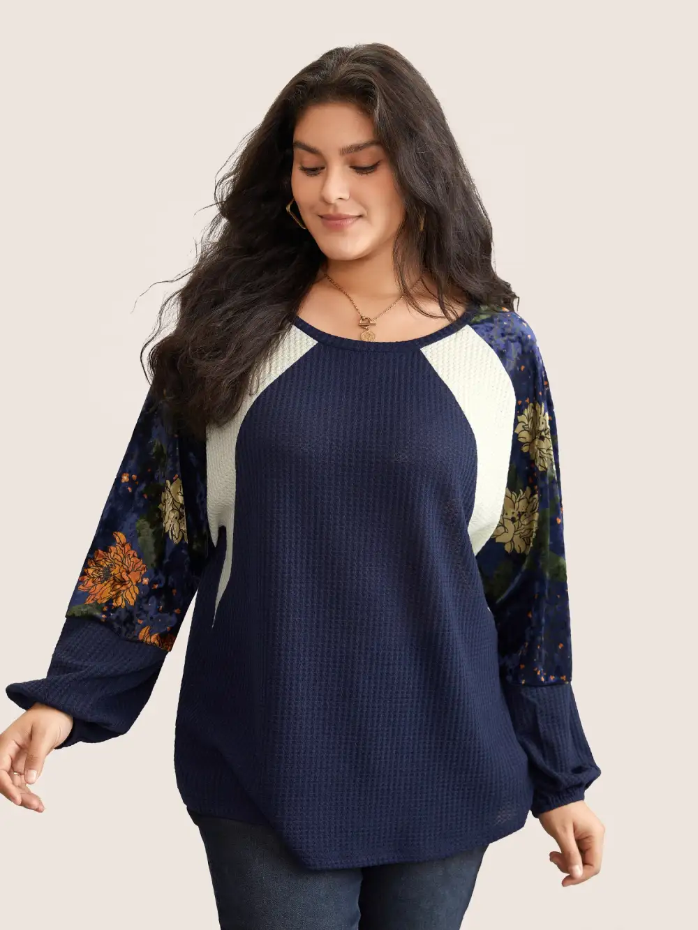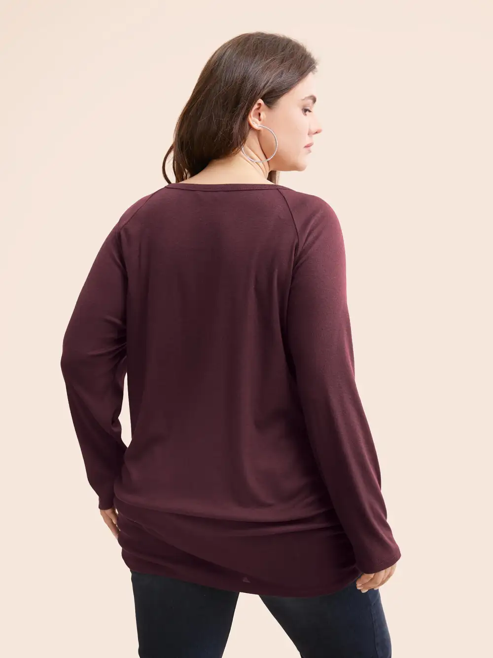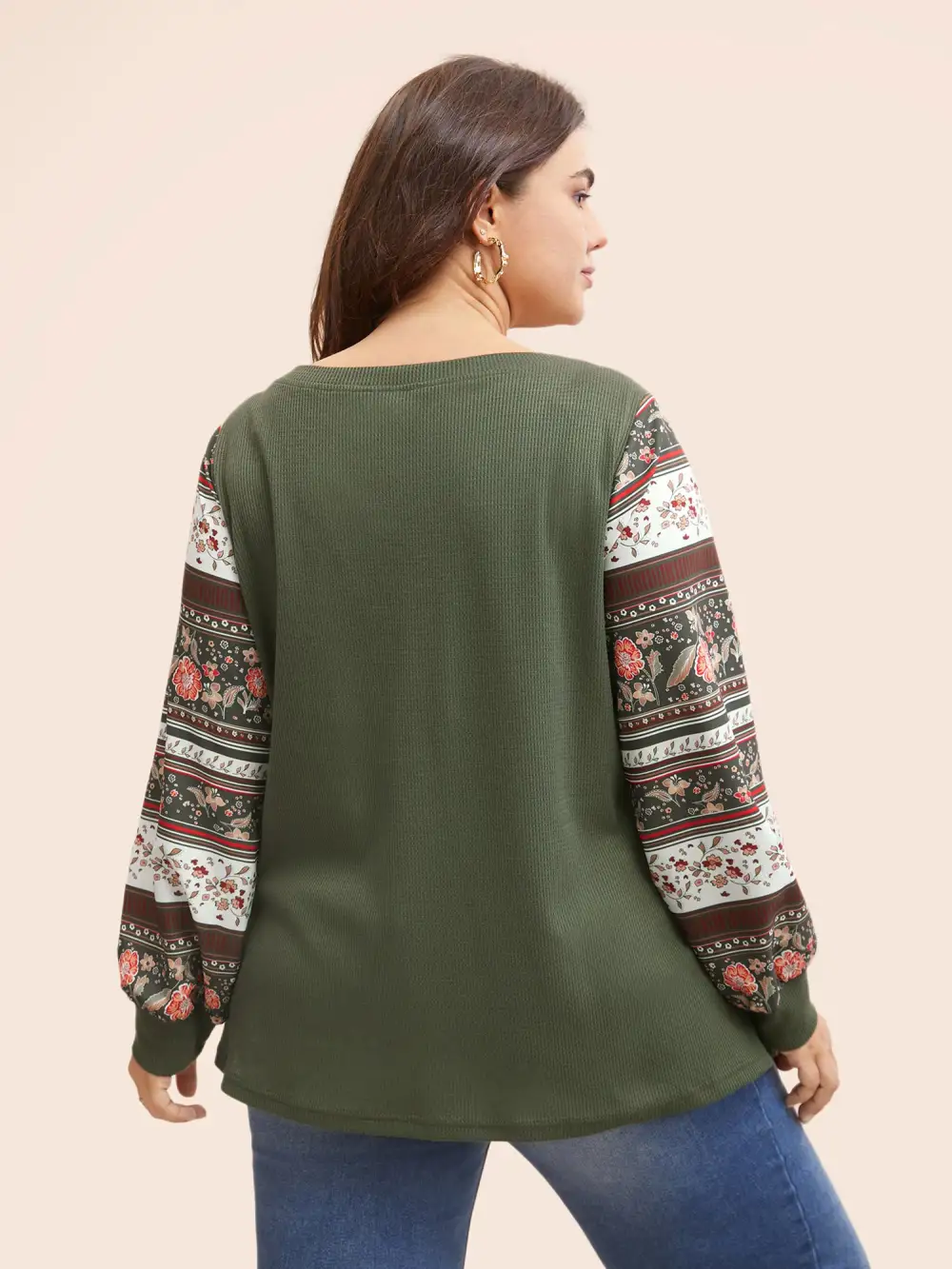 Waffle Knit Plaid Patchwork Raglan Sleeve T-Shirt
