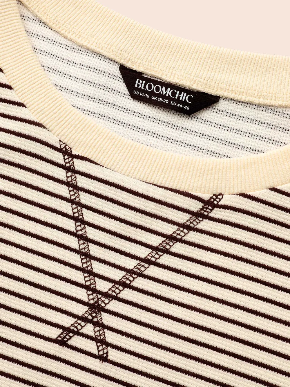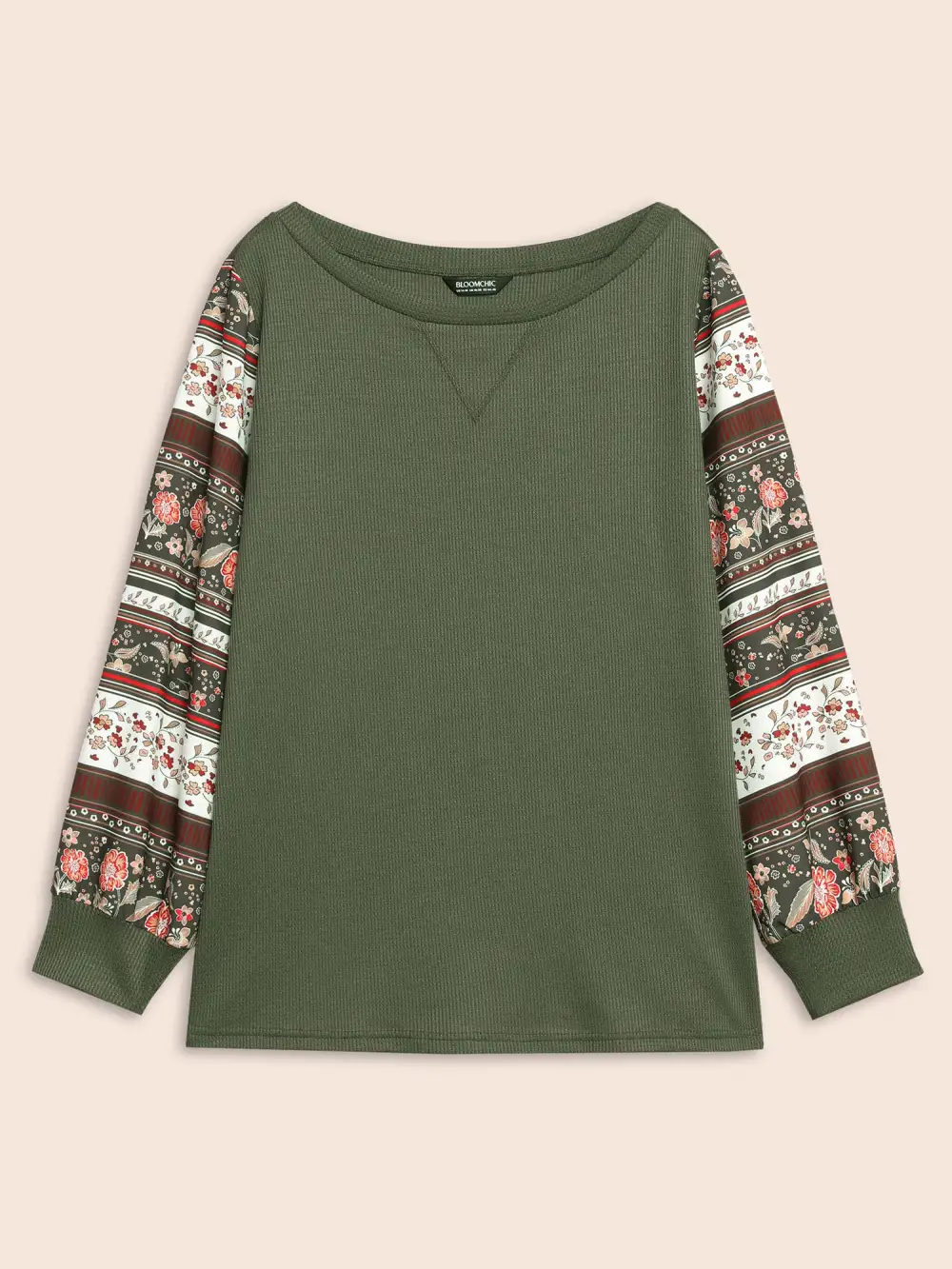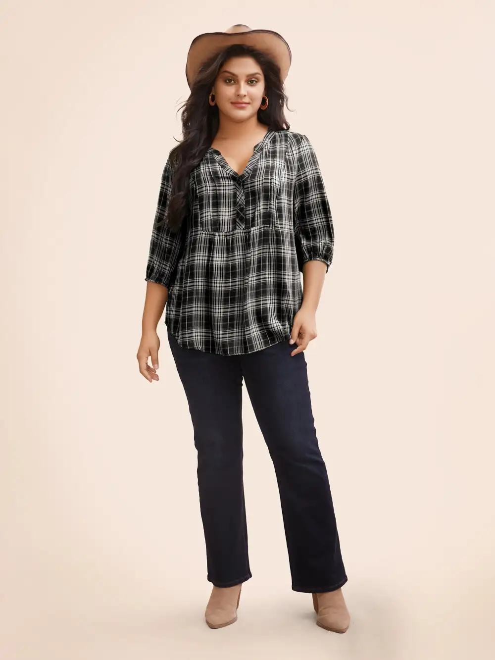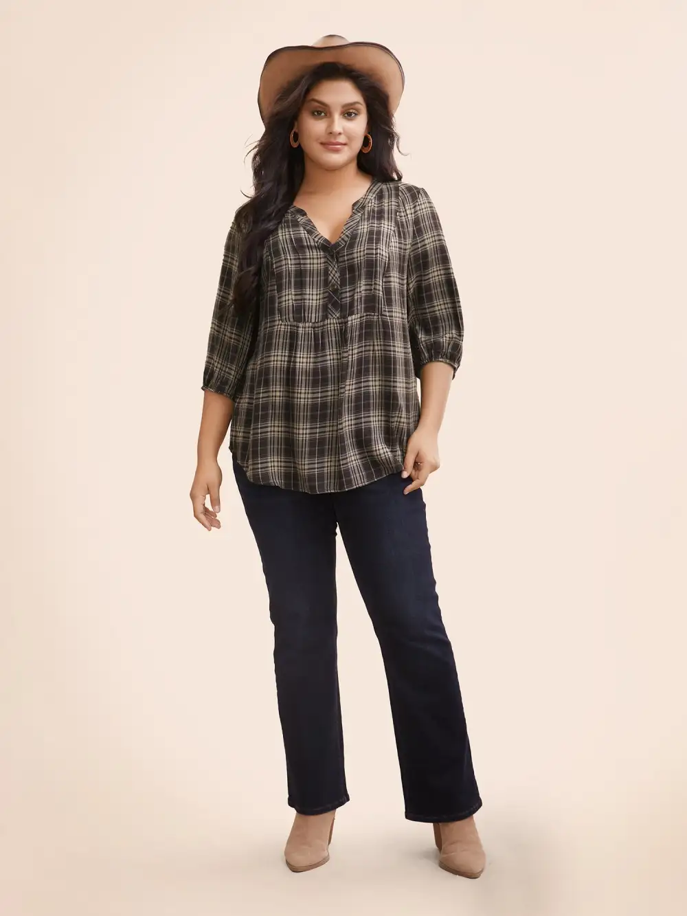 Waffle Knit Plaid Patchwork Raglan Sleeve T-Shirt