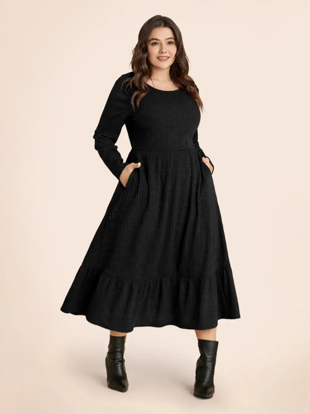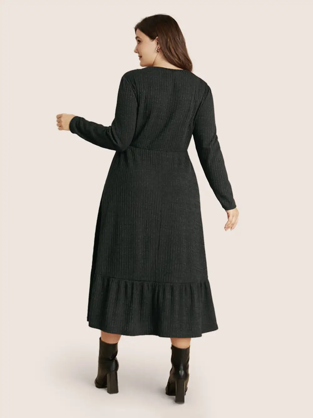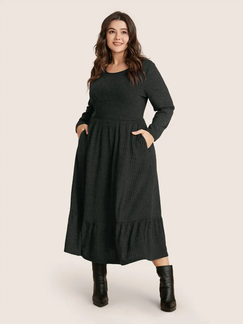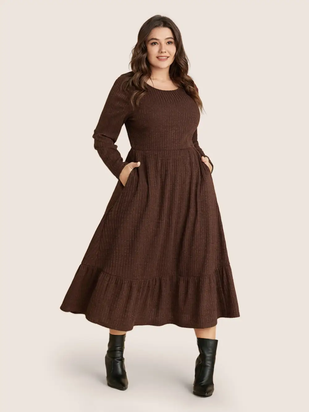 Solid Pocket Rib Knit Ruffle Hem Dress Without Belt