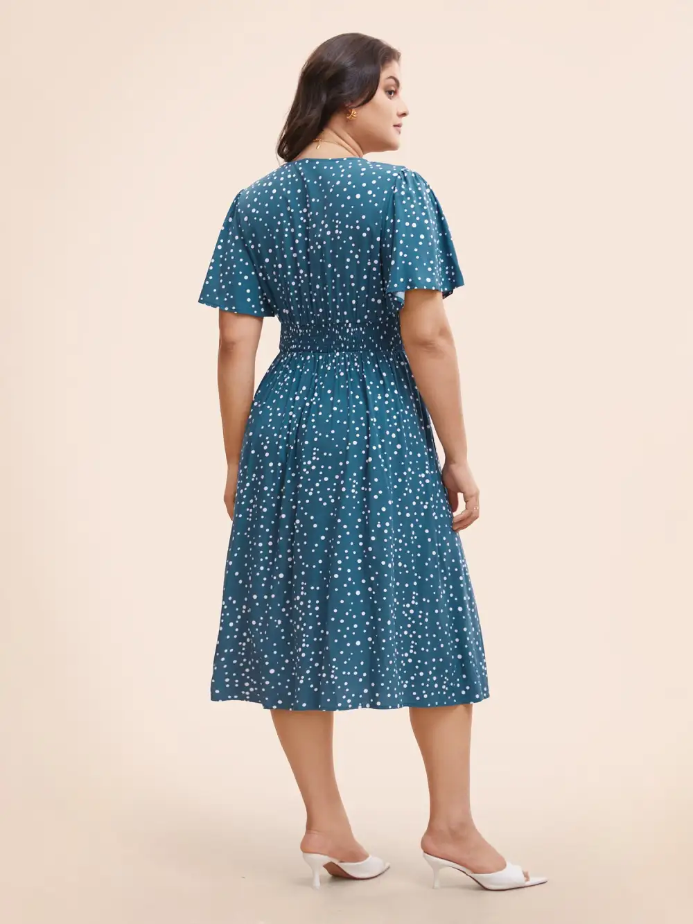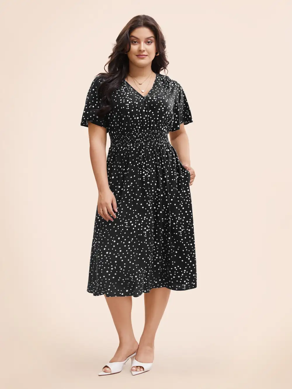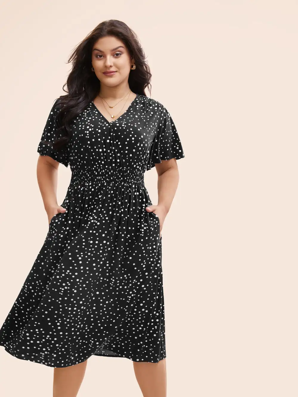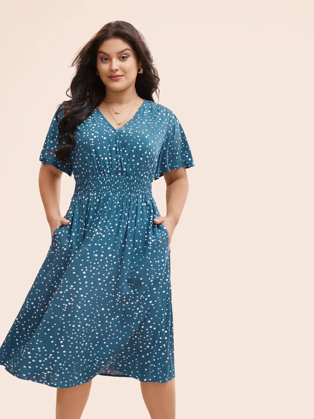 Polka Dot Wrap Pocket Shirred Ruffle Sleeve Dress