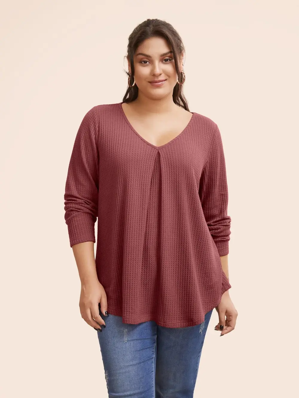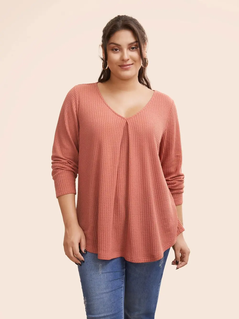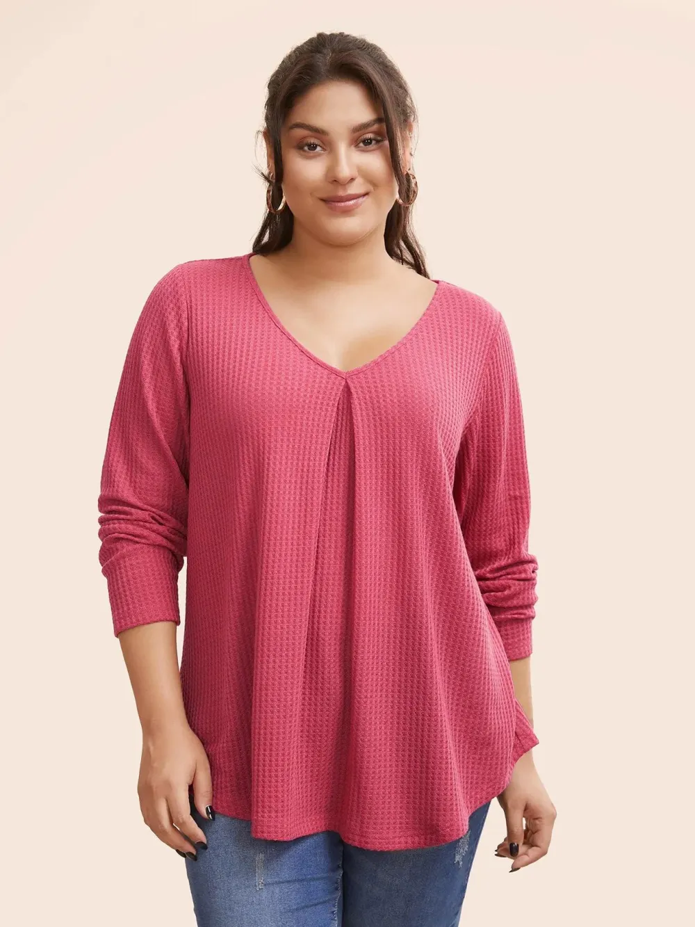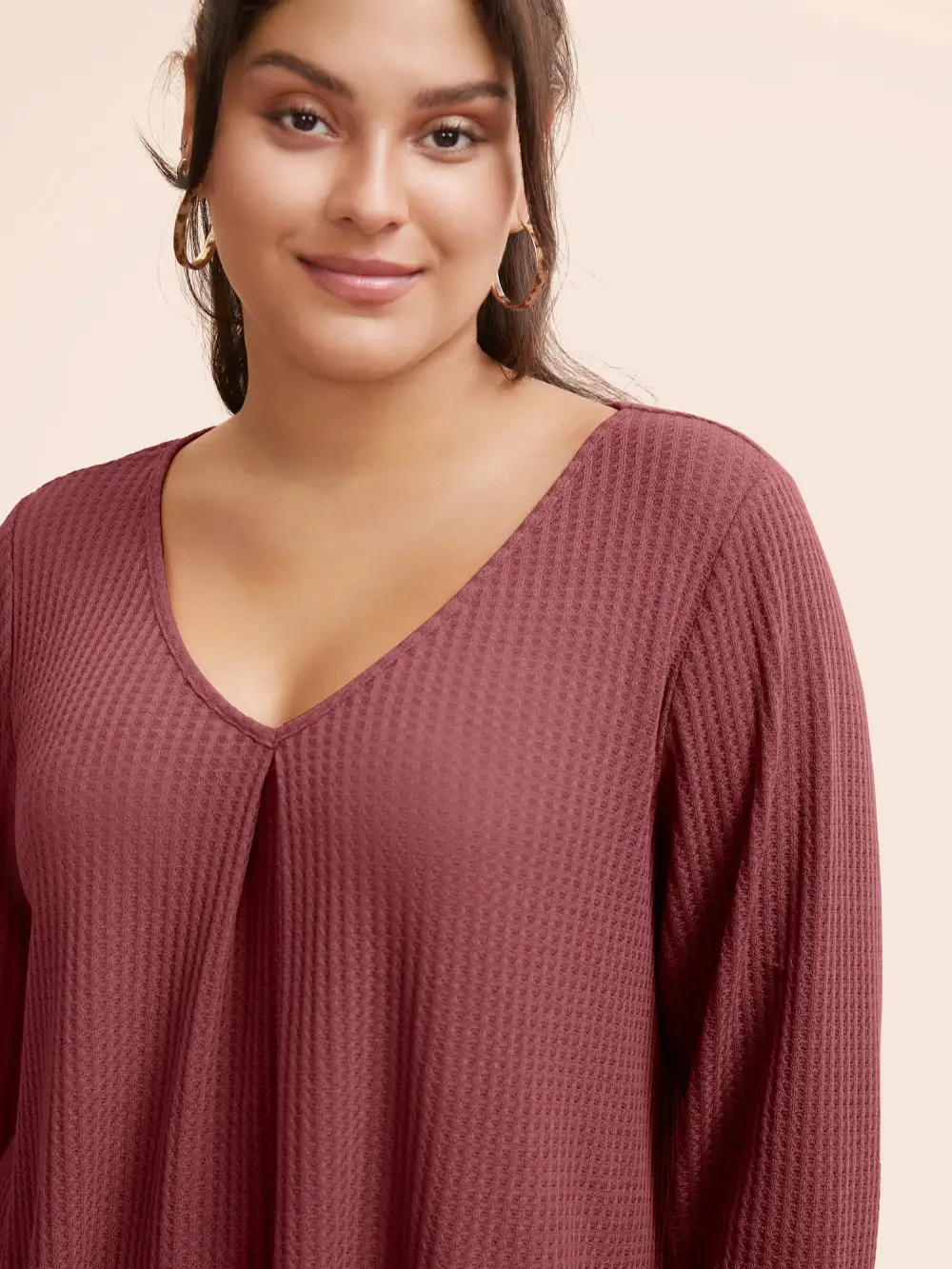 Plain Waffle Knit Scoop Neck Plicated Detail T-shirt