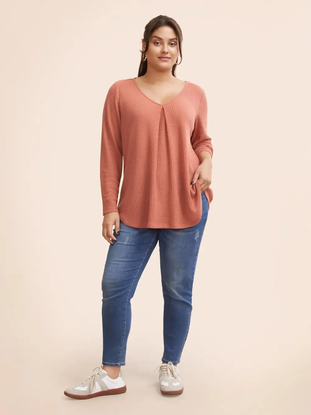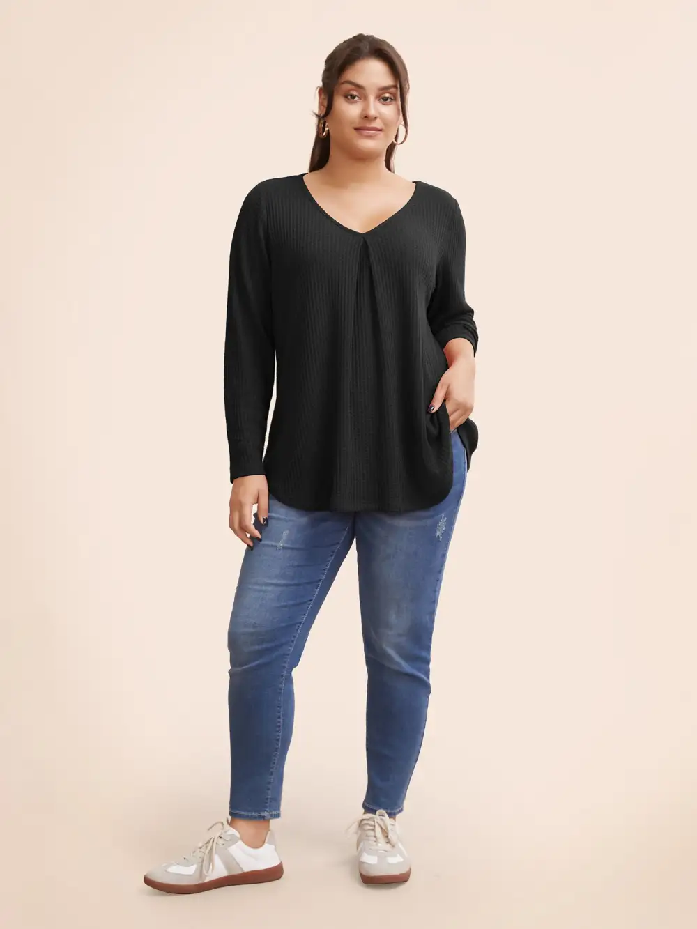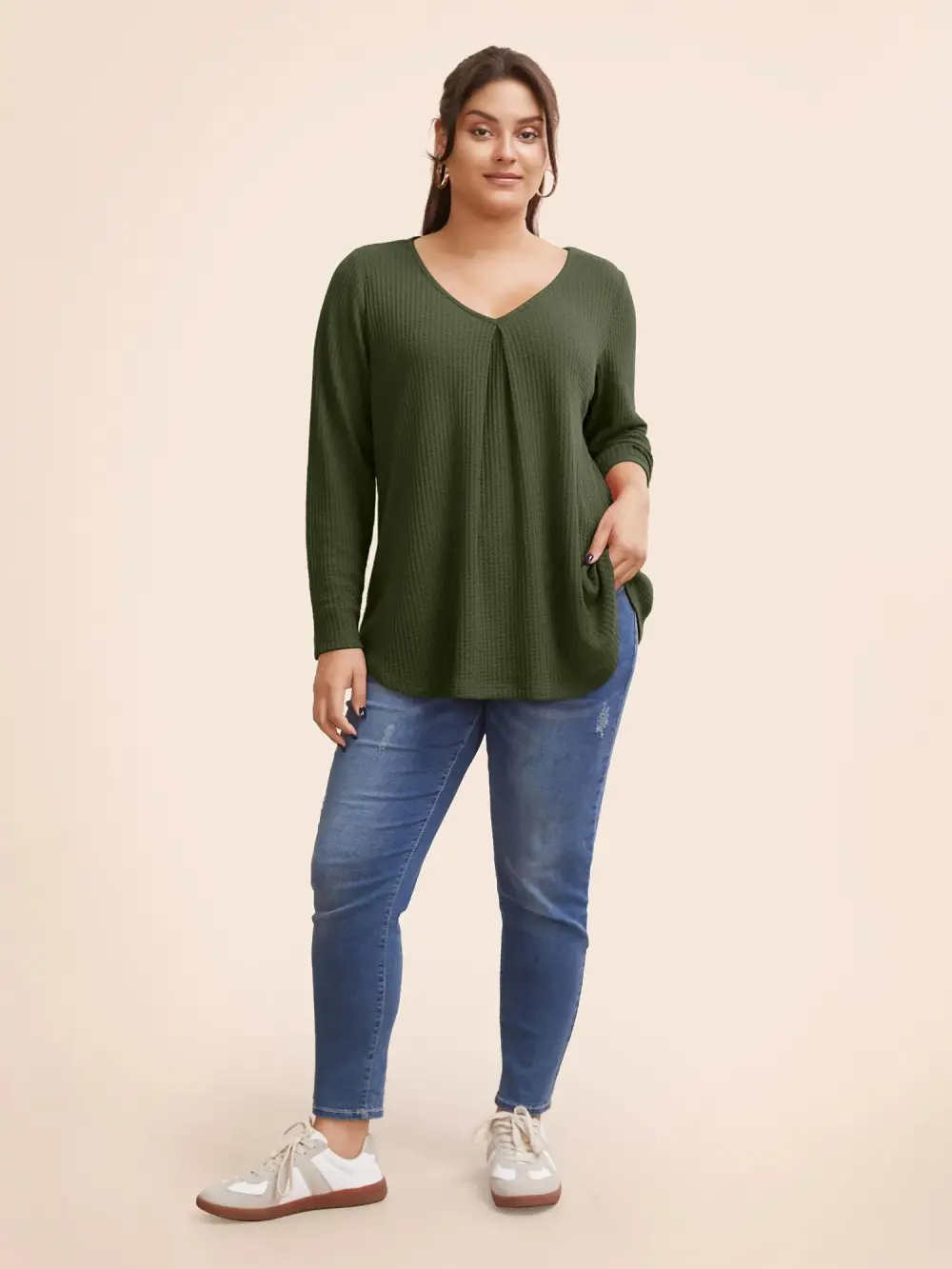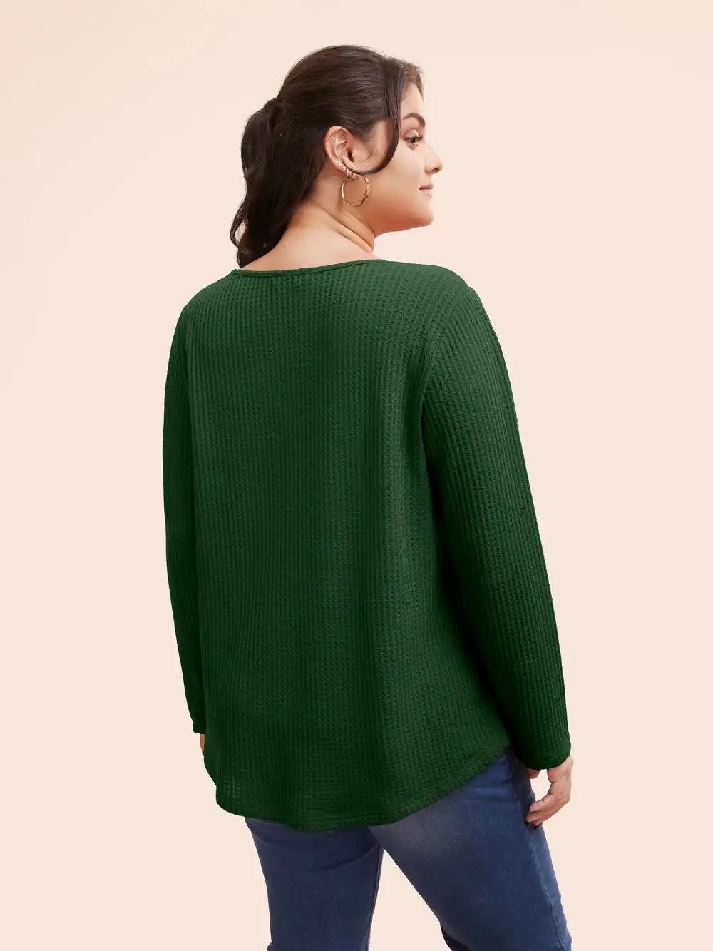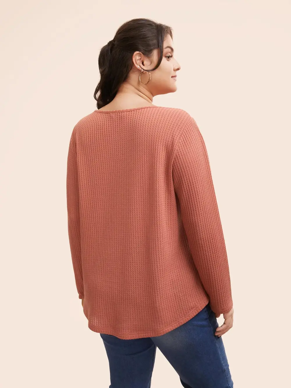 Plain Waffle Knit Scoop Neck Plicated Detail T-shirt