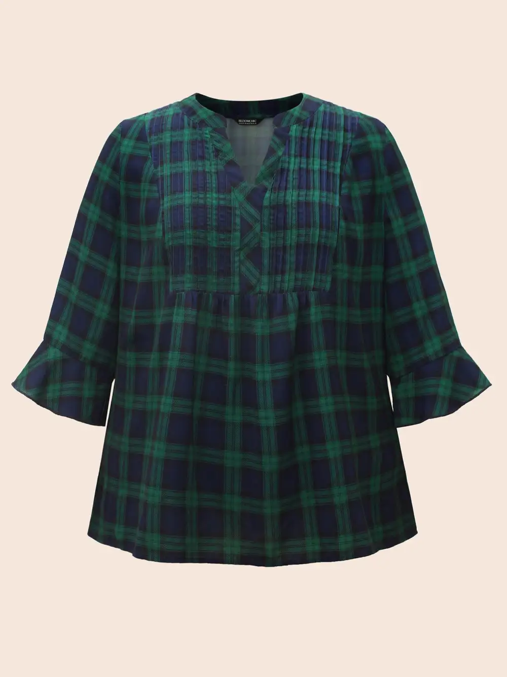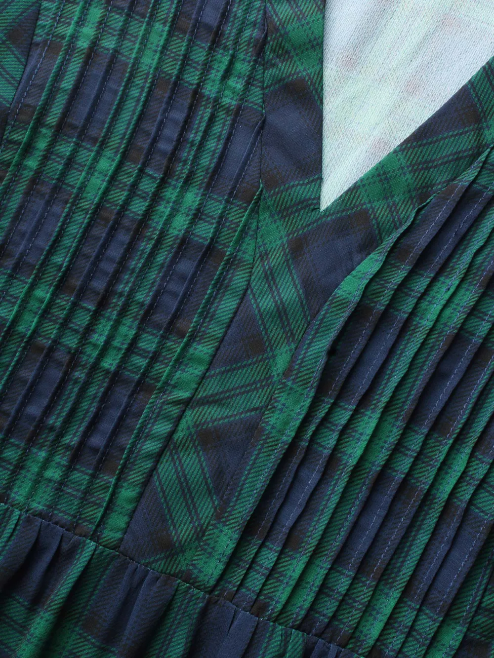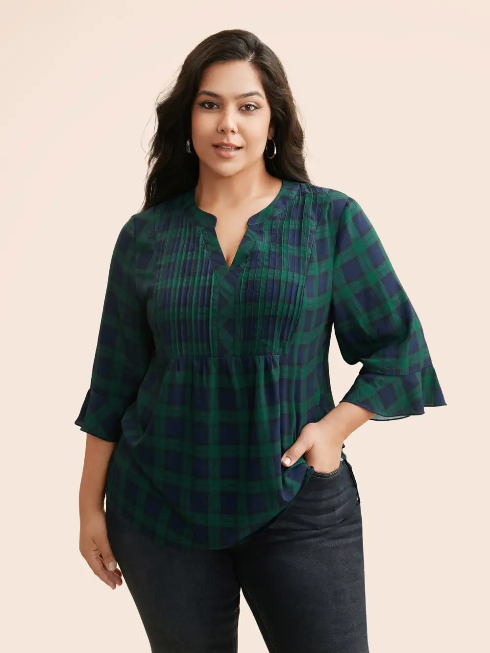 Notched Plaid Ruffles Pleated Blouse