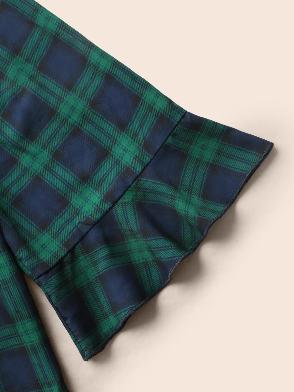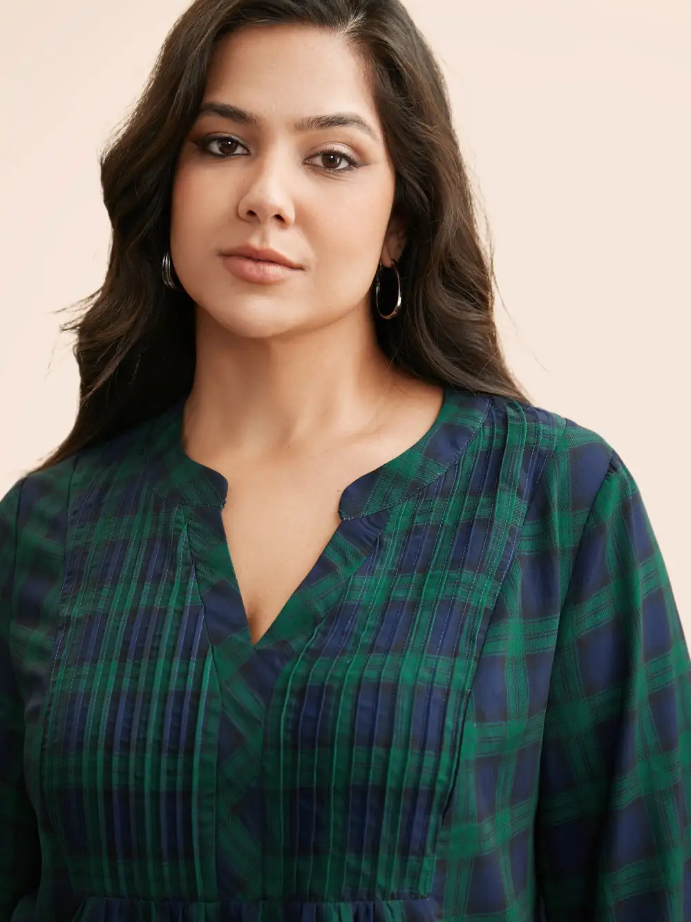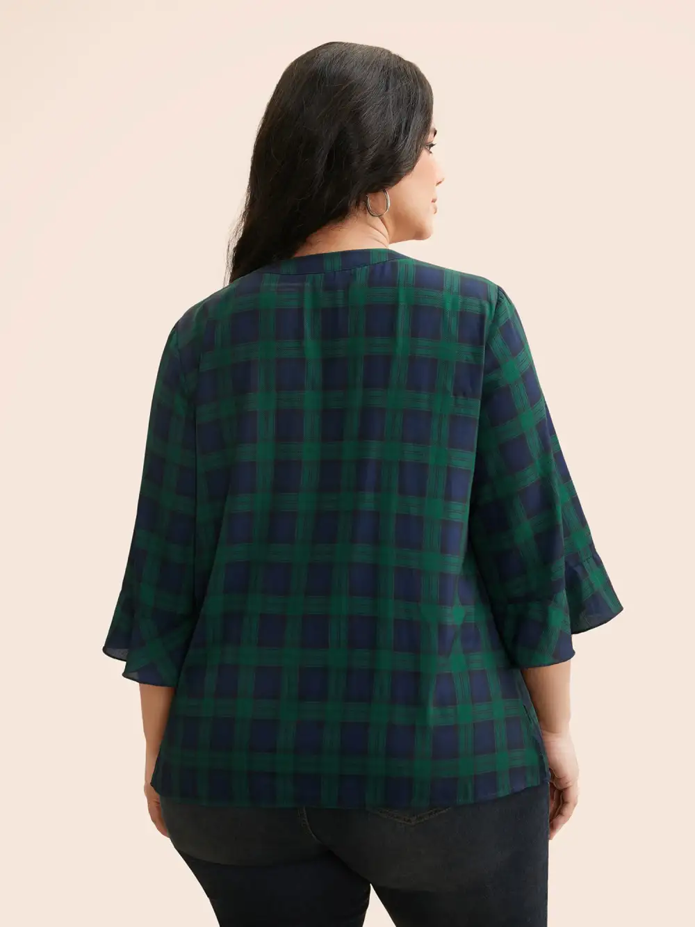 Notched Plaid Ruffles Pleated Blouse