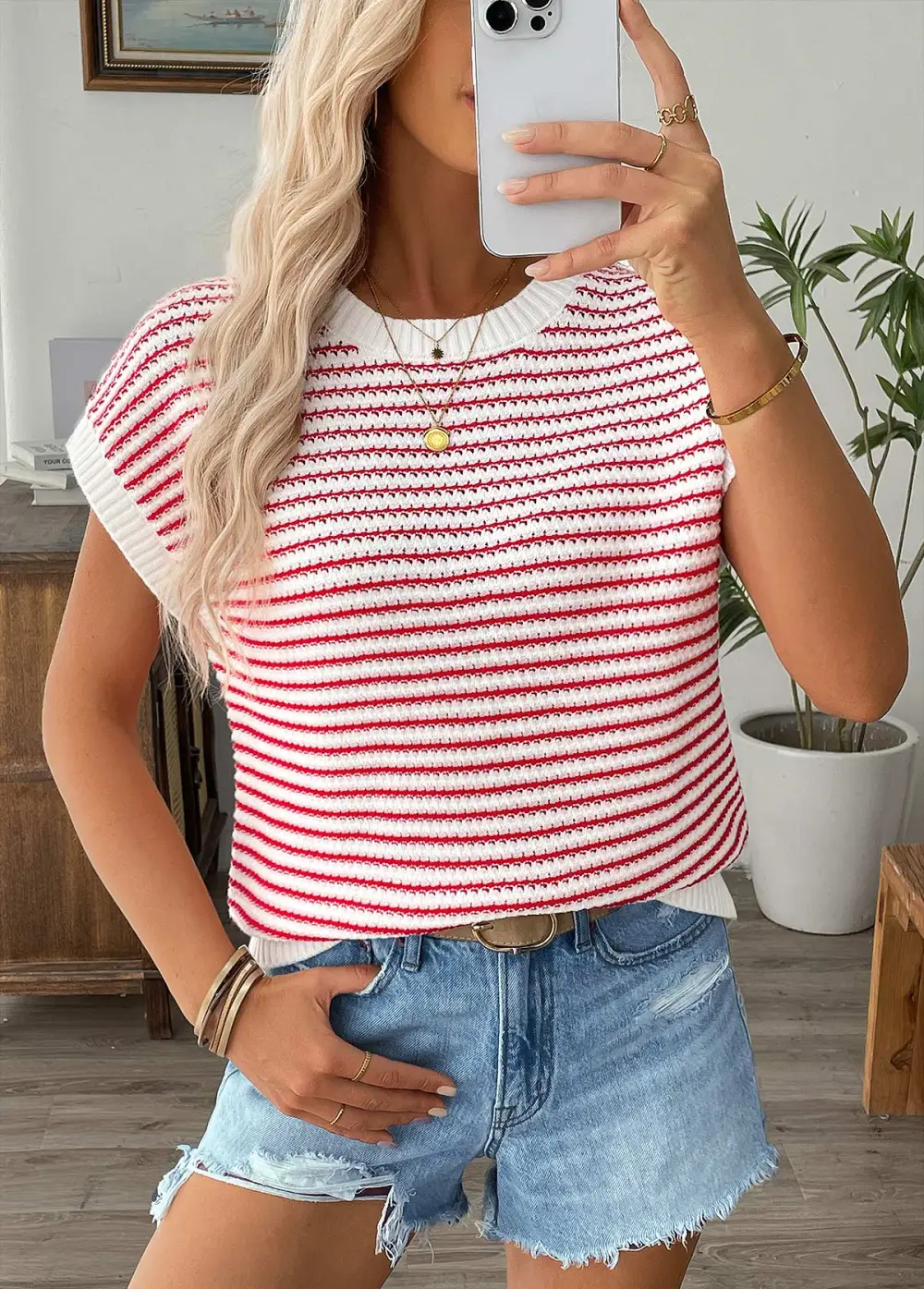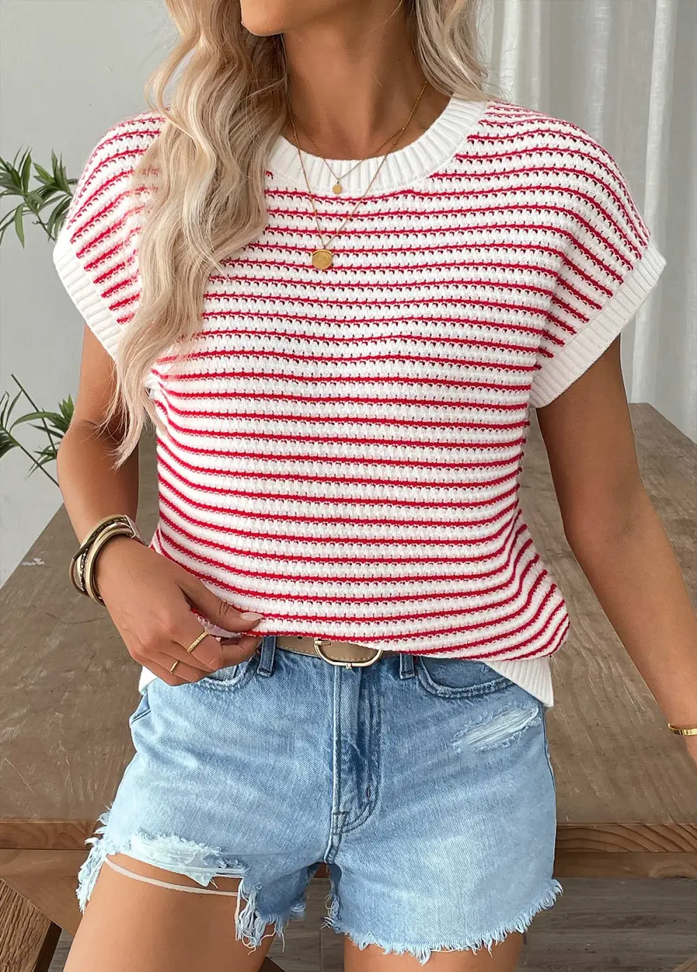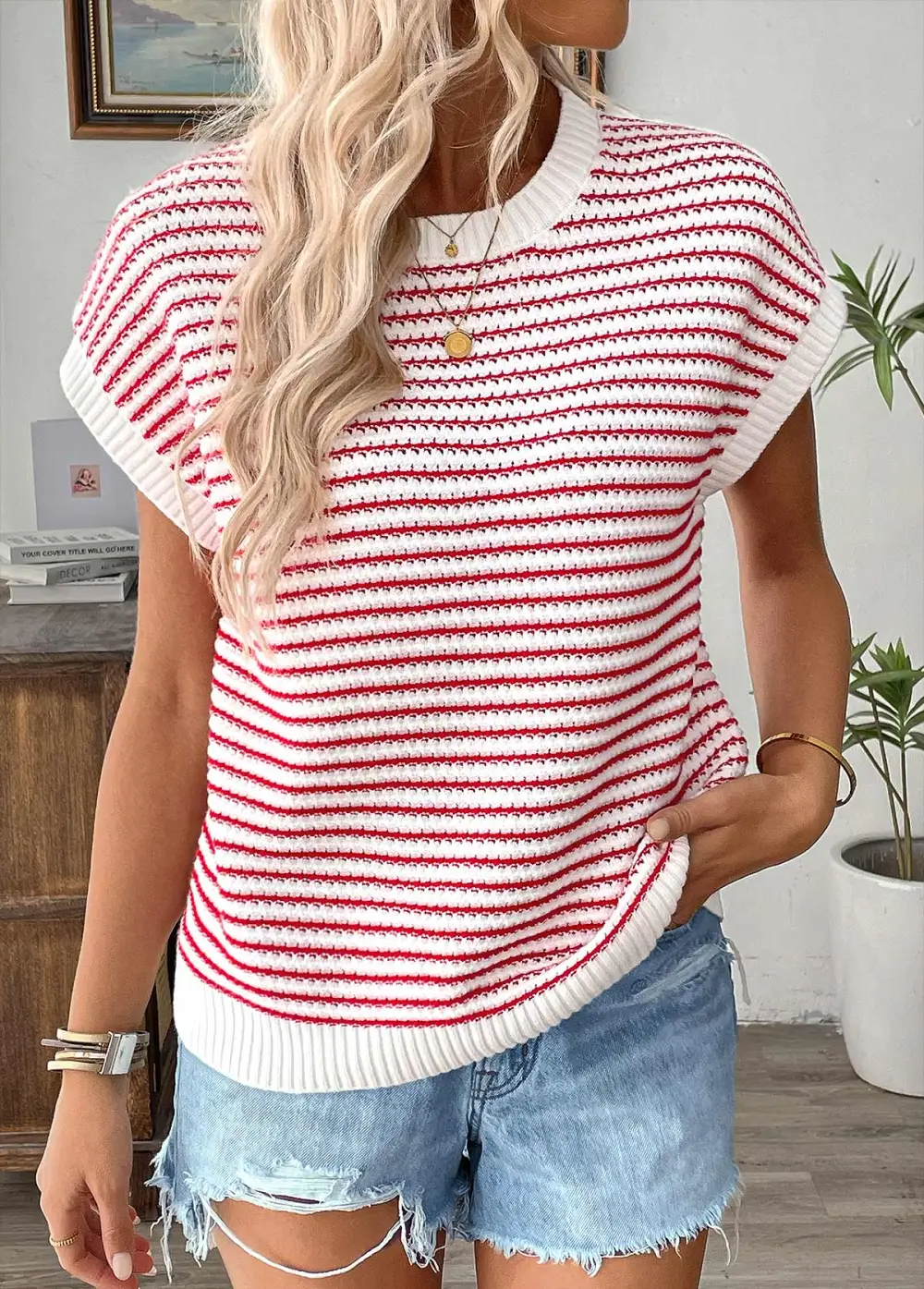 Light Pink Striped Short Sleeve Split Neck Blouse