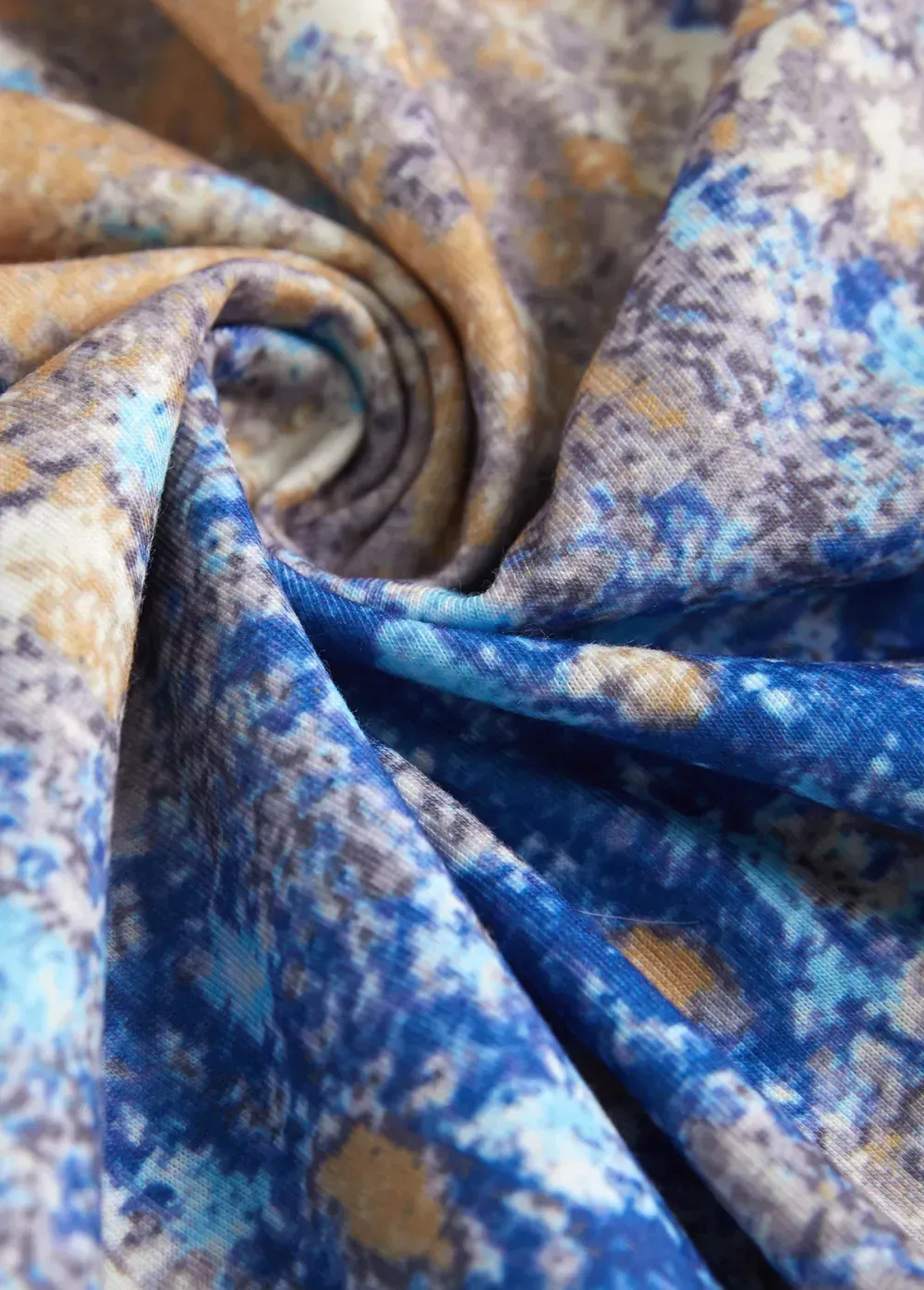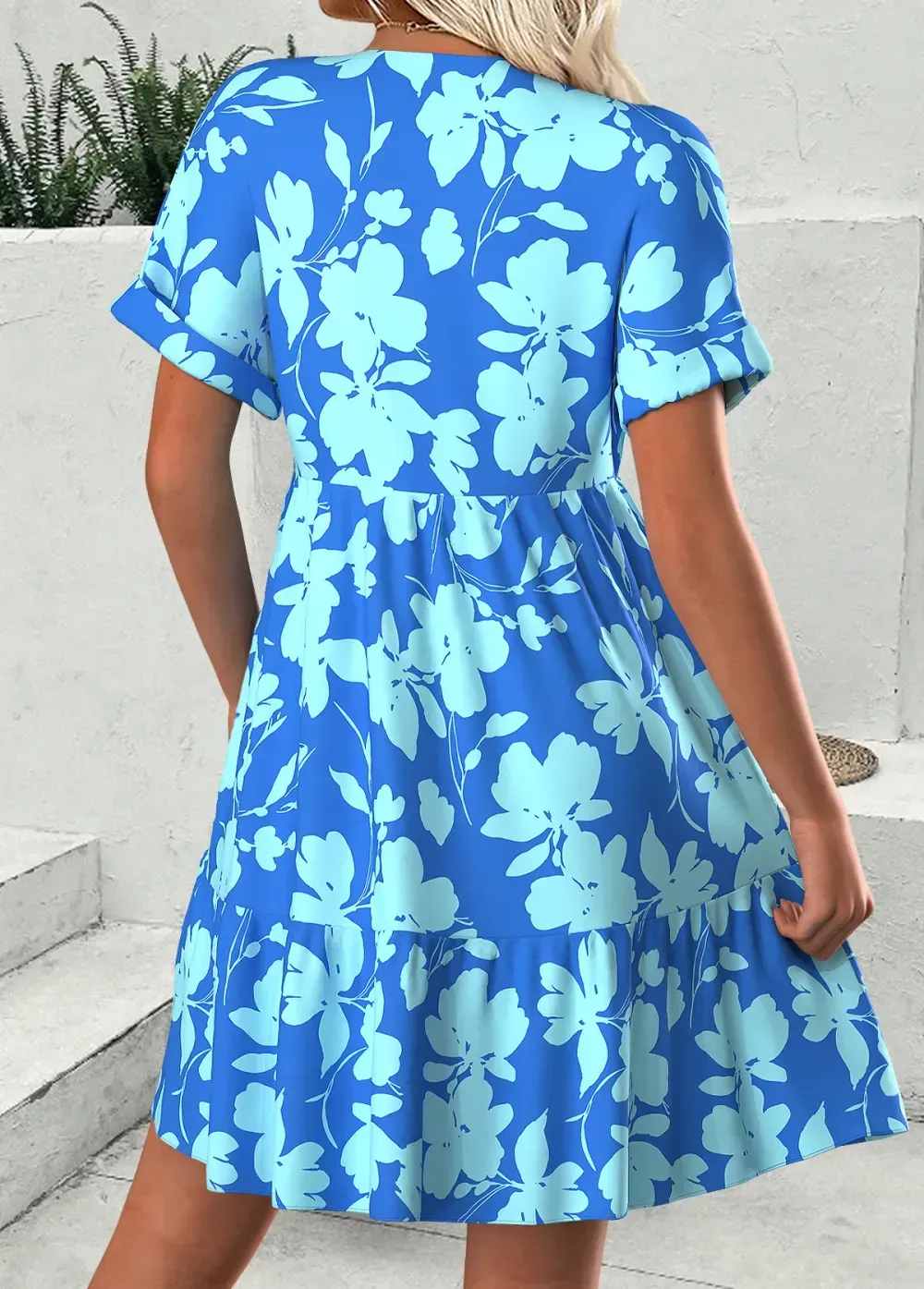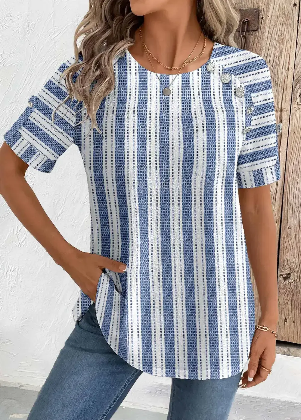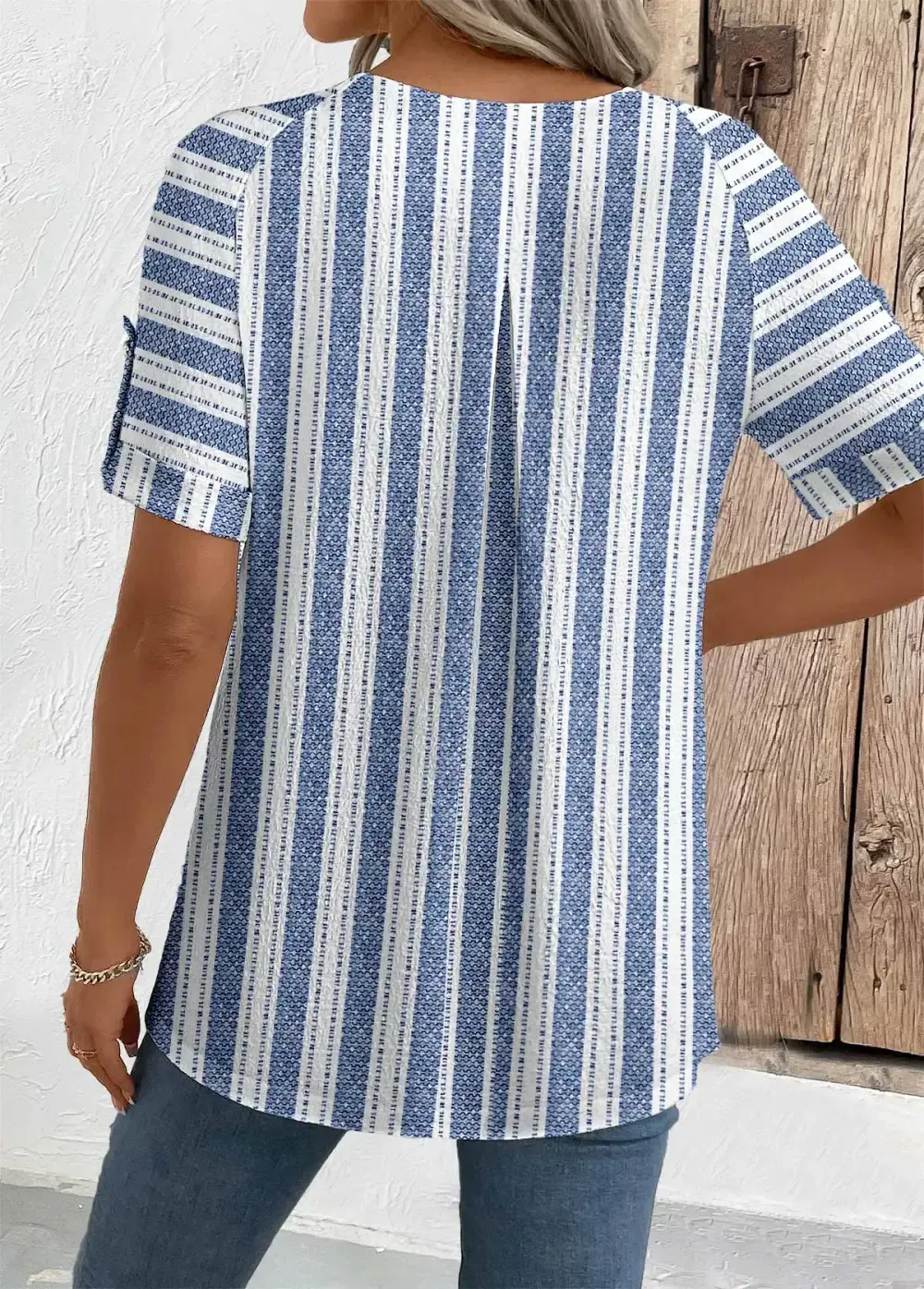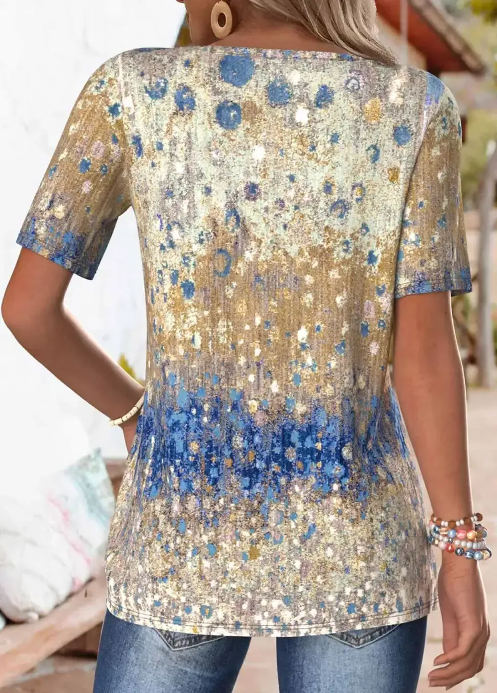 Blue Geometric Print Short Sleeve Round Neck Blouse