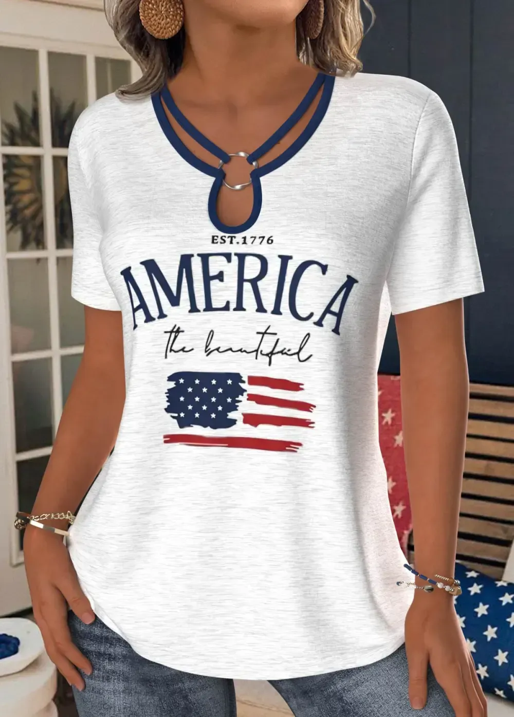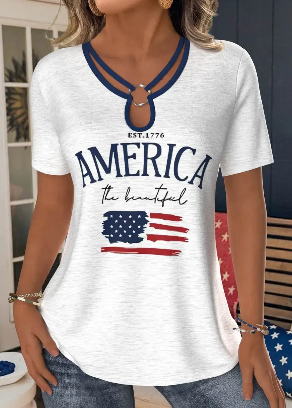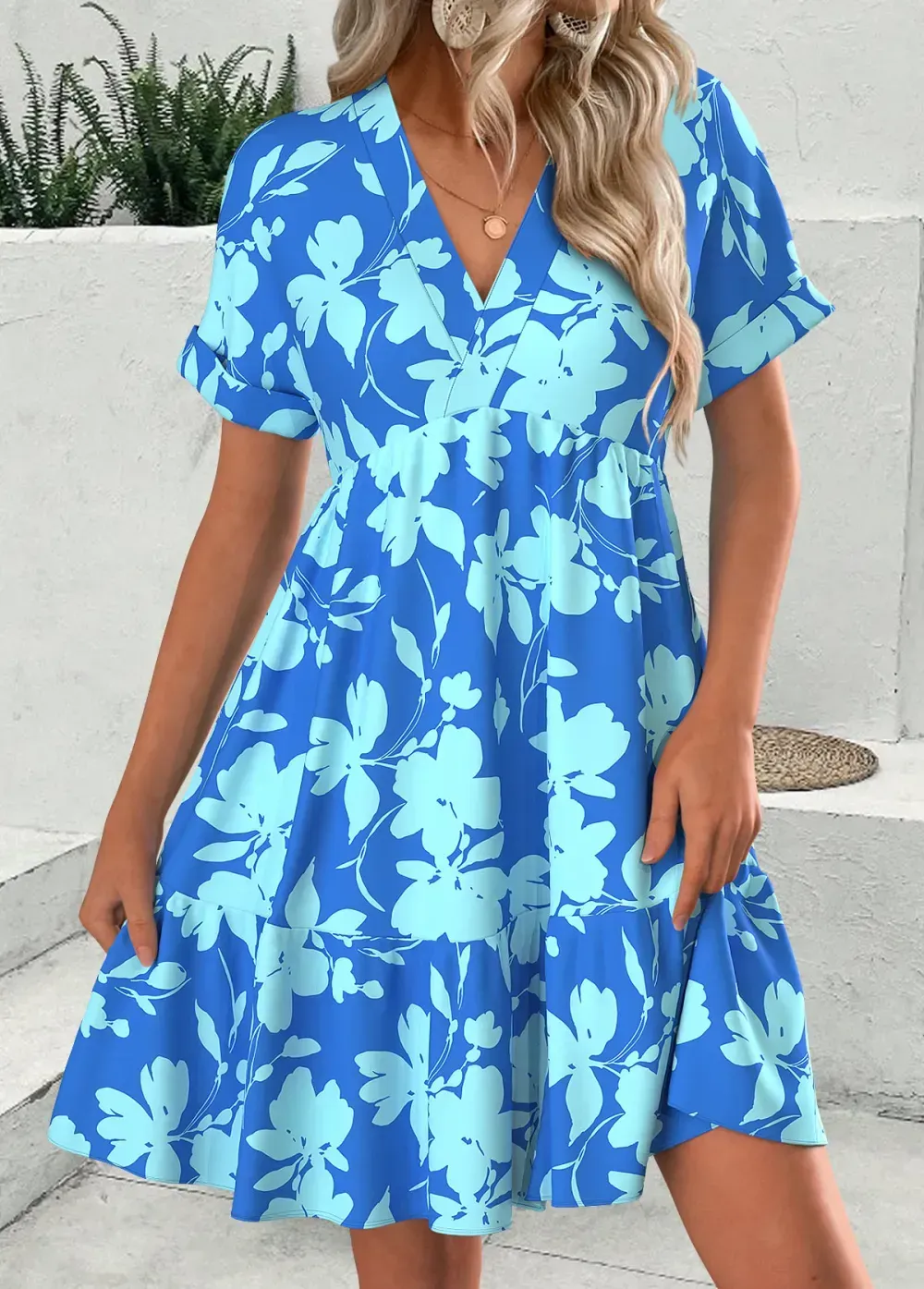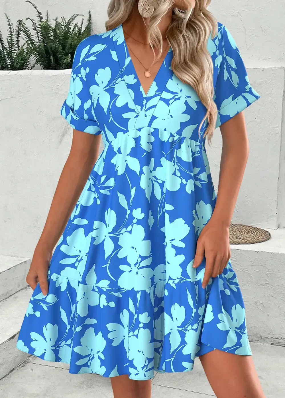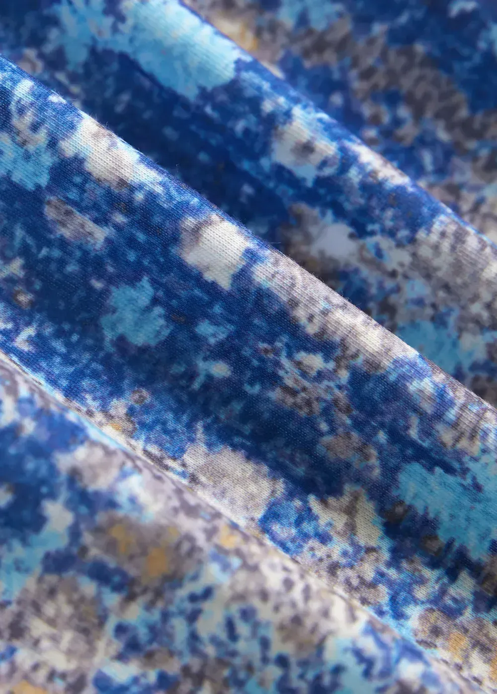 Blue Geometric Print Short Sleeve Round Neck Blouse