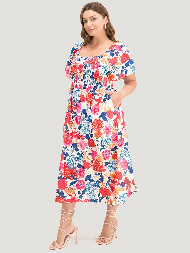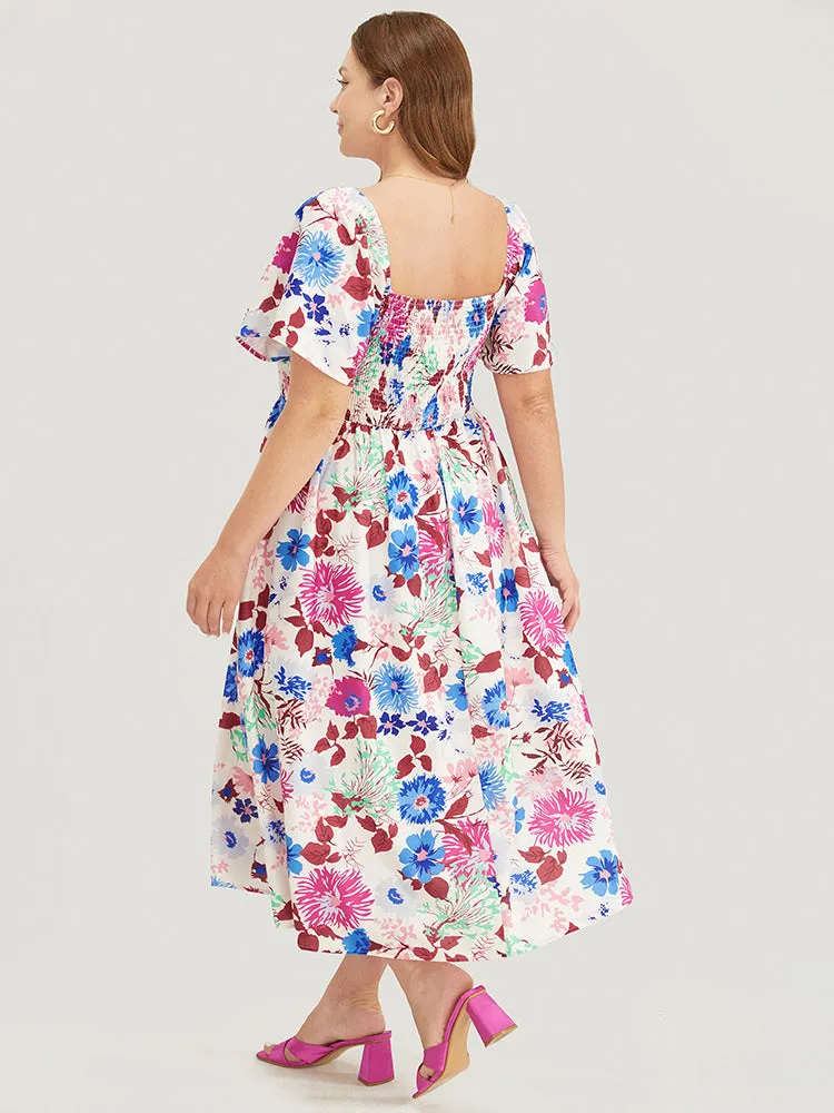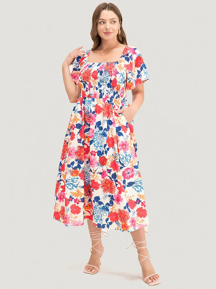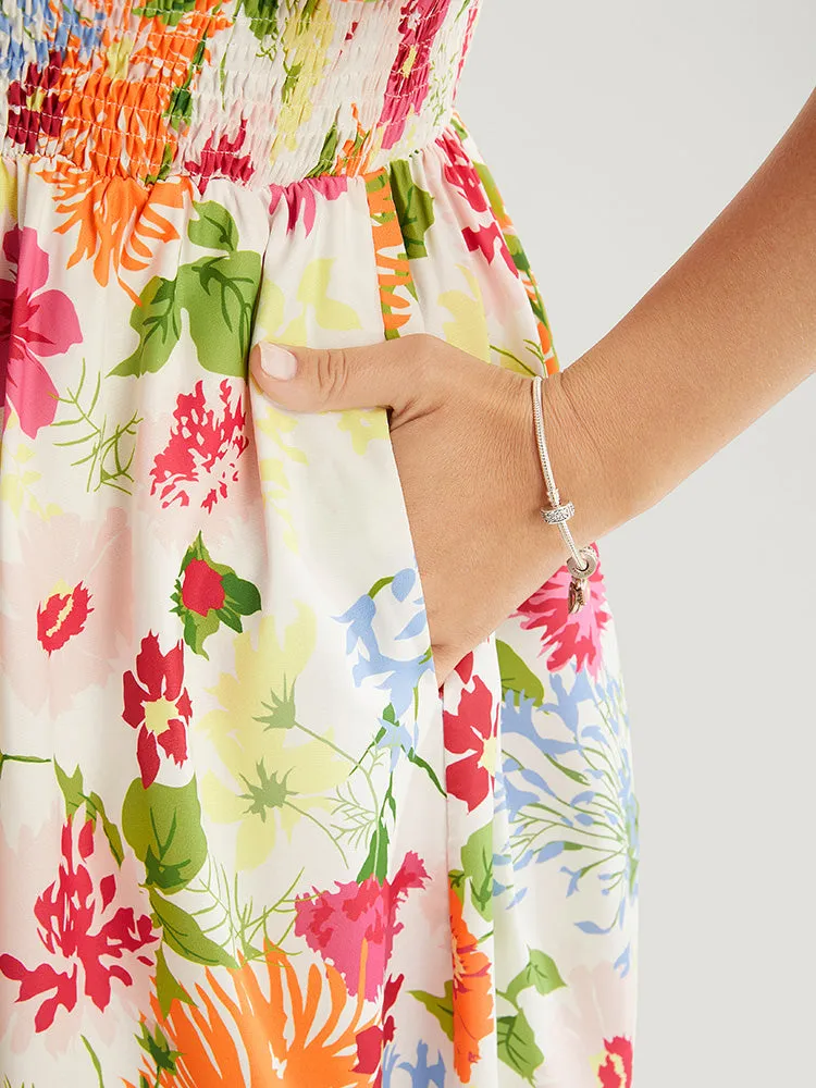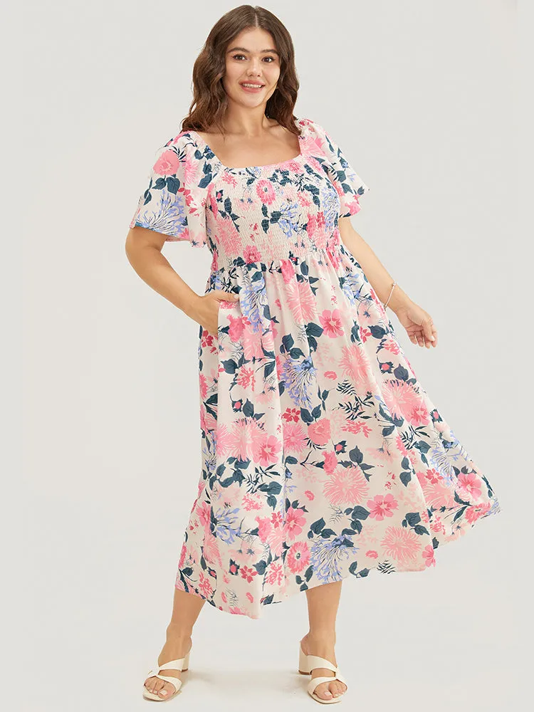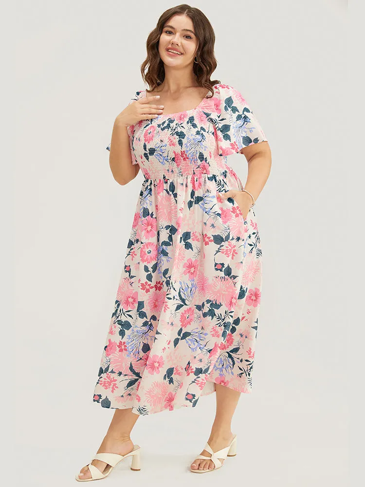 Floral Backless Shirred Square Neck Pocket Ruffle Hem Dress