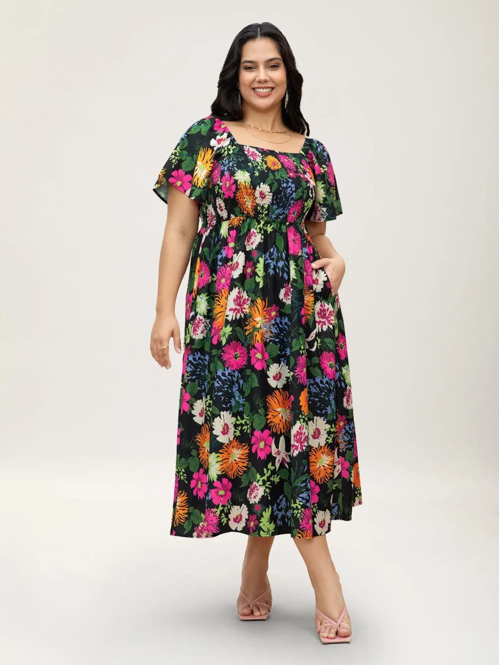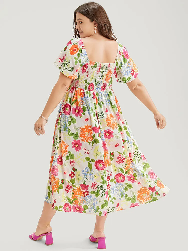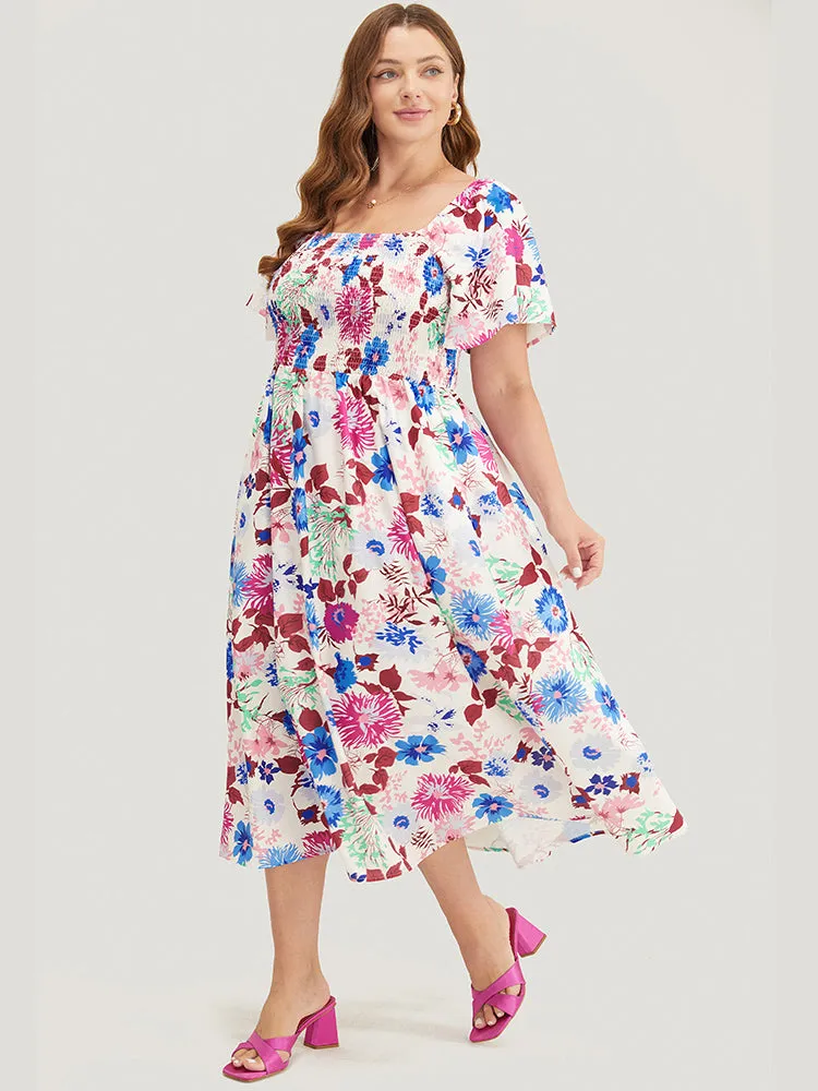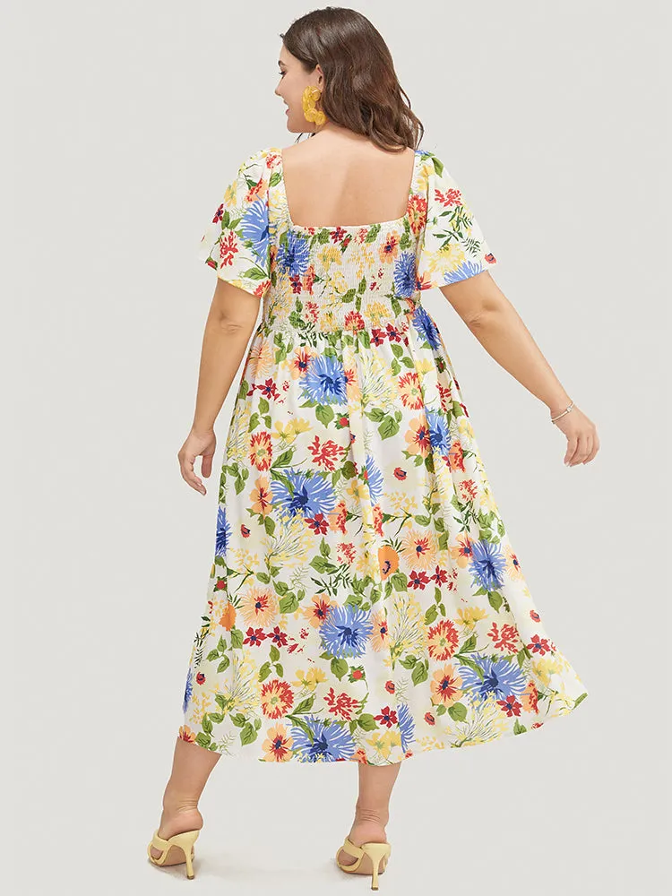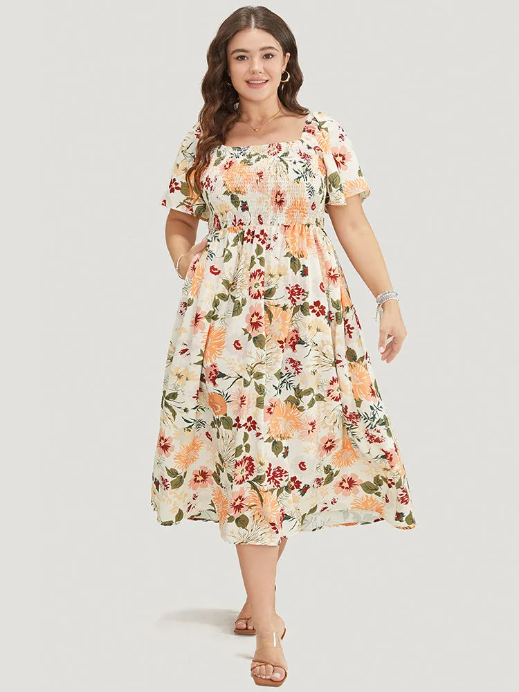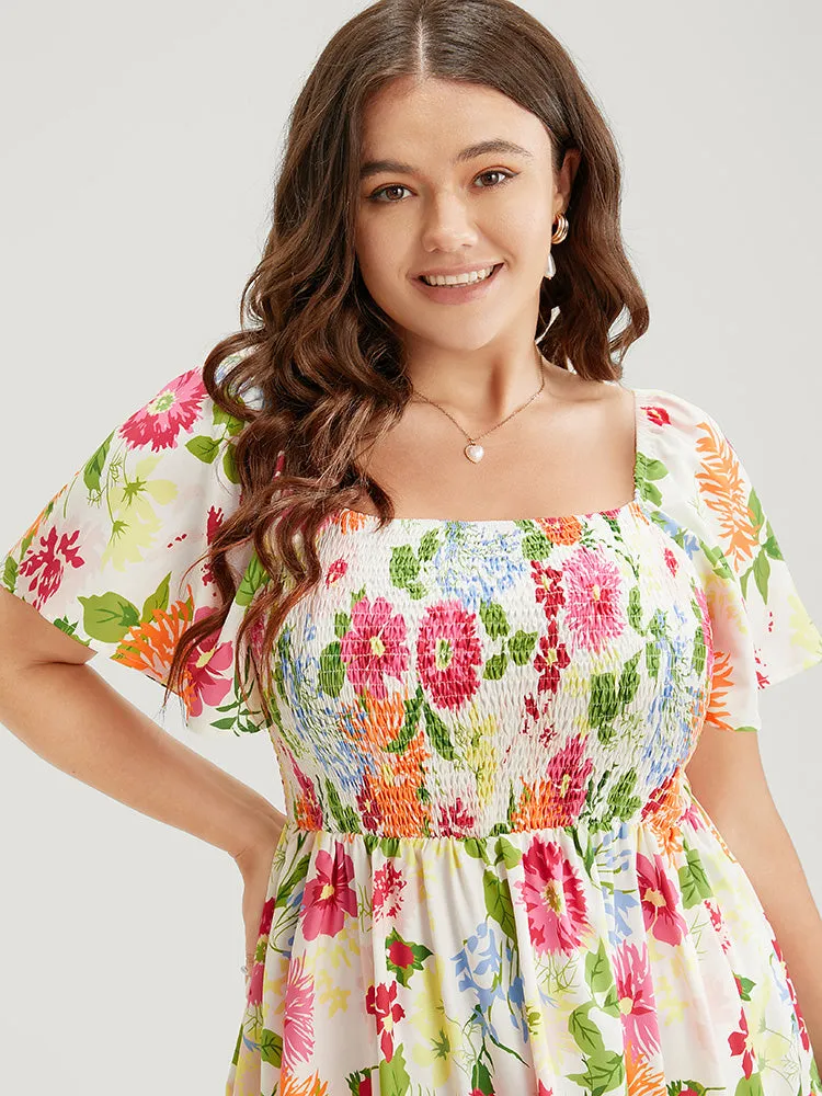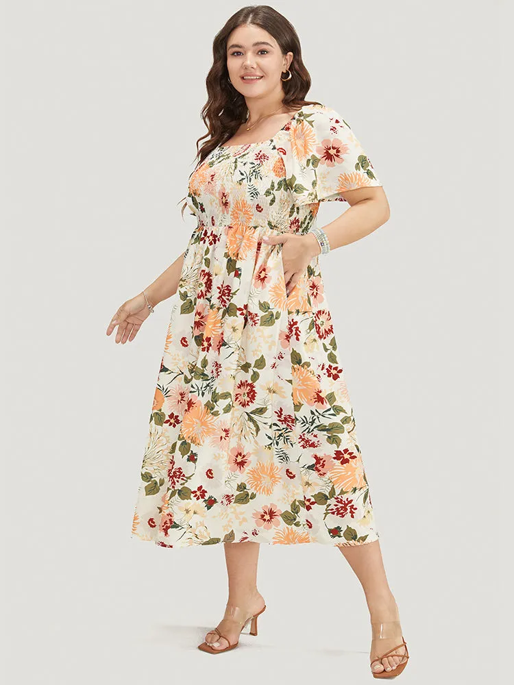 Floral Backless Shirred Square Neck Pocket Ruffle Hem Dress
