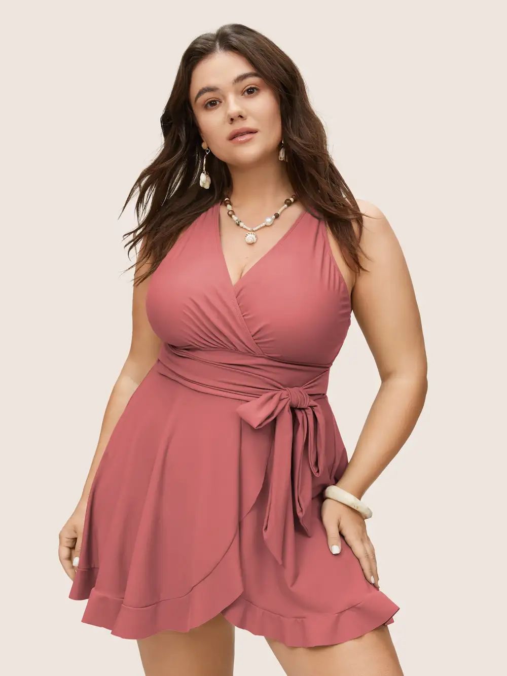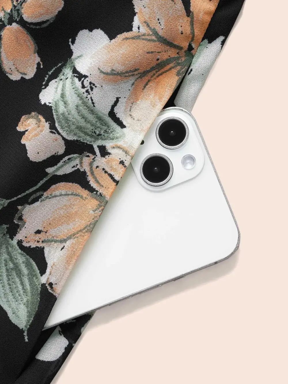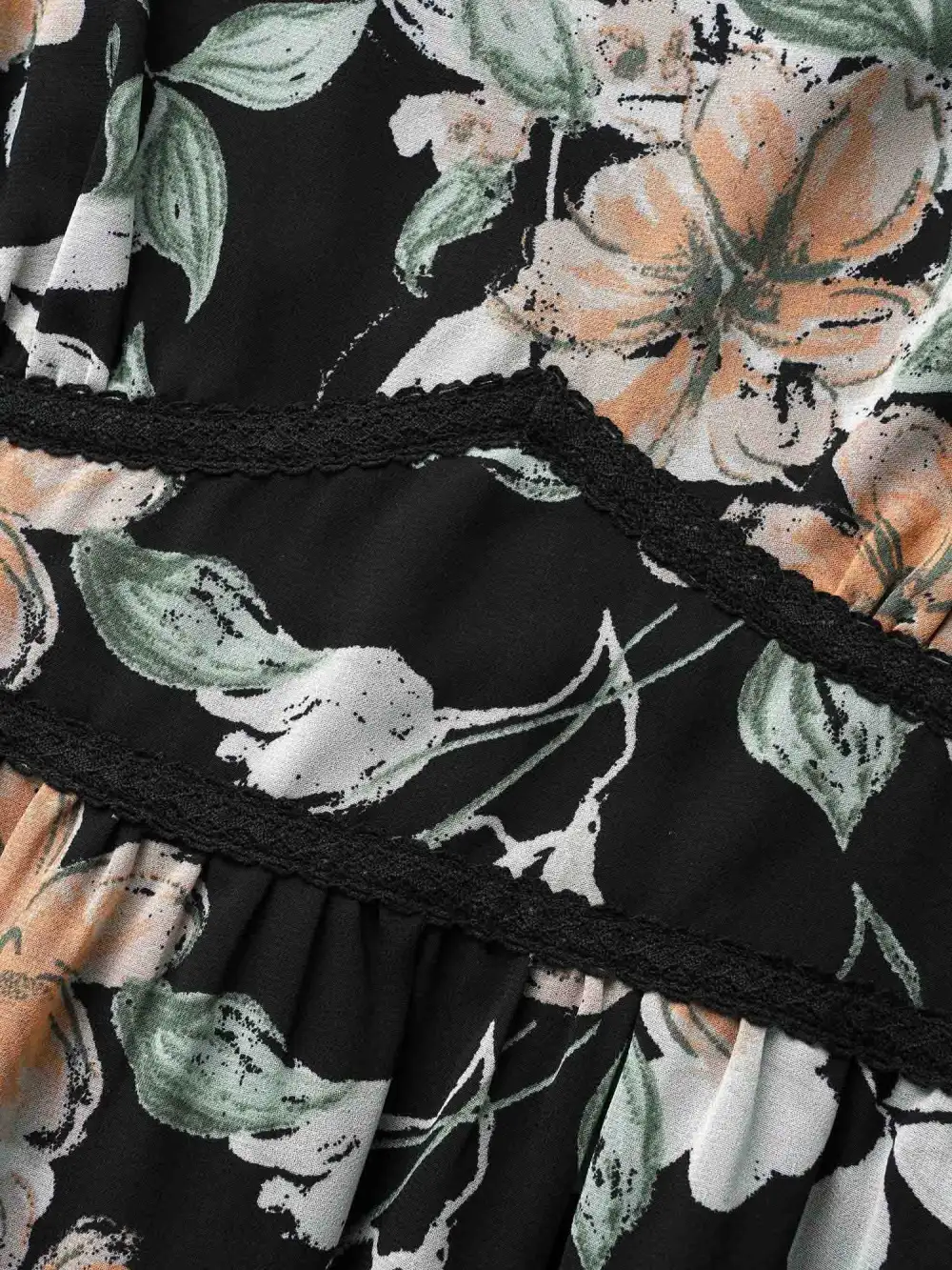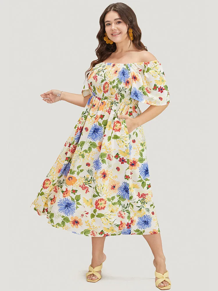 Floral Backless Shirred Square Neck Pocket Ruffle Hem Dress