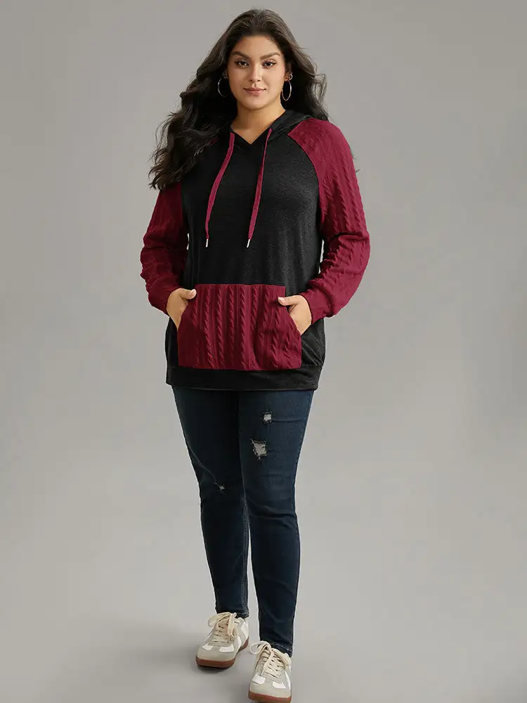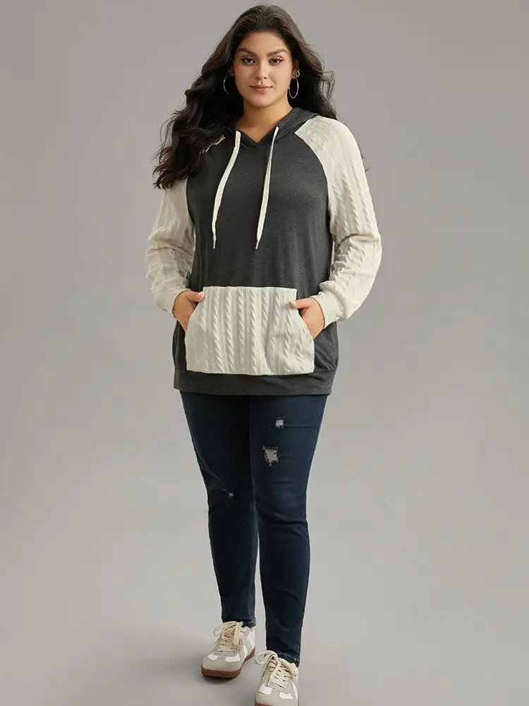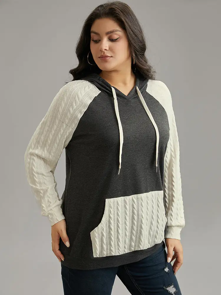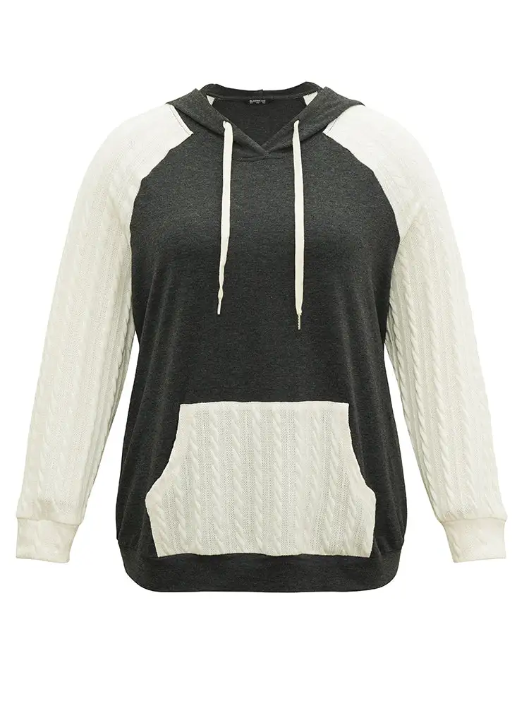 Contrast Cable Knit Pocket Hooded Drawstring Sweatshirt