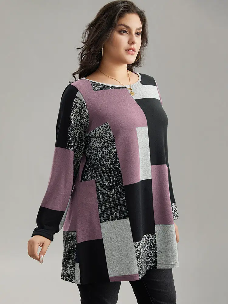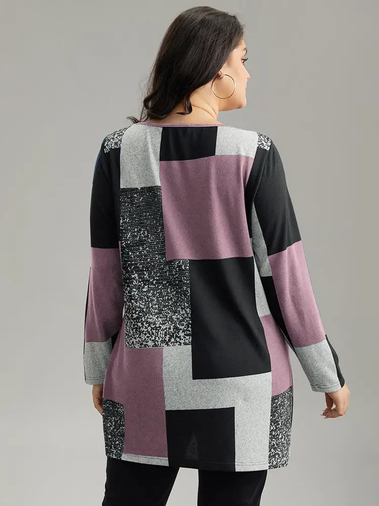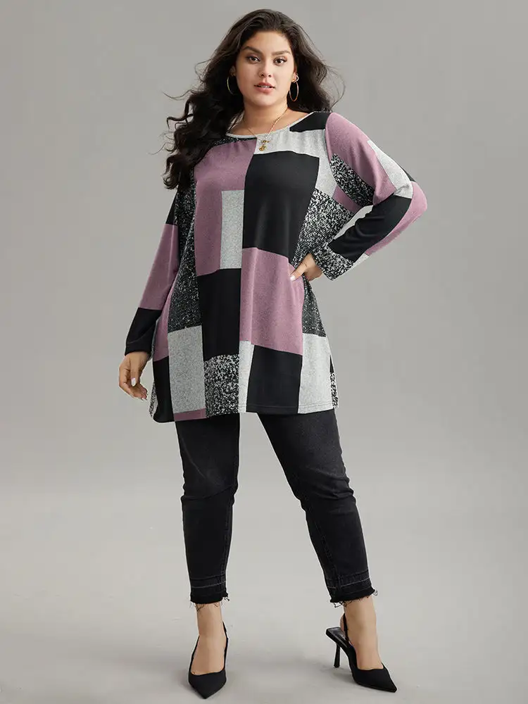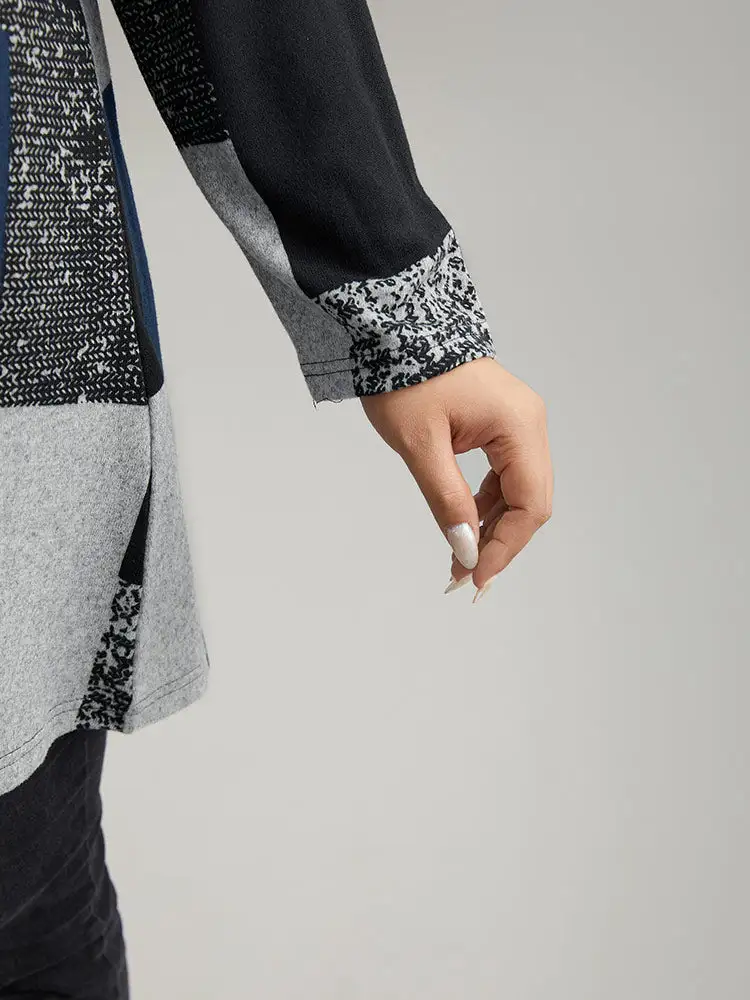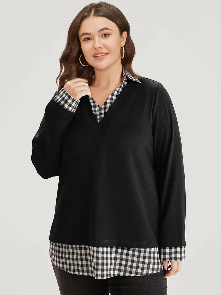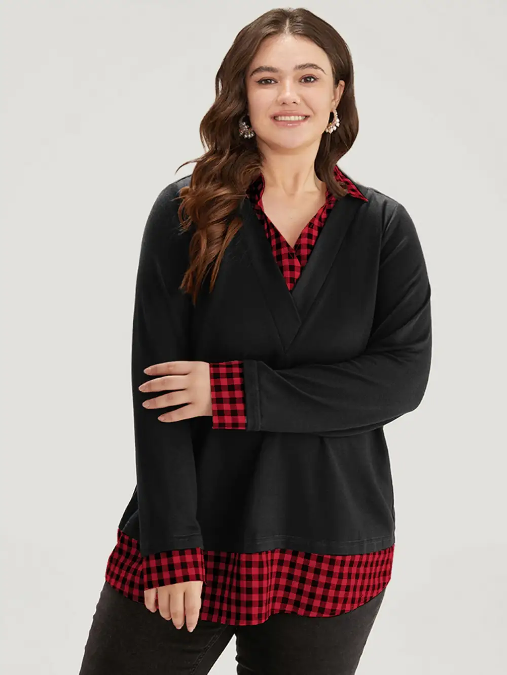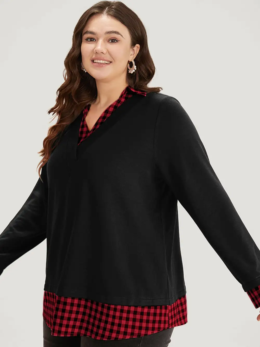 Gingham Patchwork Shirt Collar Arc Hem Sweatshirt